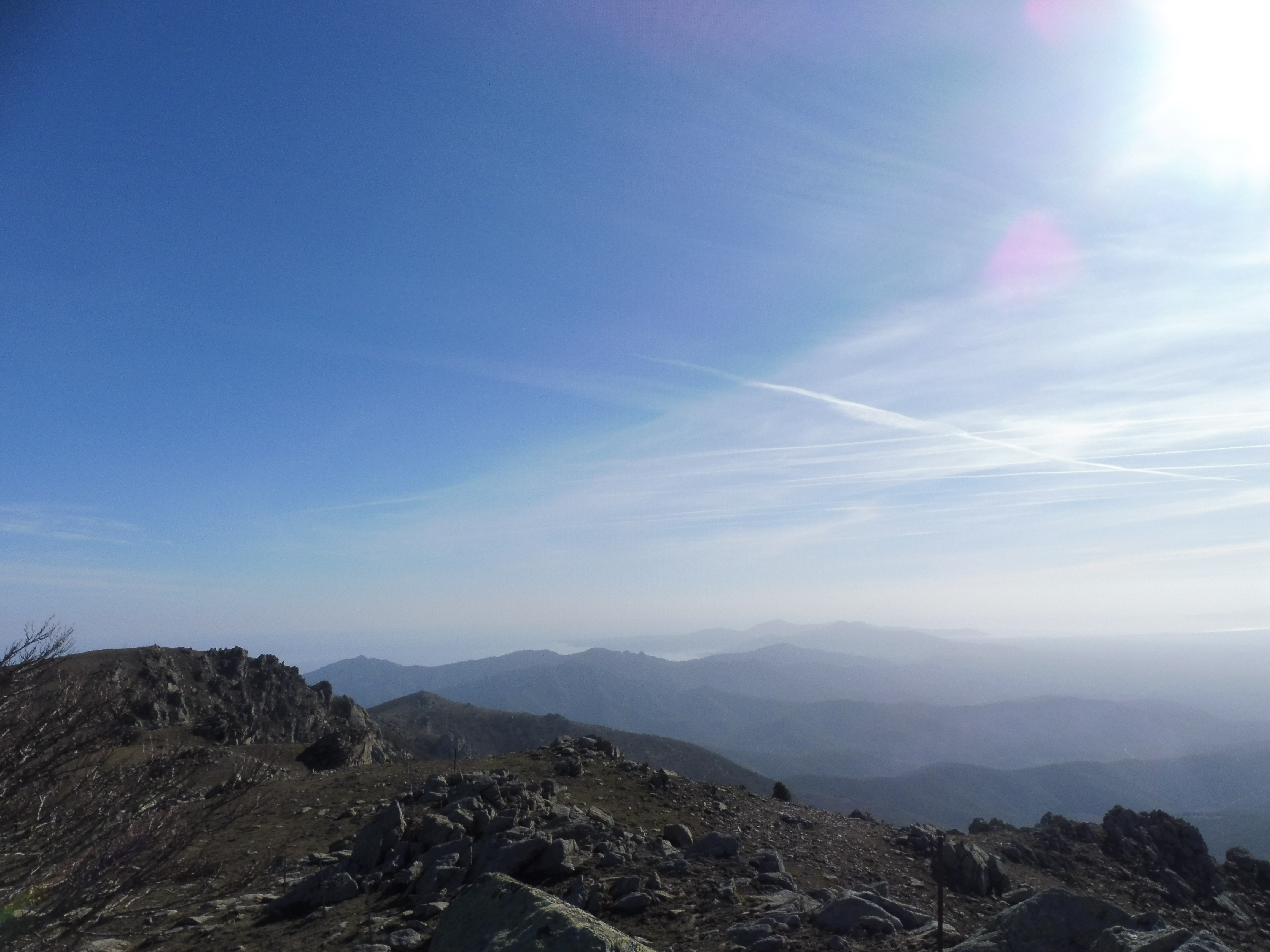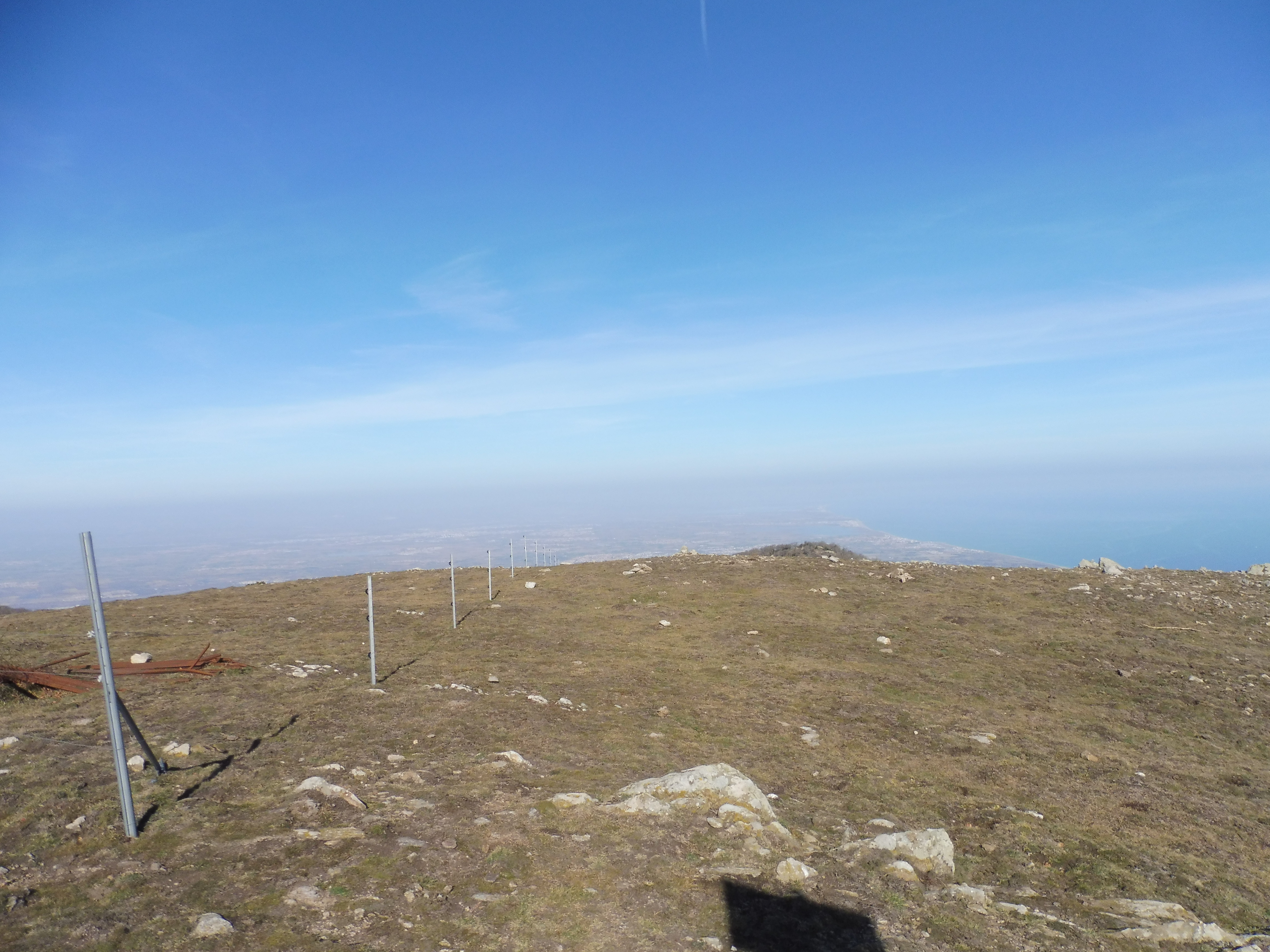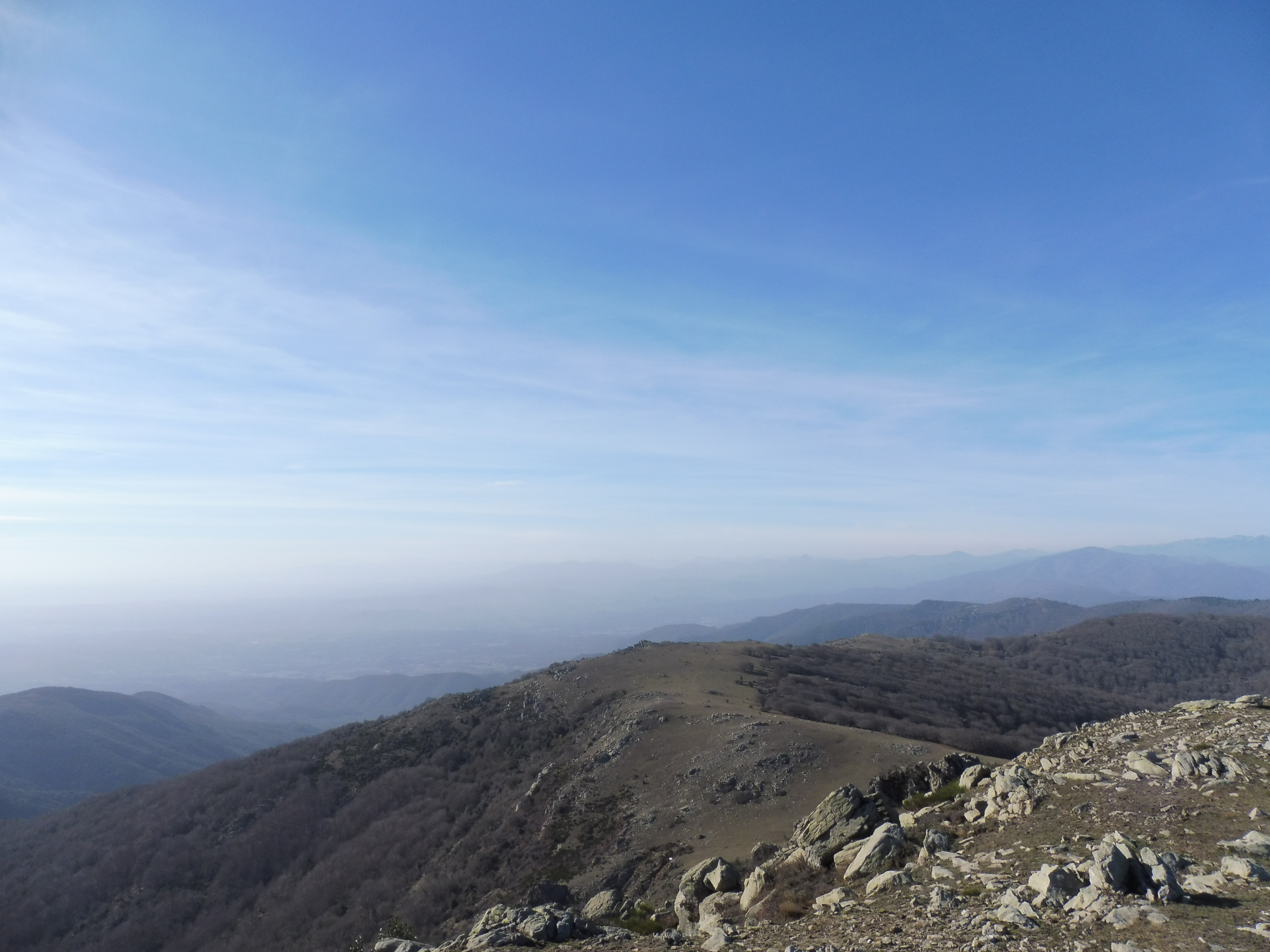 Arrivée au sommet du Puig de les Basses (1073 m) : beau panorama malgré la présence de brume sur les sommets de l'Empordà, de la Garrotxa, du Vallespir, des Albères, du Parc Natural de Cap de Creus ainsi que sur la plaine du Roussillon et de l'Empordà