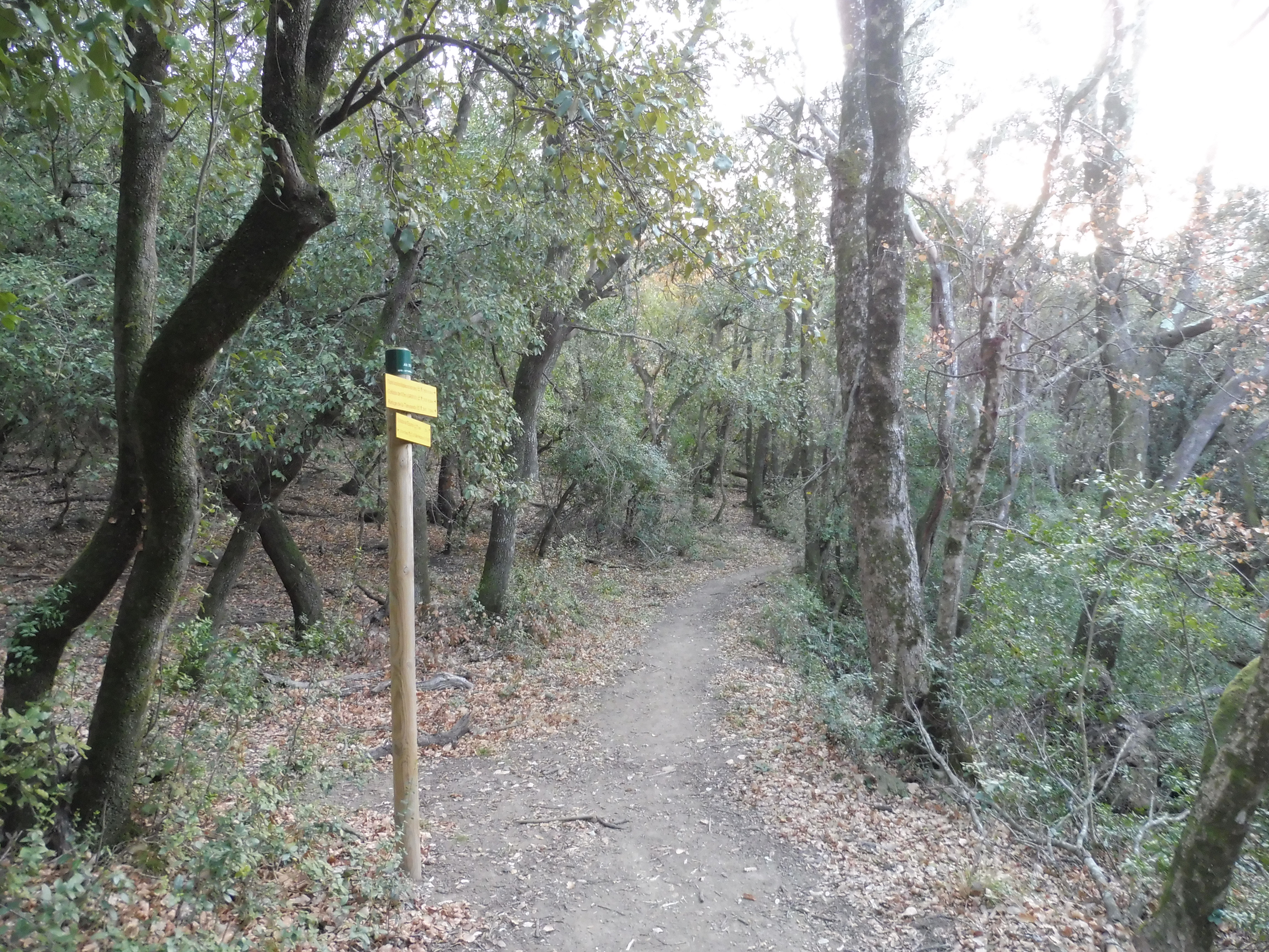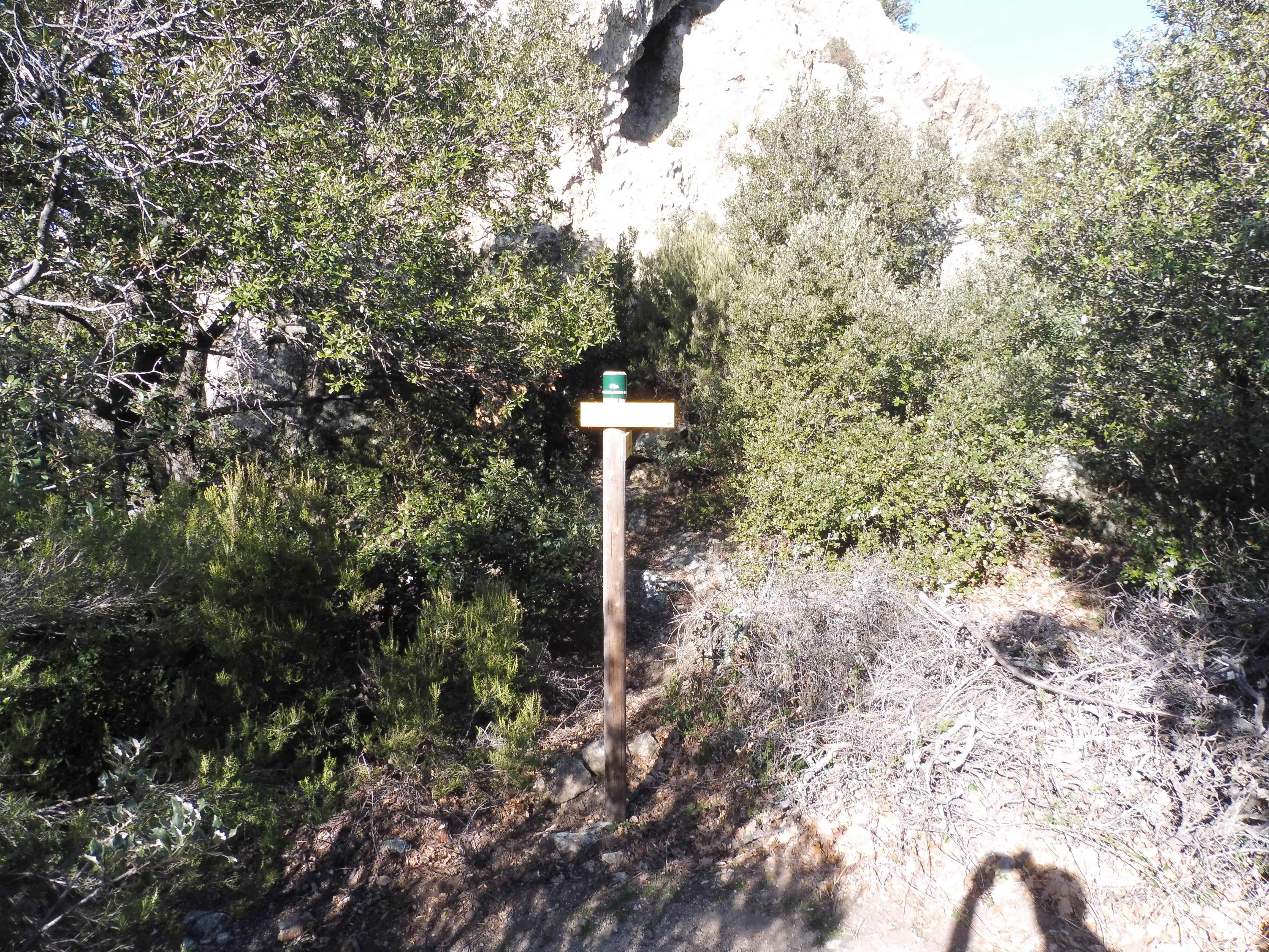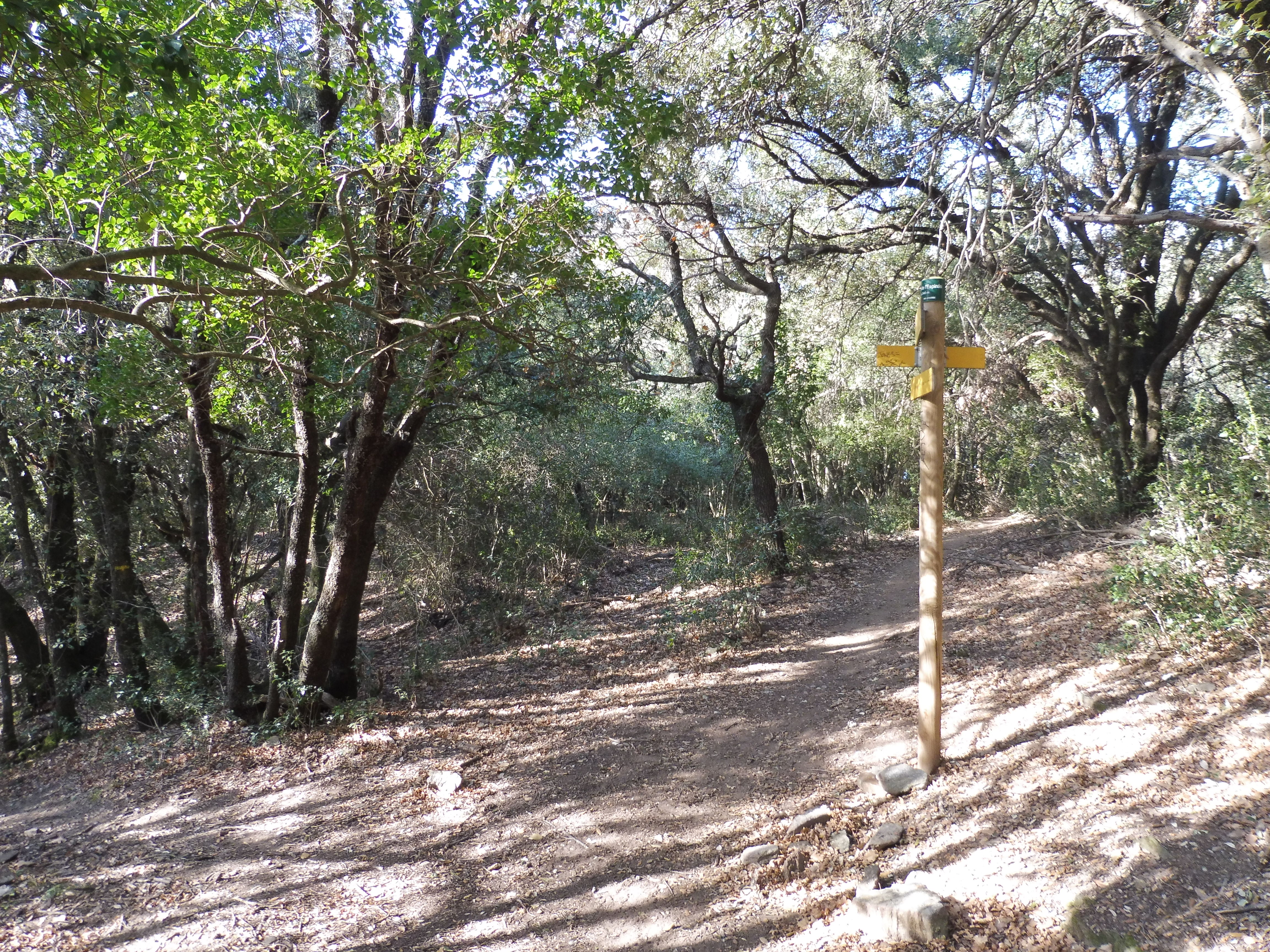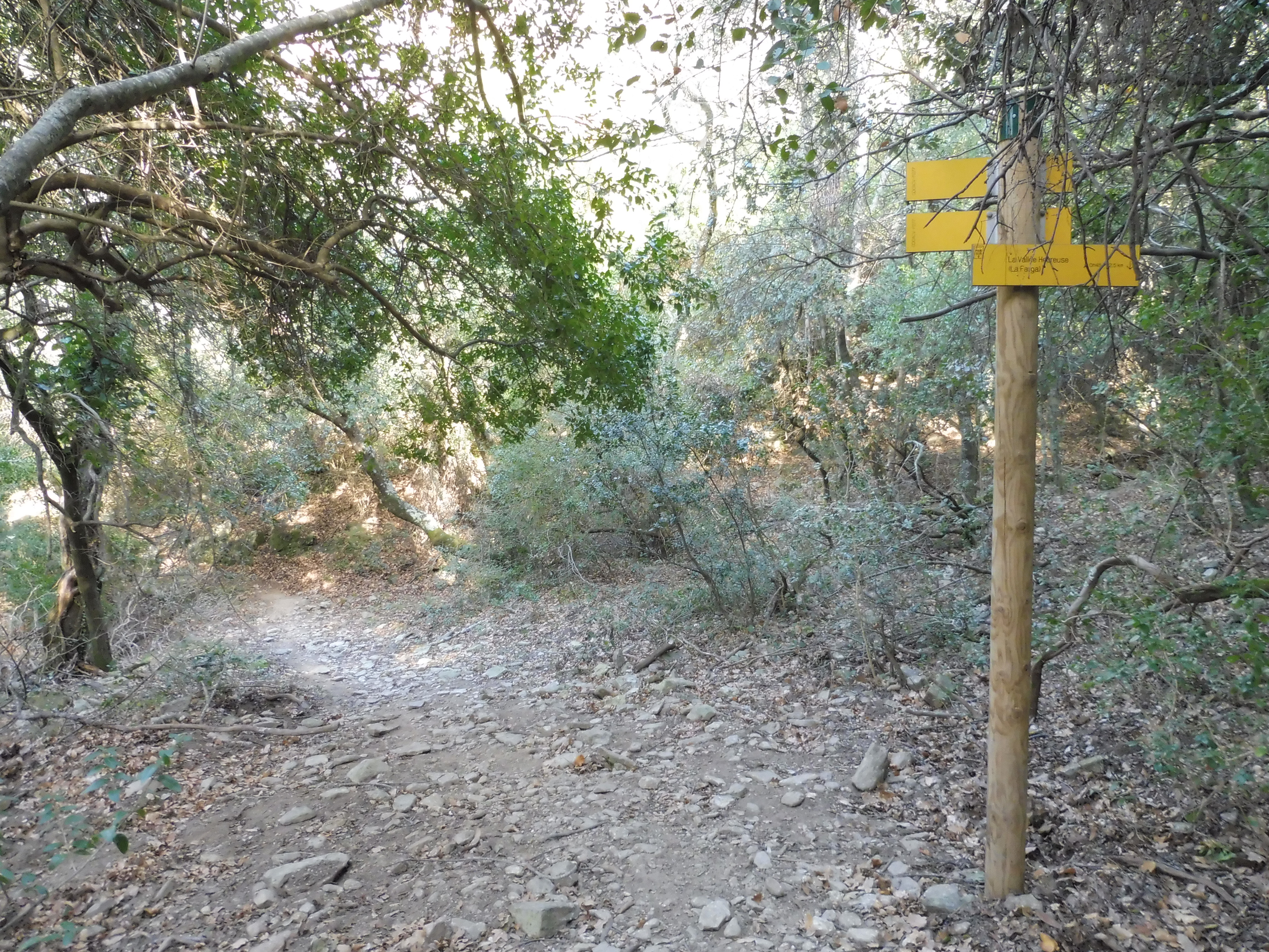 Collada de l'Espinàs (346 m) : suivre le chemin partant tout droit direction la Farga (la Vallée Heureuse), balisé en jaune