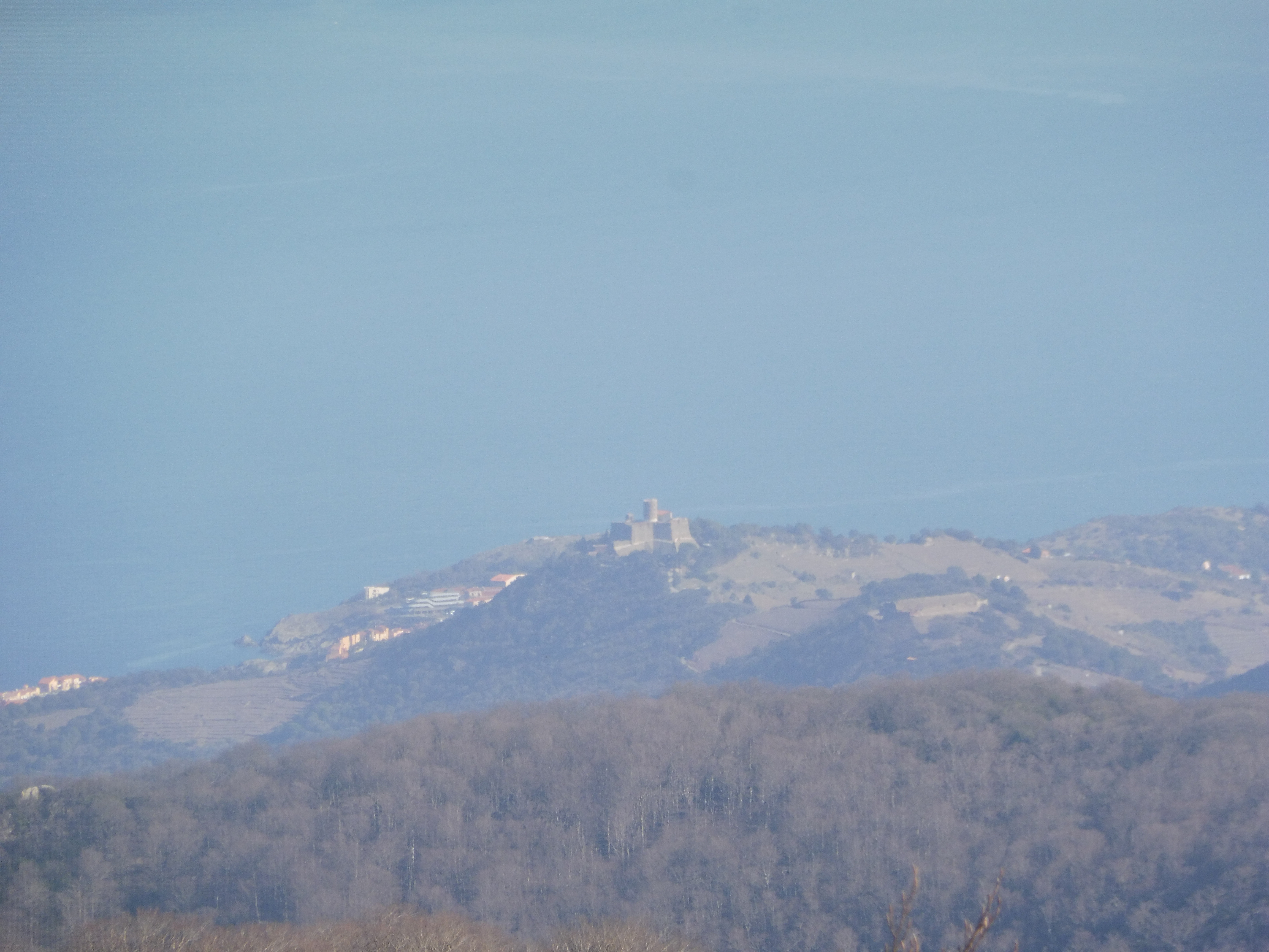 Zoom sur le Fort Béar (207 m) à gauche et la Torre de Madeloc (656 m) à droite