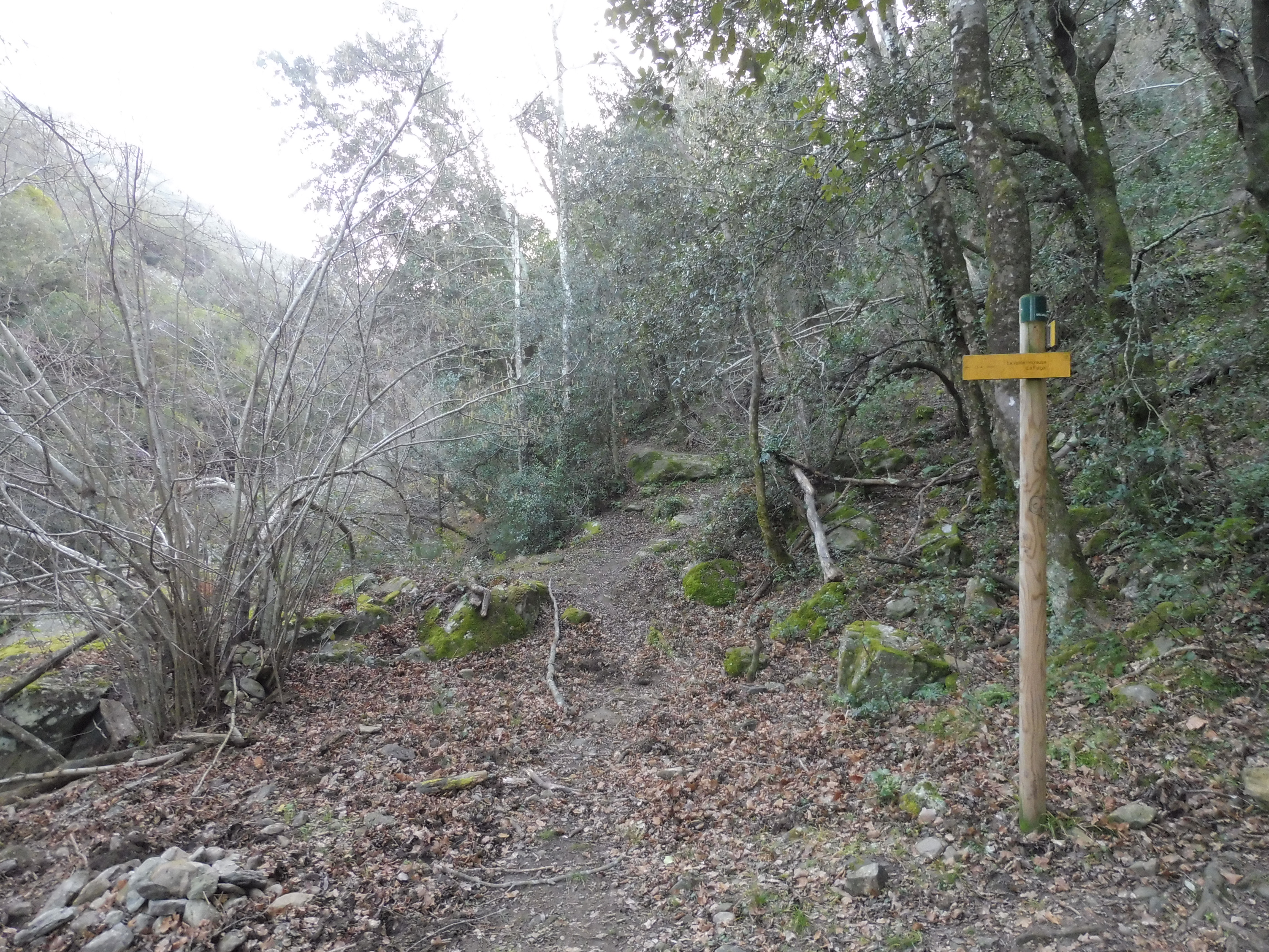 A ce croisement marqué par la présence d'un panneau directionnel (500 mètres après le lieu-dit "Font dels Miracles"), suivre le chemin partant légèrement sur la droite direction la Farga (la Vallée Heureuse), balisé en jaune
