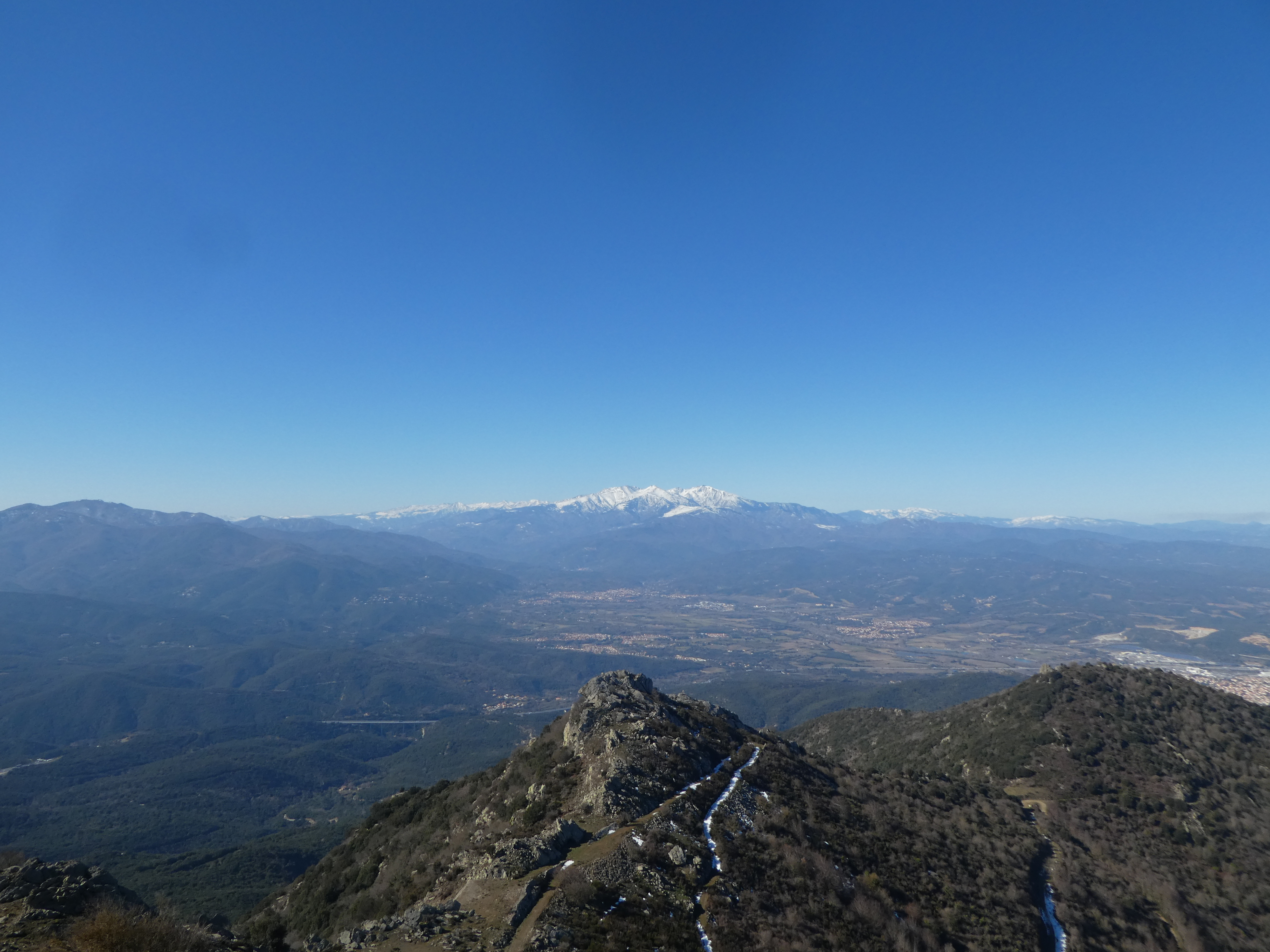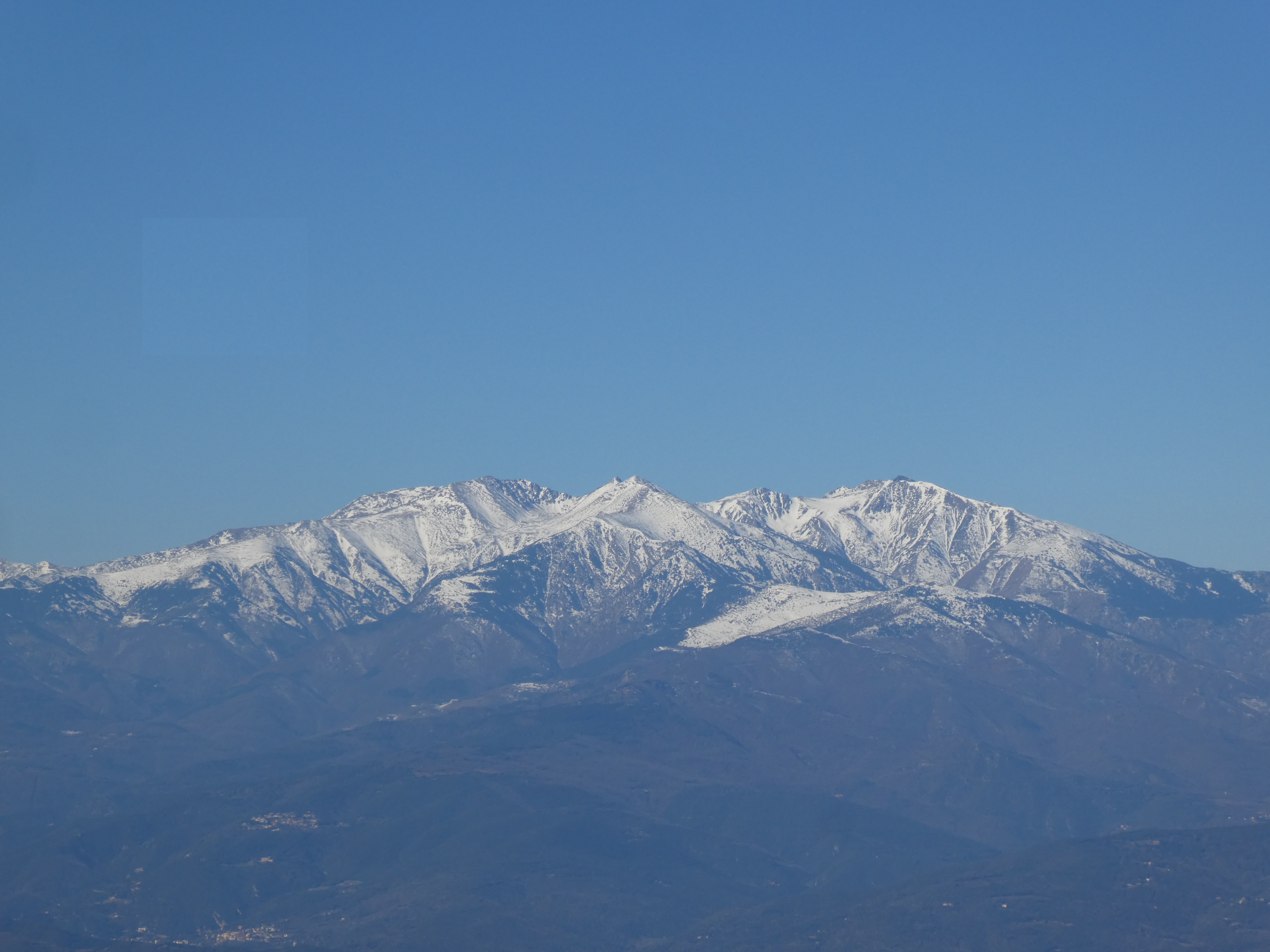 Zoom sur le massif du Canigou avec le Puig Roja (2724 m) et le Puig dels Tres Vents (2731 m) au centre-gauche, le Puig del Roc Negre (2714 m) au centre, et le Puig Sec (2665 m) et la Crête du Barbet (2712 m) au centre-droit