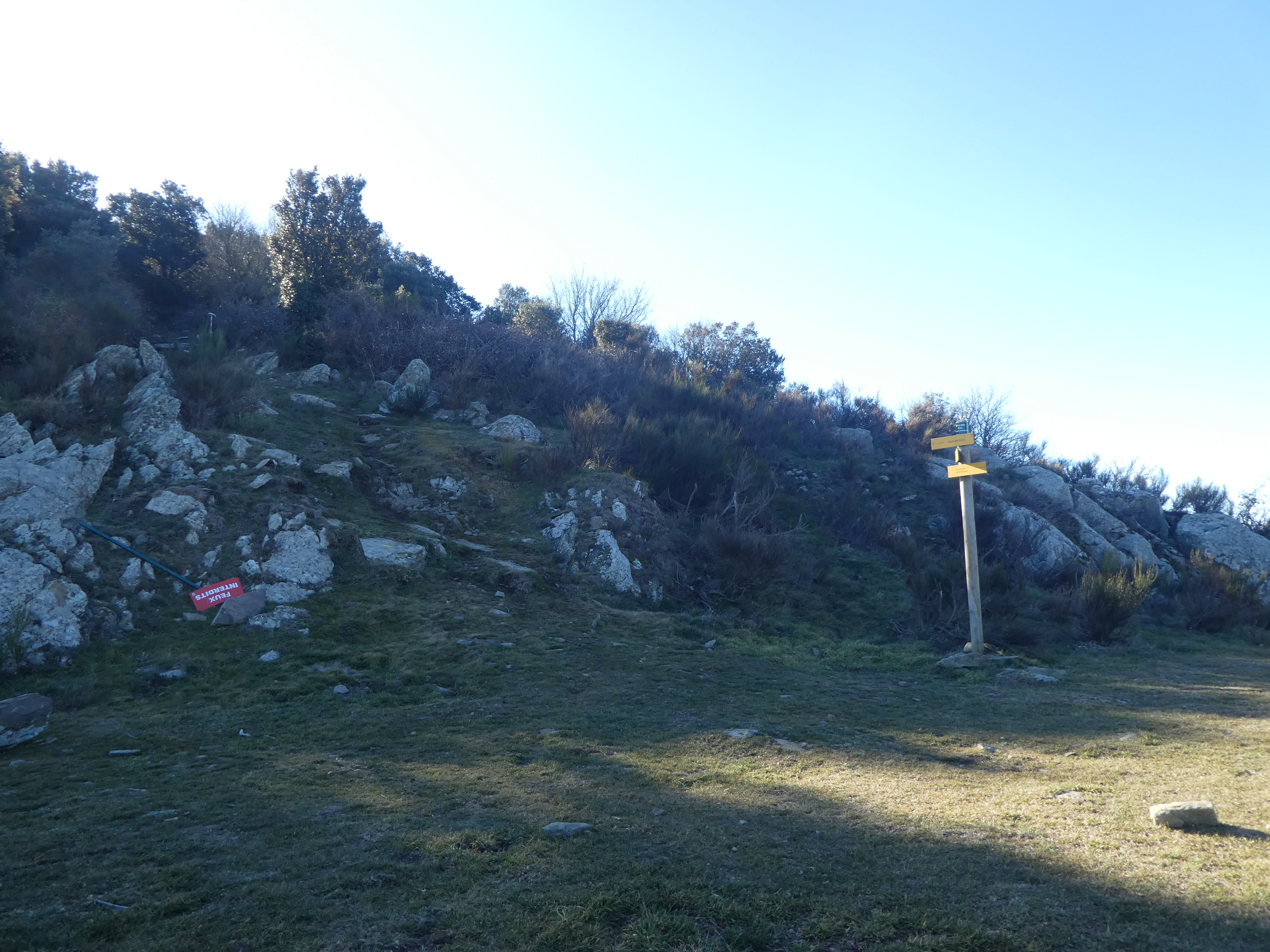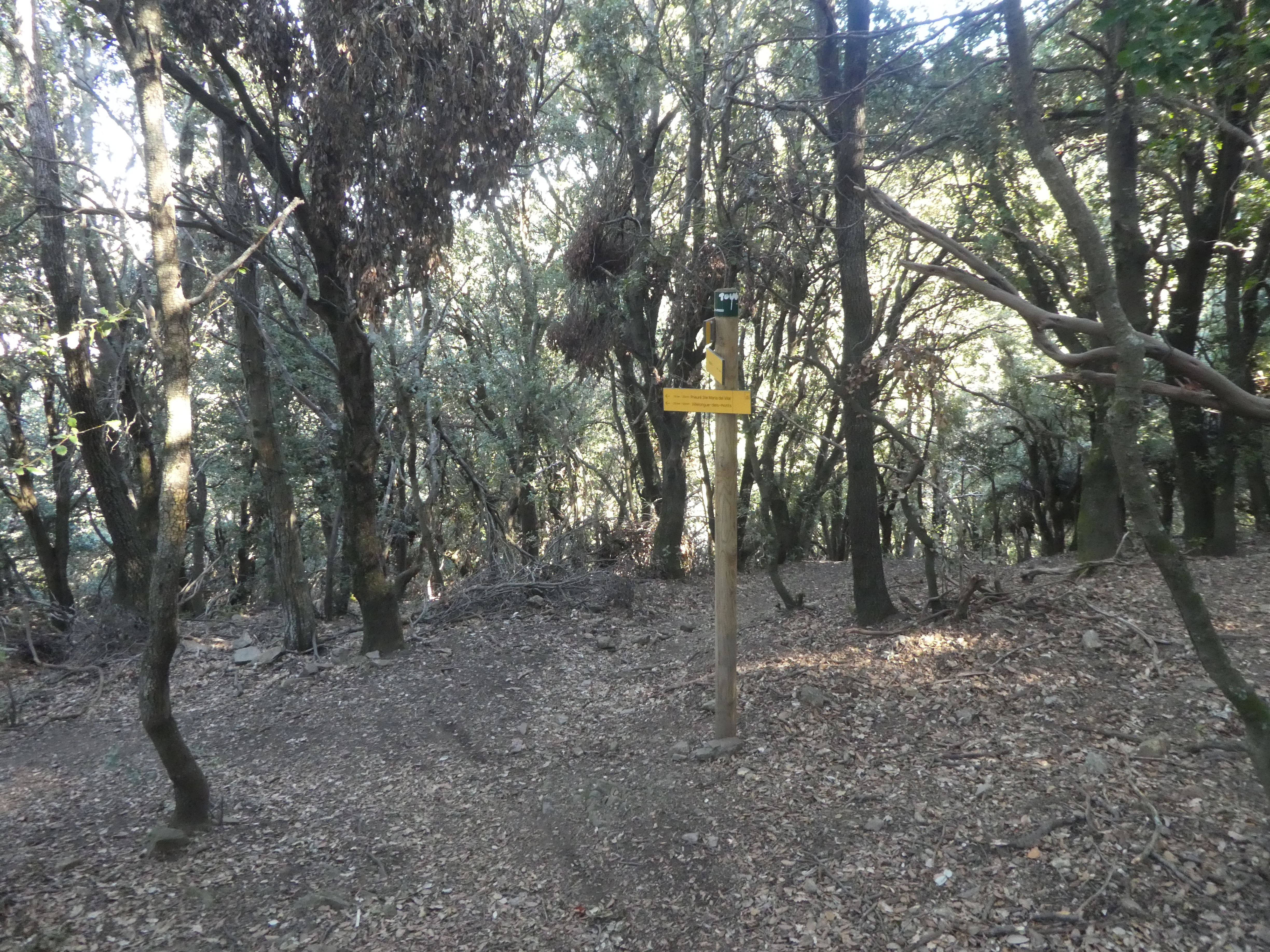 A ce croisement avec le sentier montant directement de Montesquieu-des-Albères marqué par la présence d'un panneau directionnel (250 mètres après le lieu-dit "Aire de pique-nique") (330 m), continuer à suivre la piste partant tout droit direction Coll de Llinàs