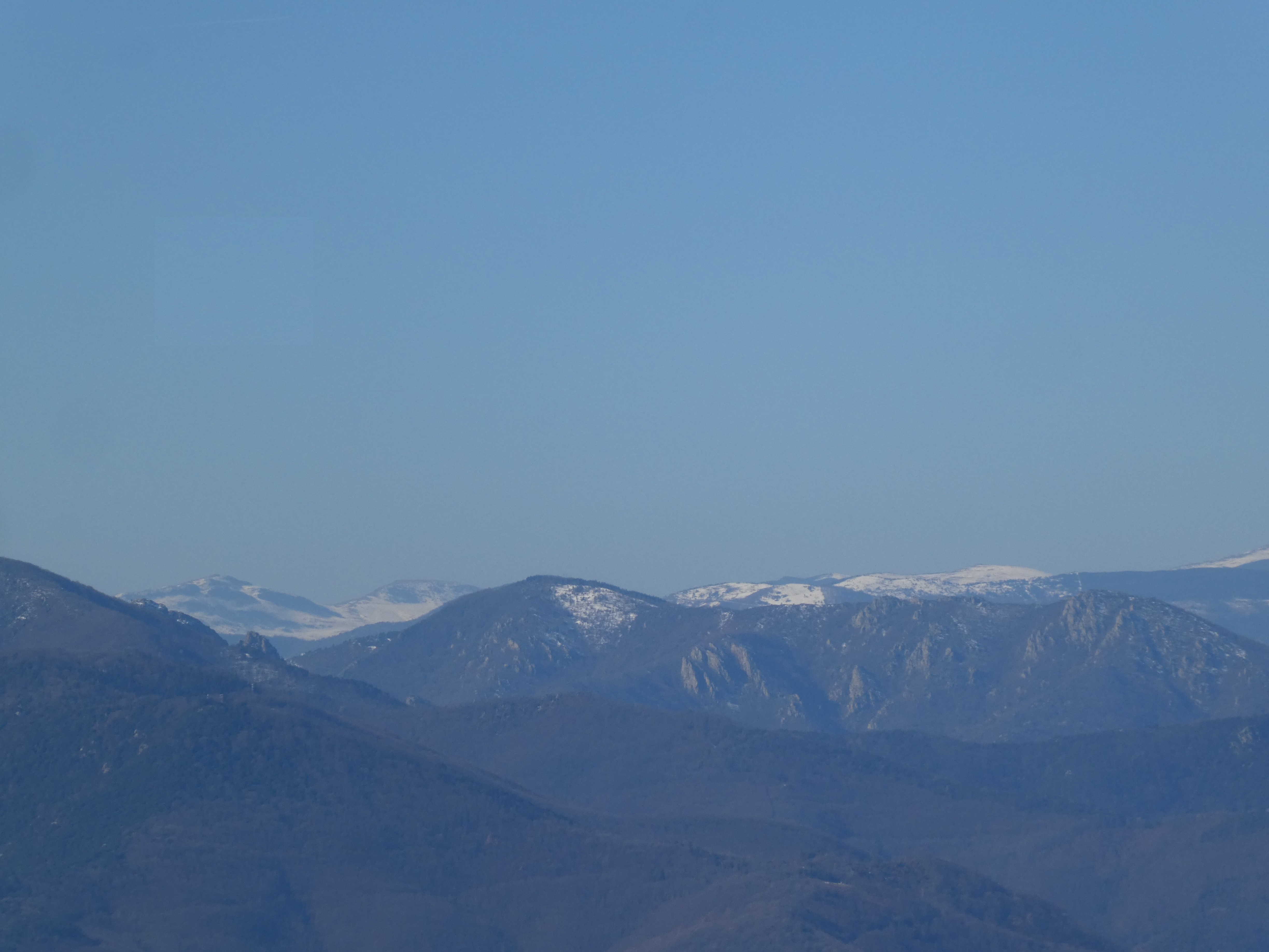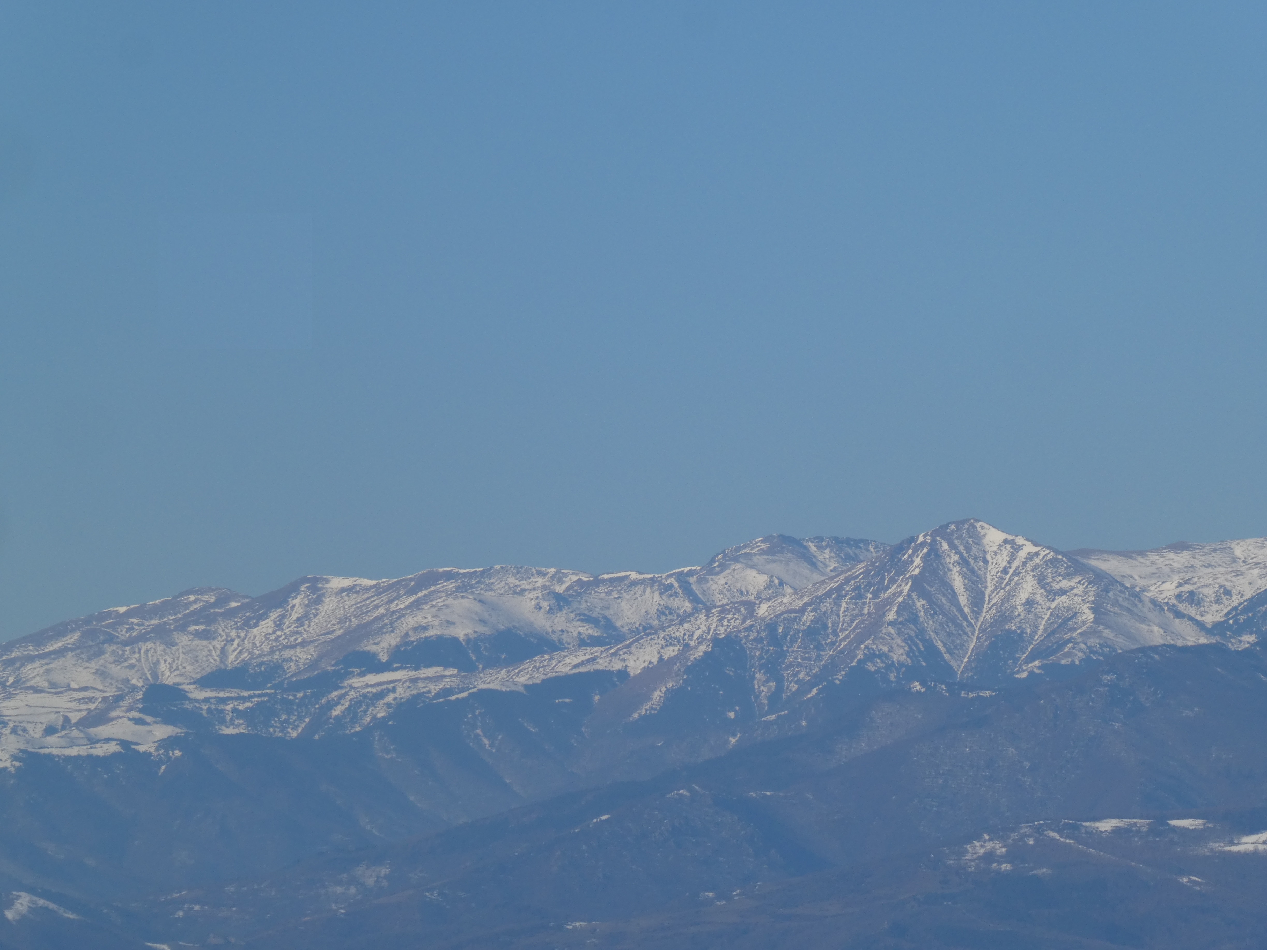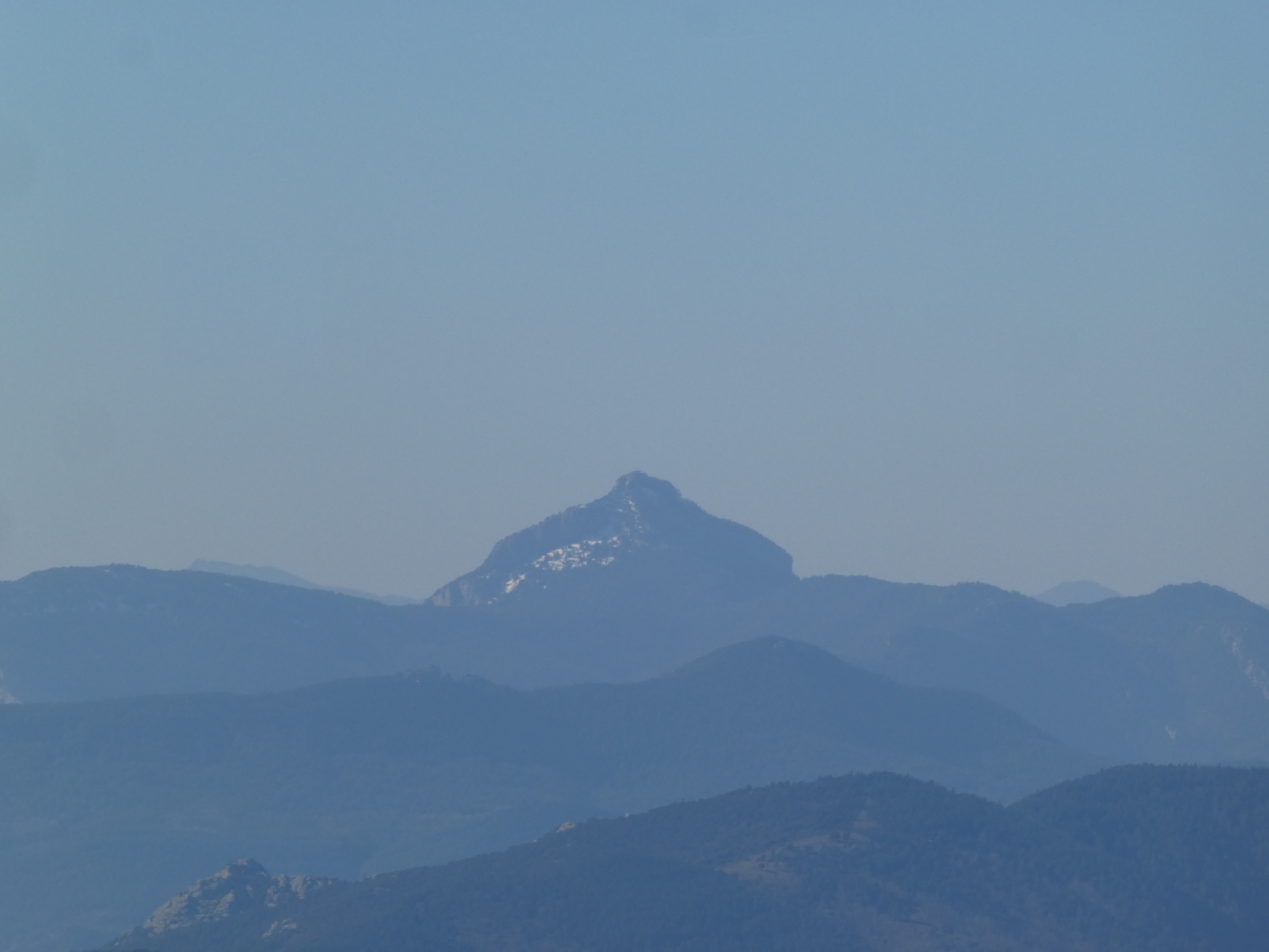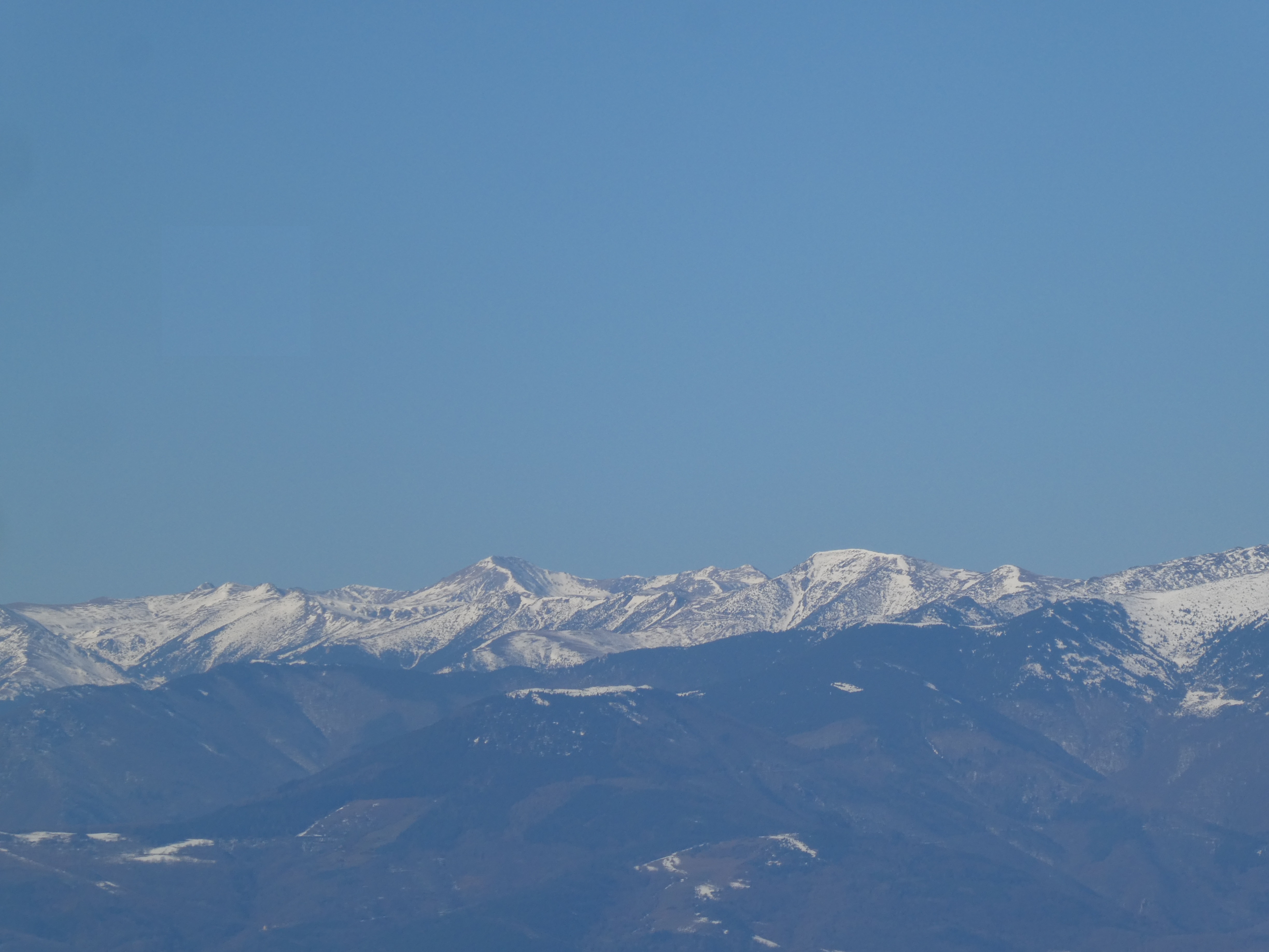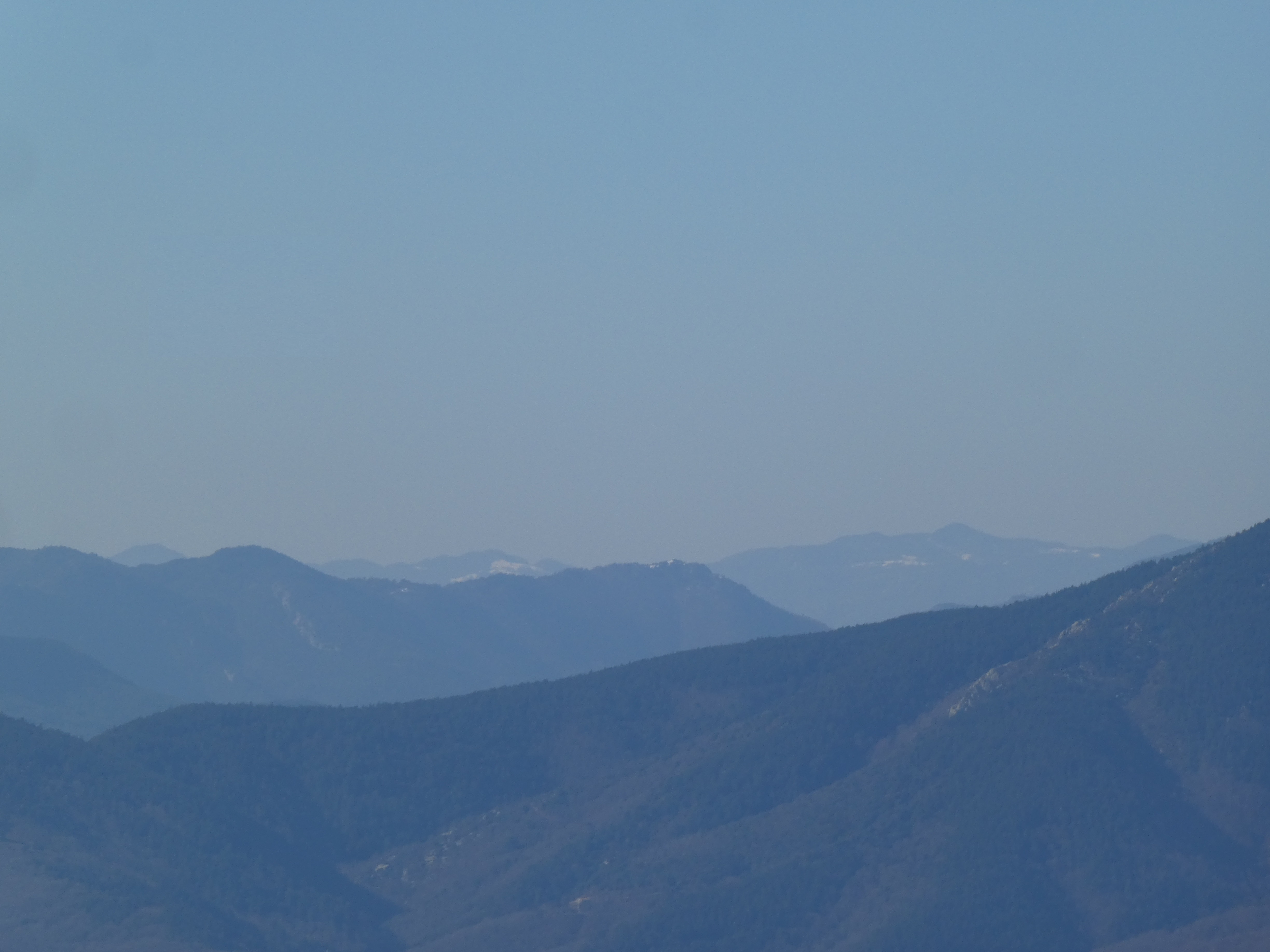 Zoom sur le Mont Coronat (2172 m) à gauche et el Madres (2467 m) au centre ... en bas, au premier plan, on aperçoit Santa Anna dels Quatre Termes (1348 m) située dans les Aspres