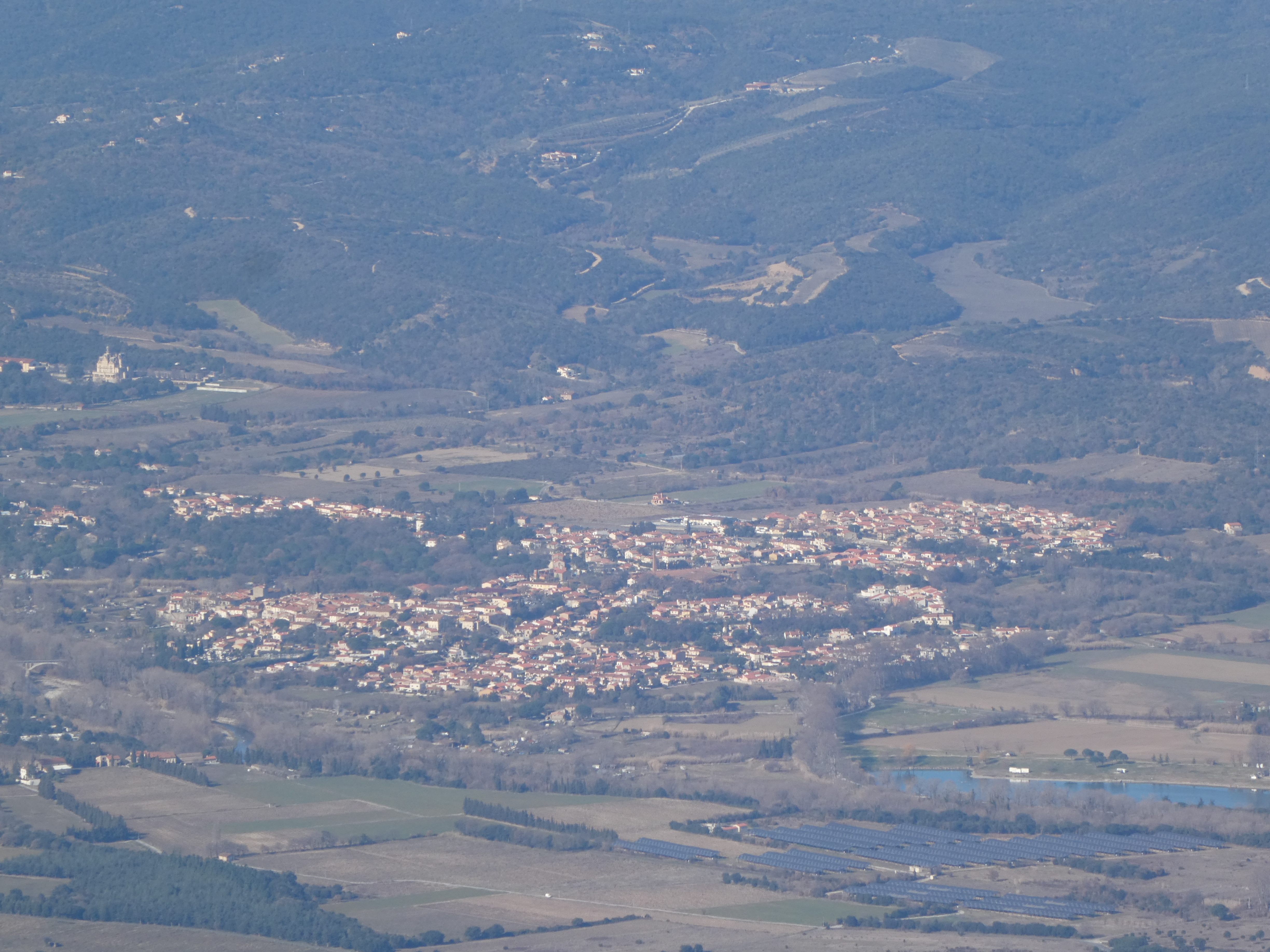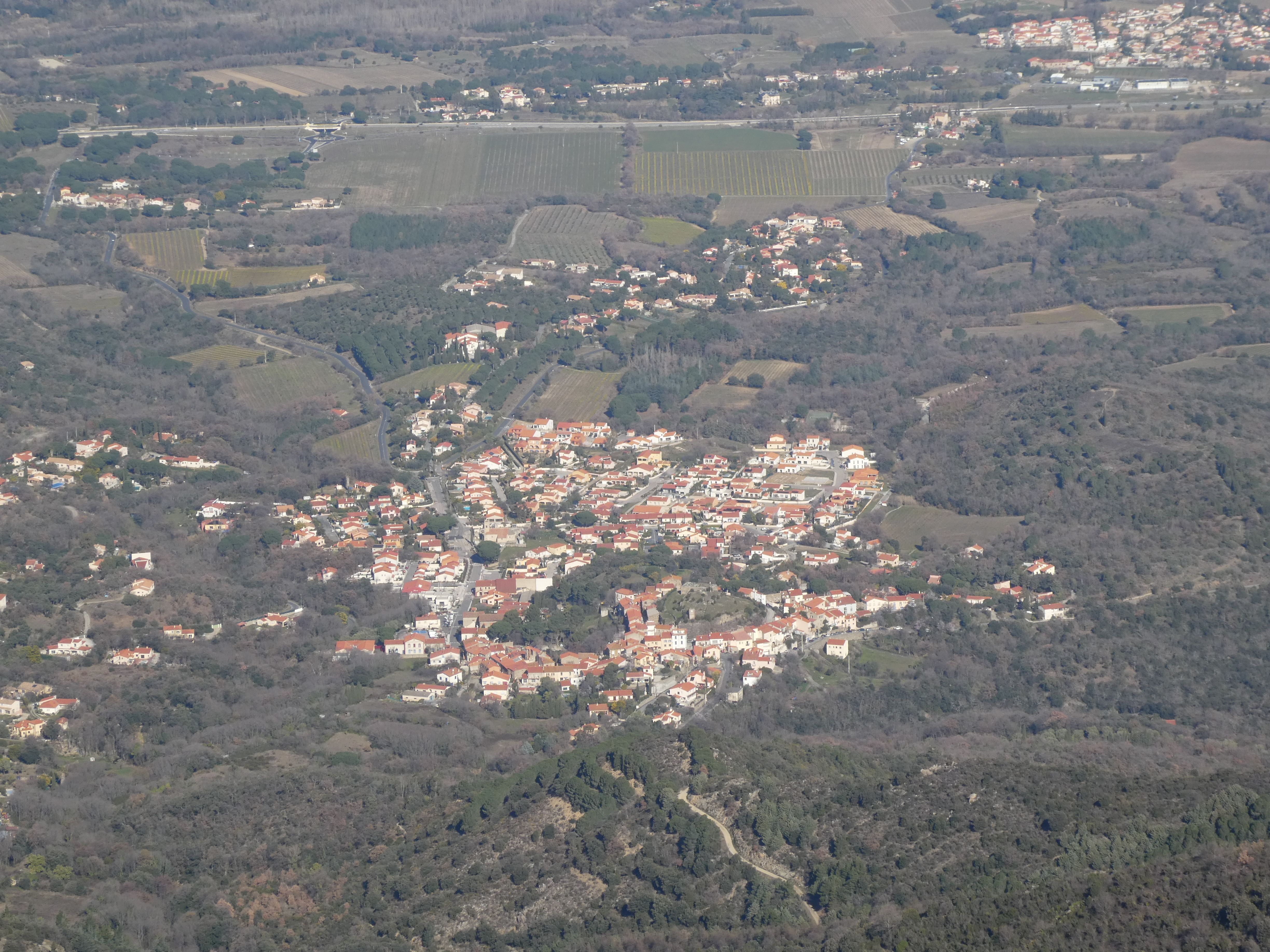 Zoom sur Laroque-des-Albères à gauche et Sorède à droite situés respectivement à 5 et 7 kilomètres ... plus haut, on aperçoit le village de Saint-André situé à 10 kilomètres