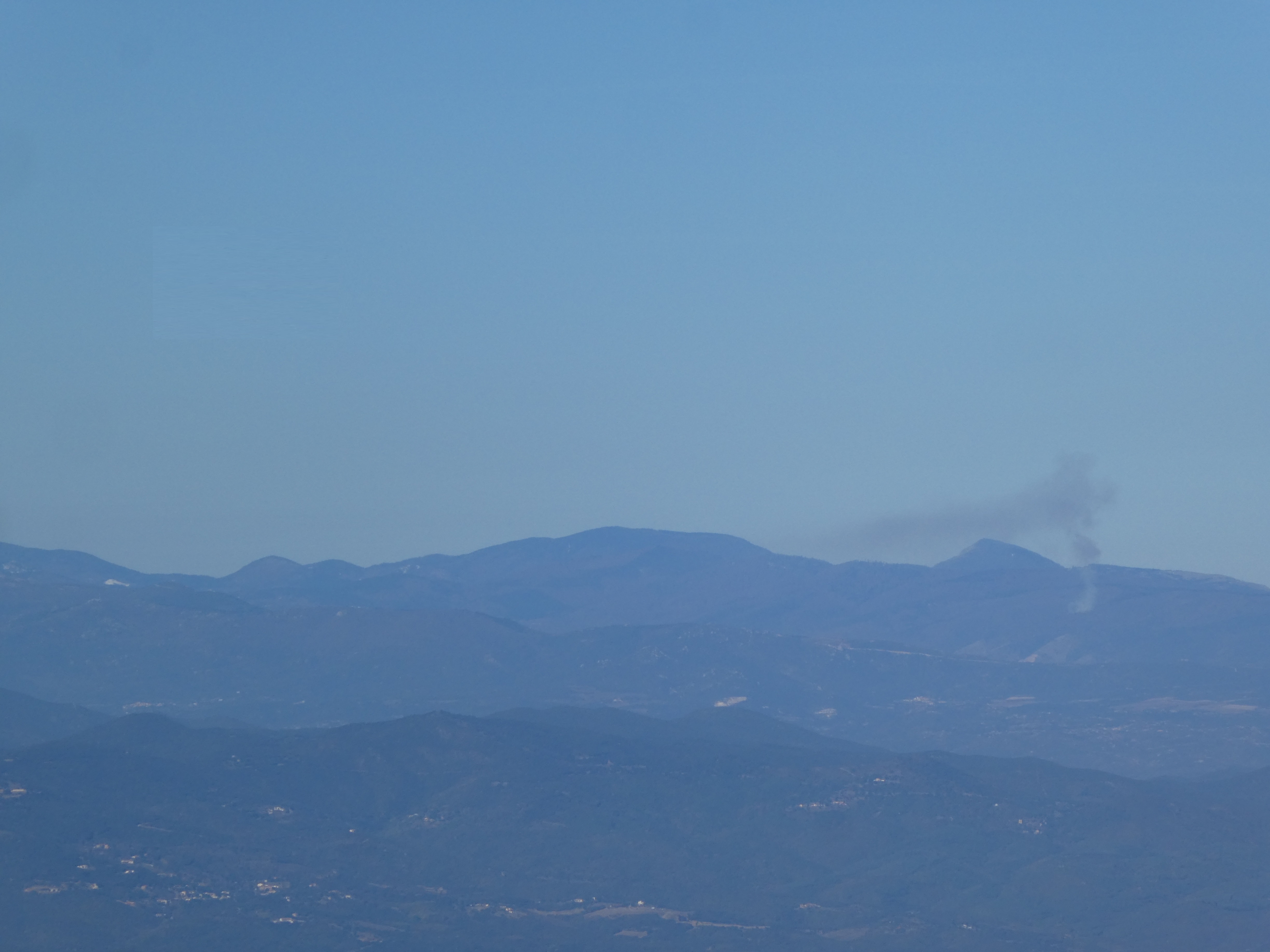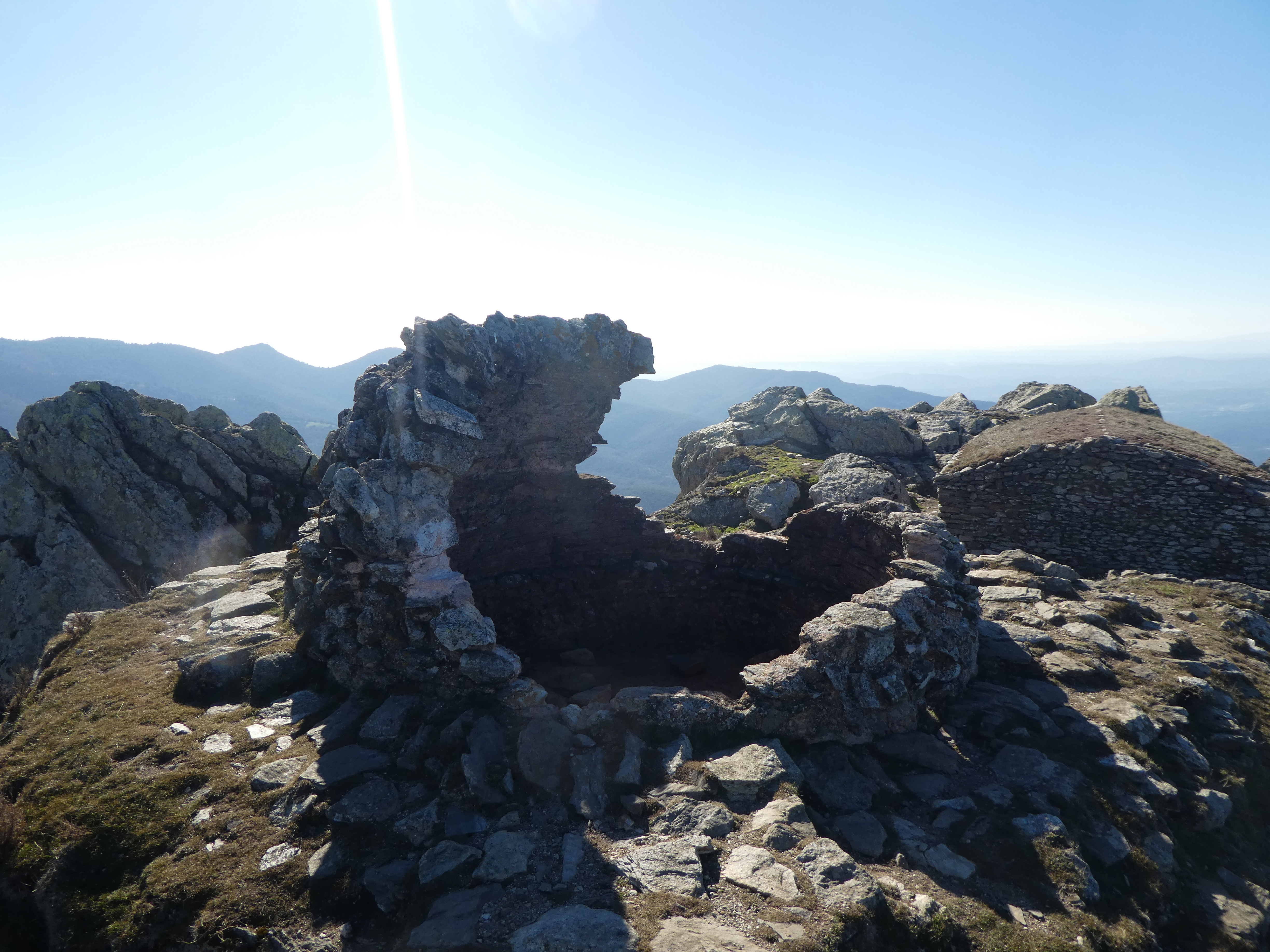 Arrivée au sommet du Puig de Sant Cristau (1015 m) : beau panorama sur les sommets de l'Empordà, de la Garrotxa, du Vallespir, du Conflent, des Corbières, des Albères ainsi que sur la Plaine de l'Empordà et du Roussillon