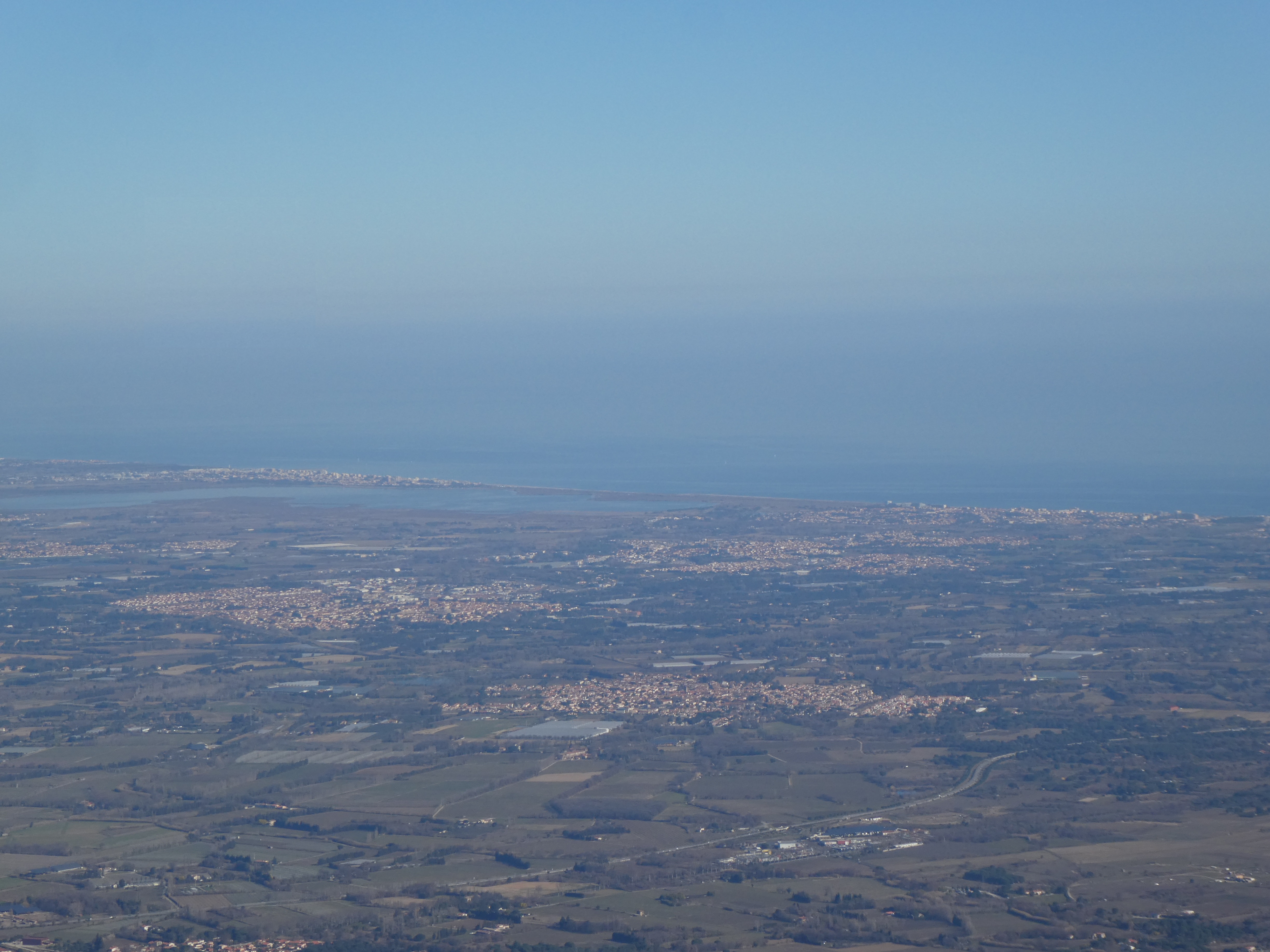 Zoom sur Elne à gauche, Saint-Cyprien à droite et Palau-del-Vidre en Bas situés respectivement à 14, 17 et 11 kilomètres ... au fond, à gauche, on aperçoit Canet-en-Roussillon situé à 25 kilomètres
