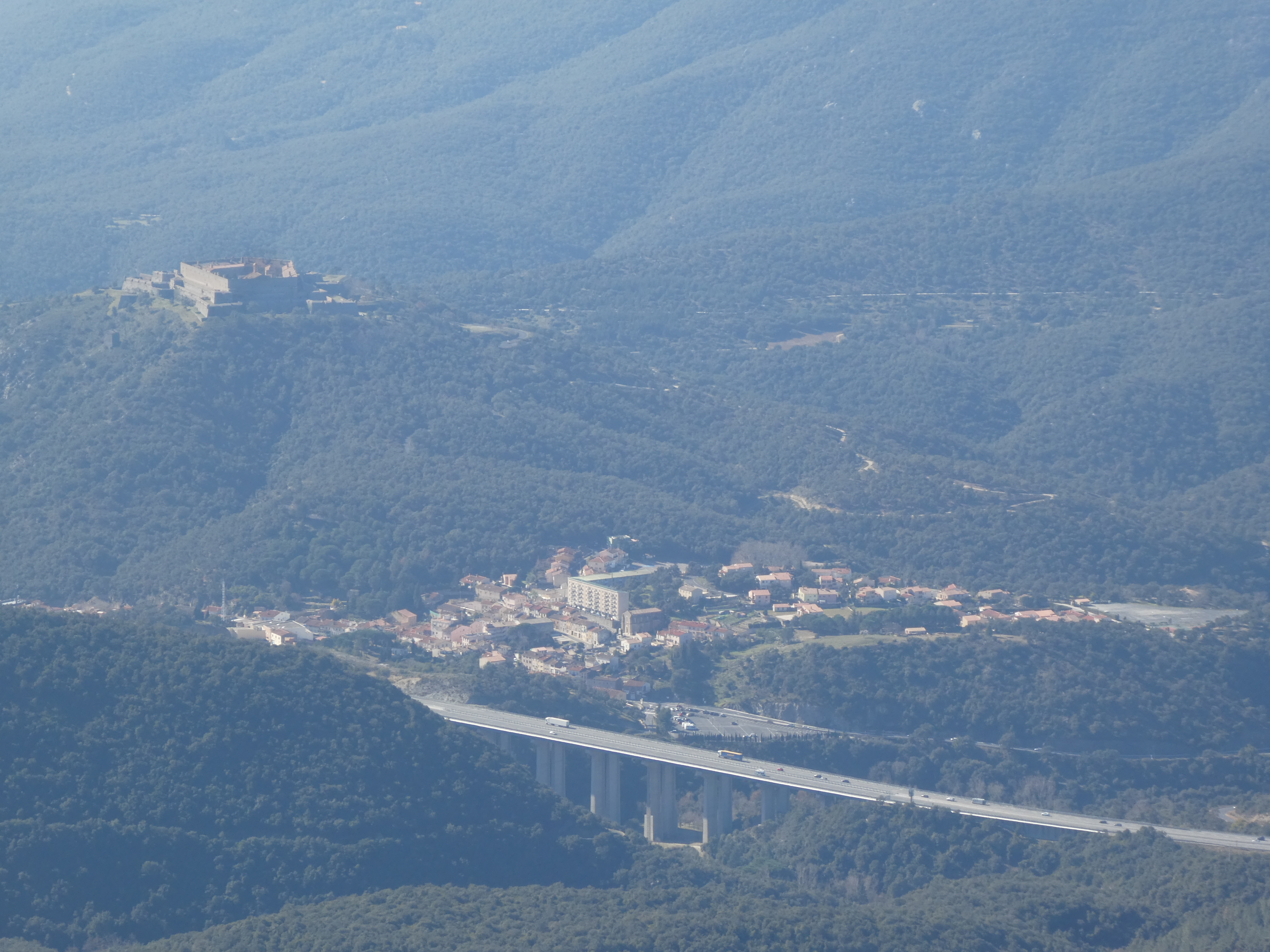 Zoom sur le Perthus et le Fort de Bellegarde le dominant, situé à 4 kilomètres