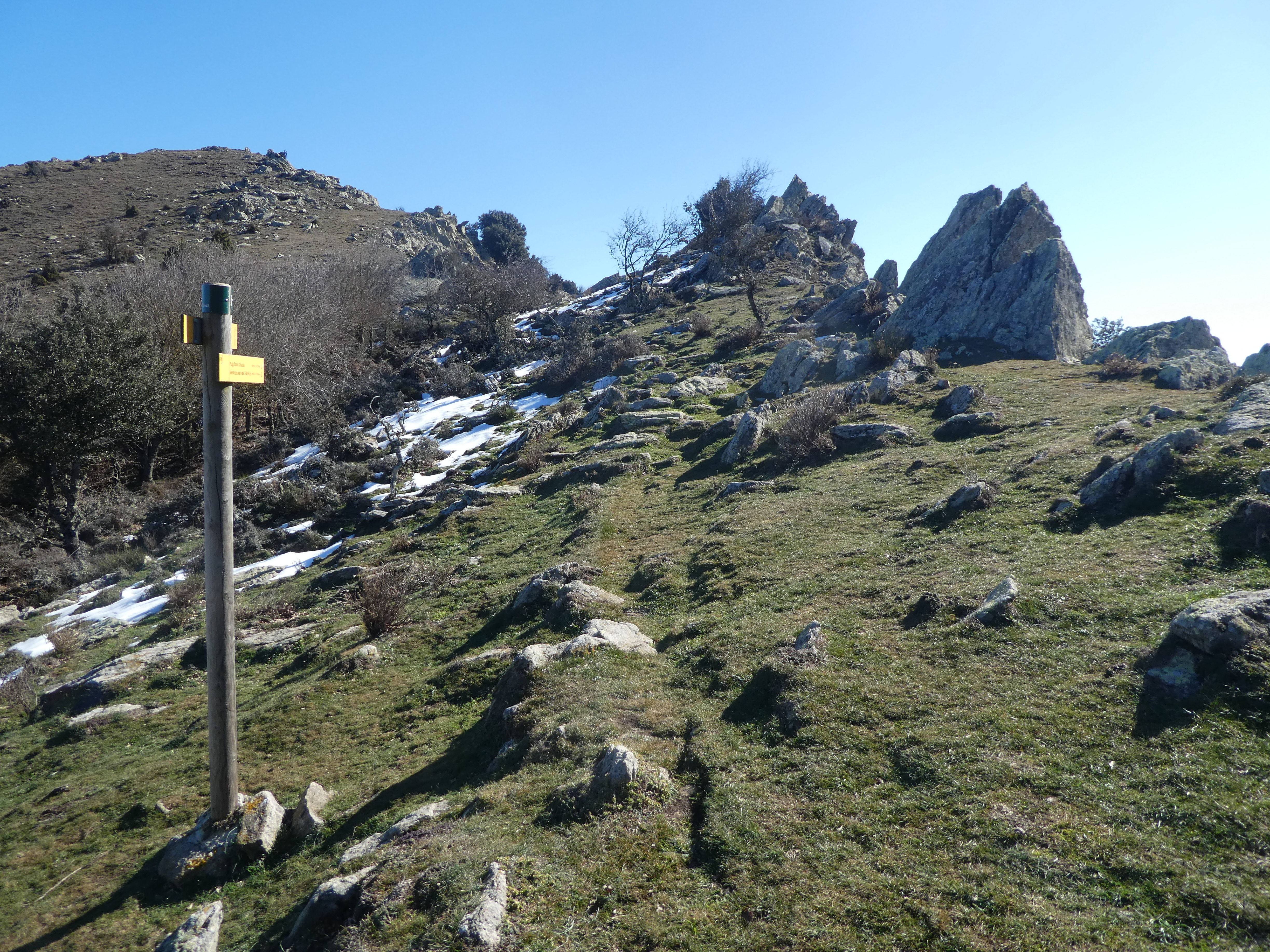 A ce croisement situé au niveau du Còrrec de Sant Cristau marqué par la présence d'un panneau directionnel (1000 mètres après le précédent), suivre le chemin montant raidement sur la droite direction Coll de Llinàs, balisé en jaune dorénavant