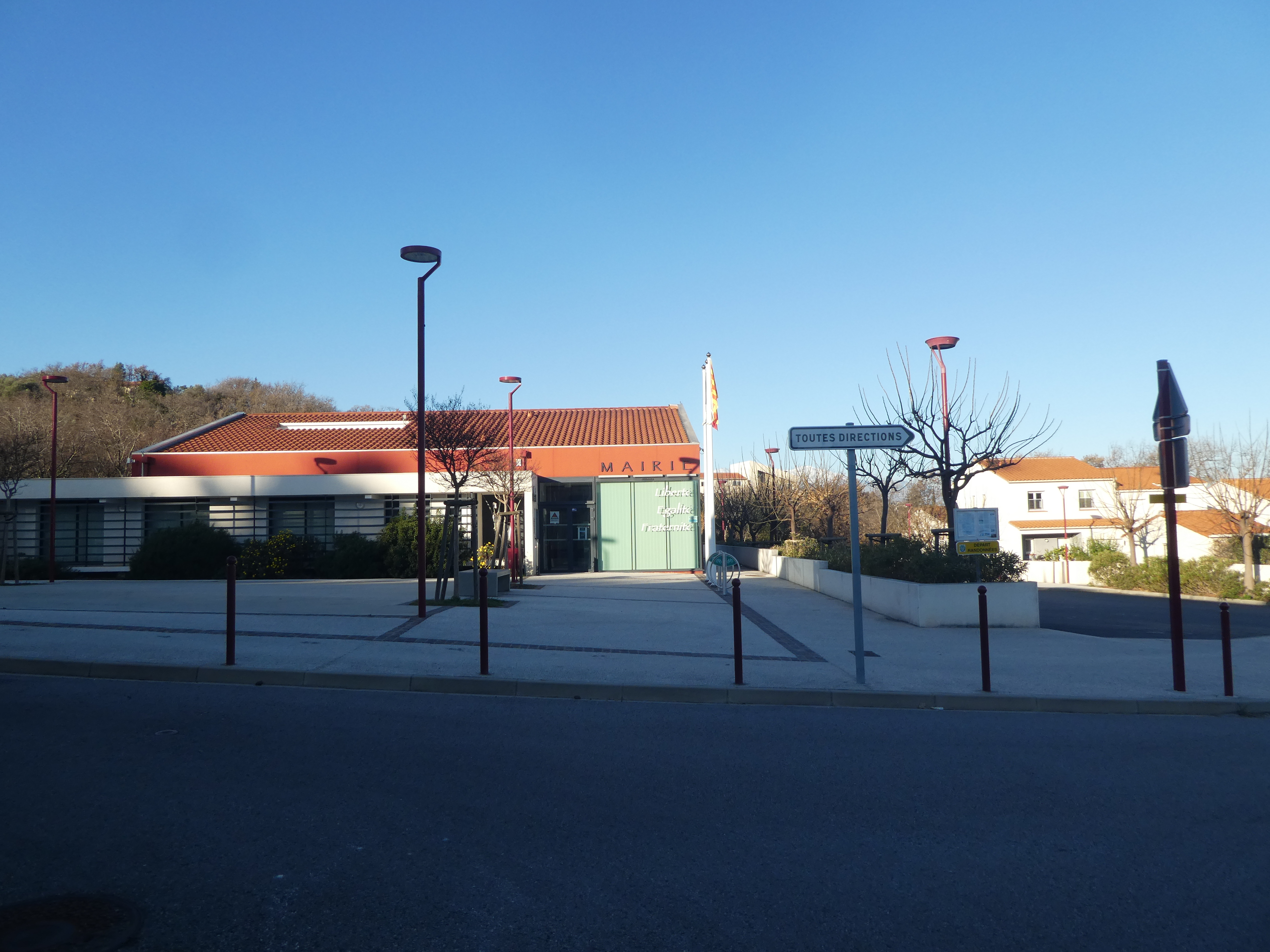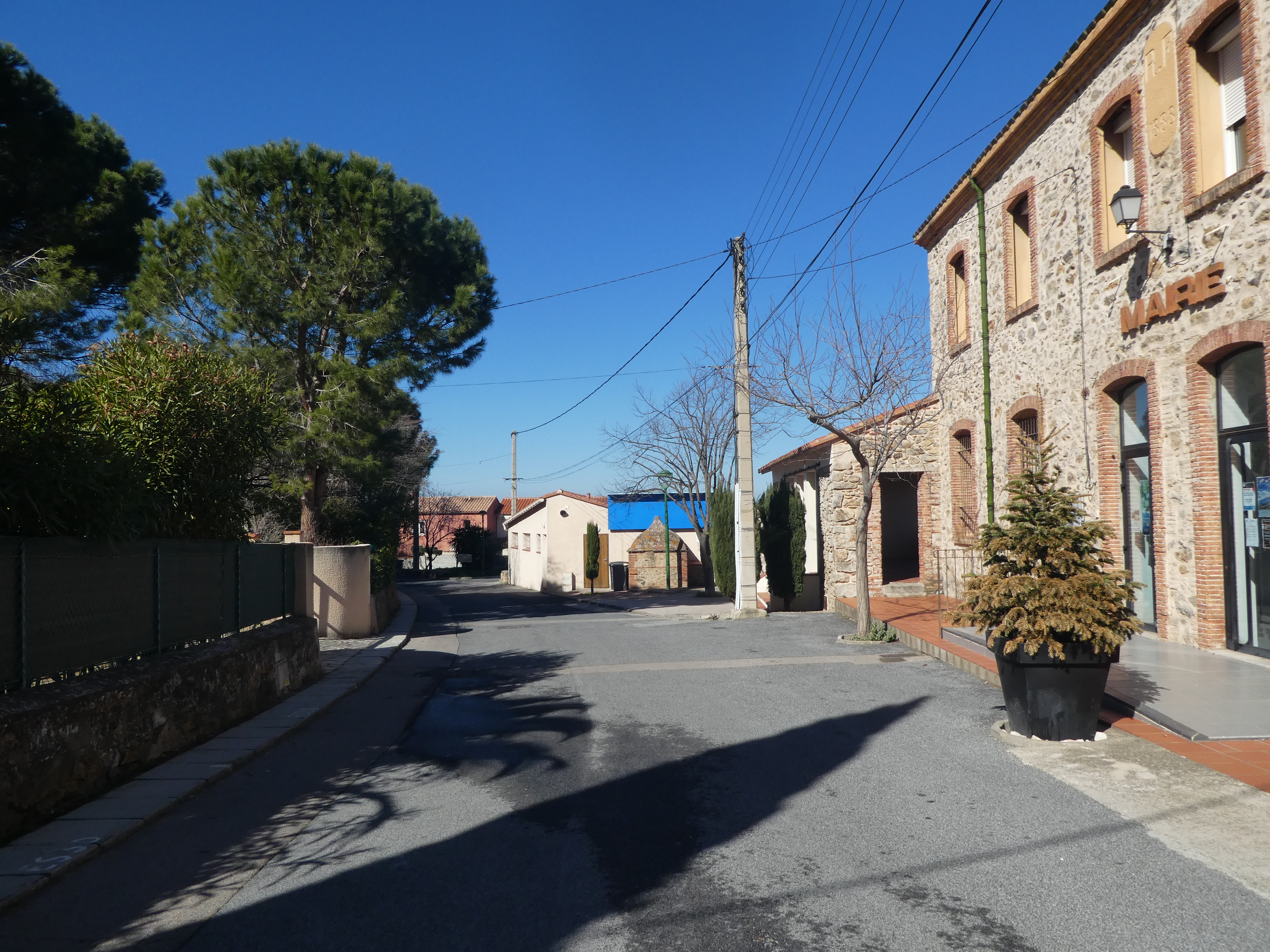 A cette intersection avec la rue de la mairie (100 mètres après la précédente), suivre cette dernière sur la droite direction Villelongue-dels-Monts - Mairie (boucle bouclée)
