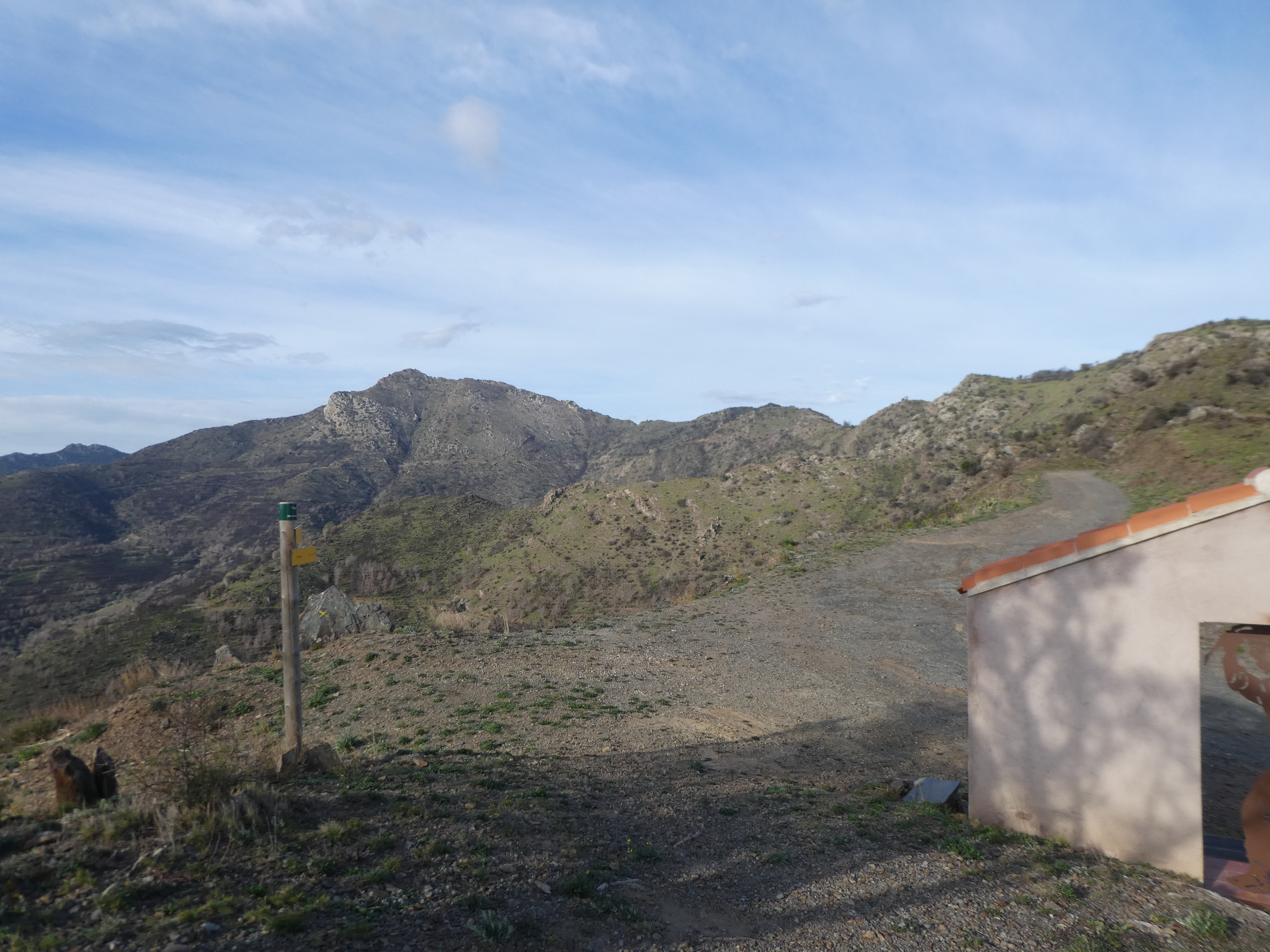 A ce croisement avec un chemin plus large venant du côté espagnol (1400 mètres après le Coll de la Farella), suivre ce dernier partant légèrement sur la gauche direction Cerbère, balisé en jaune
