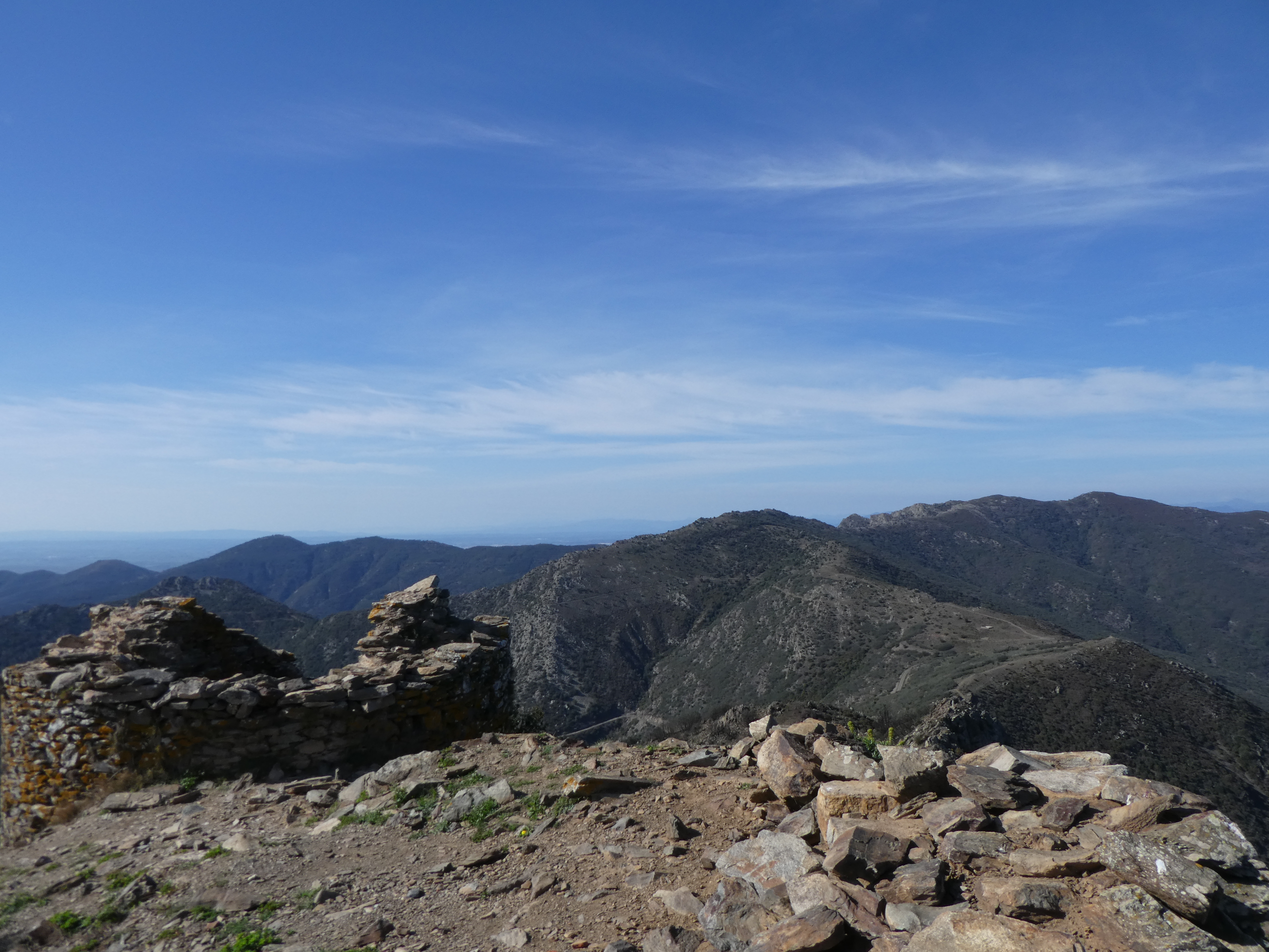 Arrivée au sommet de la Torre de Querroig (672 m) : frontière franco-espagnole : beau panorama sur les sommets des Albères, du Parc Natural de Cap de Creus, de l'Empordà, du Ripollès, du Conflent, du Vallespir, des Corbières ainsi que sur la Côte Vermeille et le littoral nord-catalan
