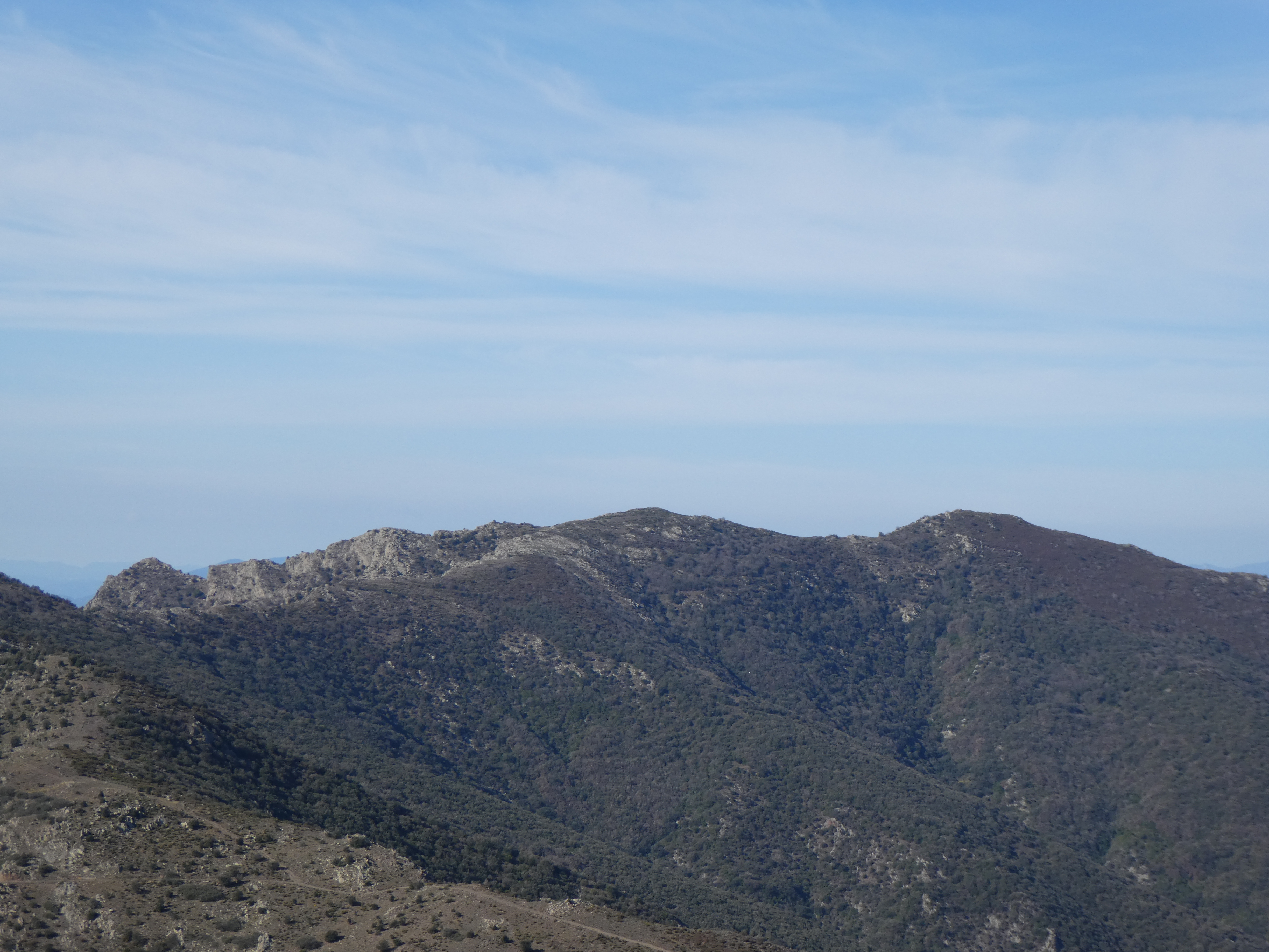 Zoom sur le Puig de Sant Marc (1327 m) à gauche, le Puig de les Bruixes (1391 m) au centre-gauche et le Puig de Coma Negra (1554 m) au centre-droit