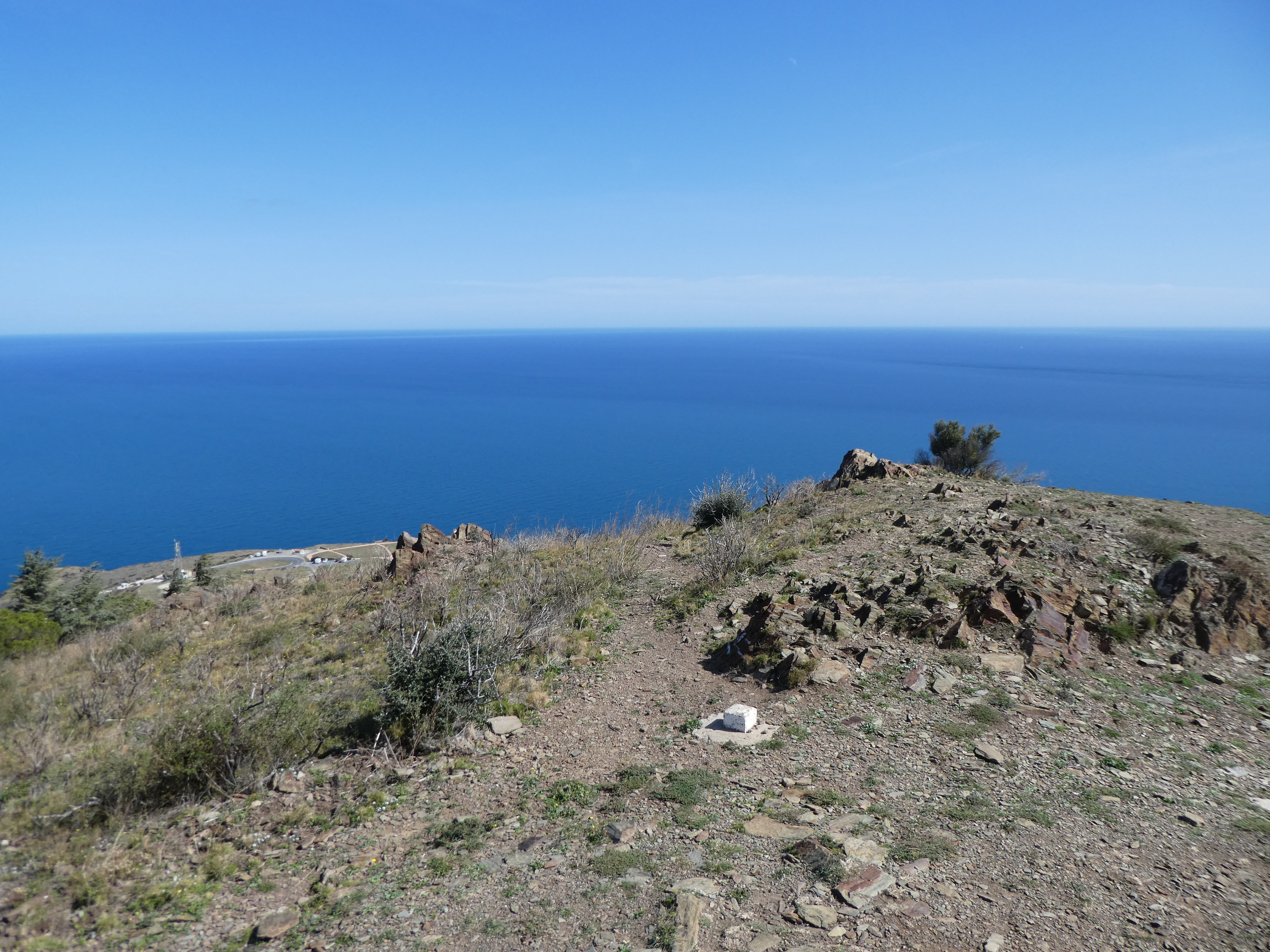 Redescendre du sommet en suivant le chemin descendant raidement sur la gauche (direction Nord) direction Cerbère (frontière hispano-française : retour en France)