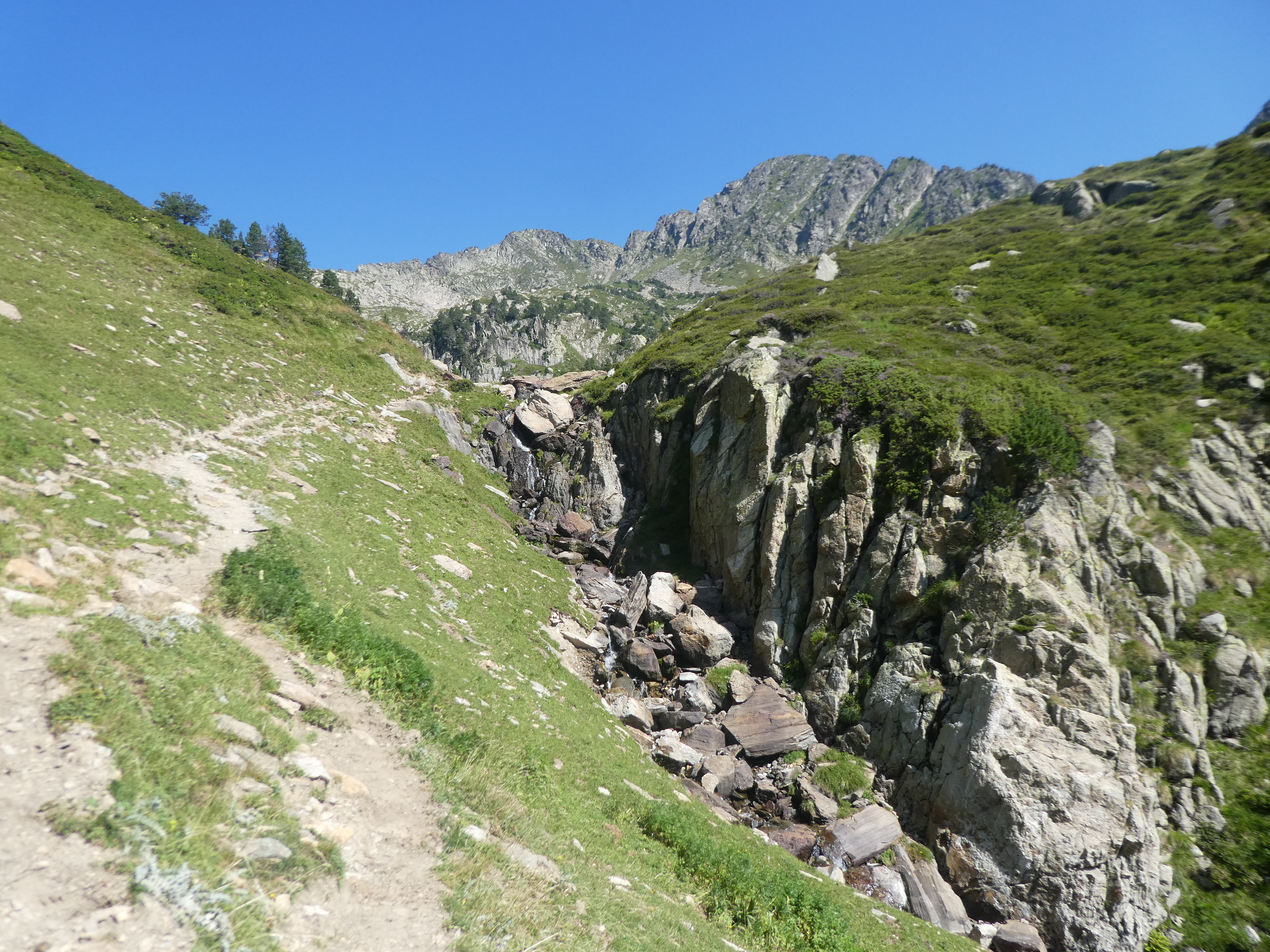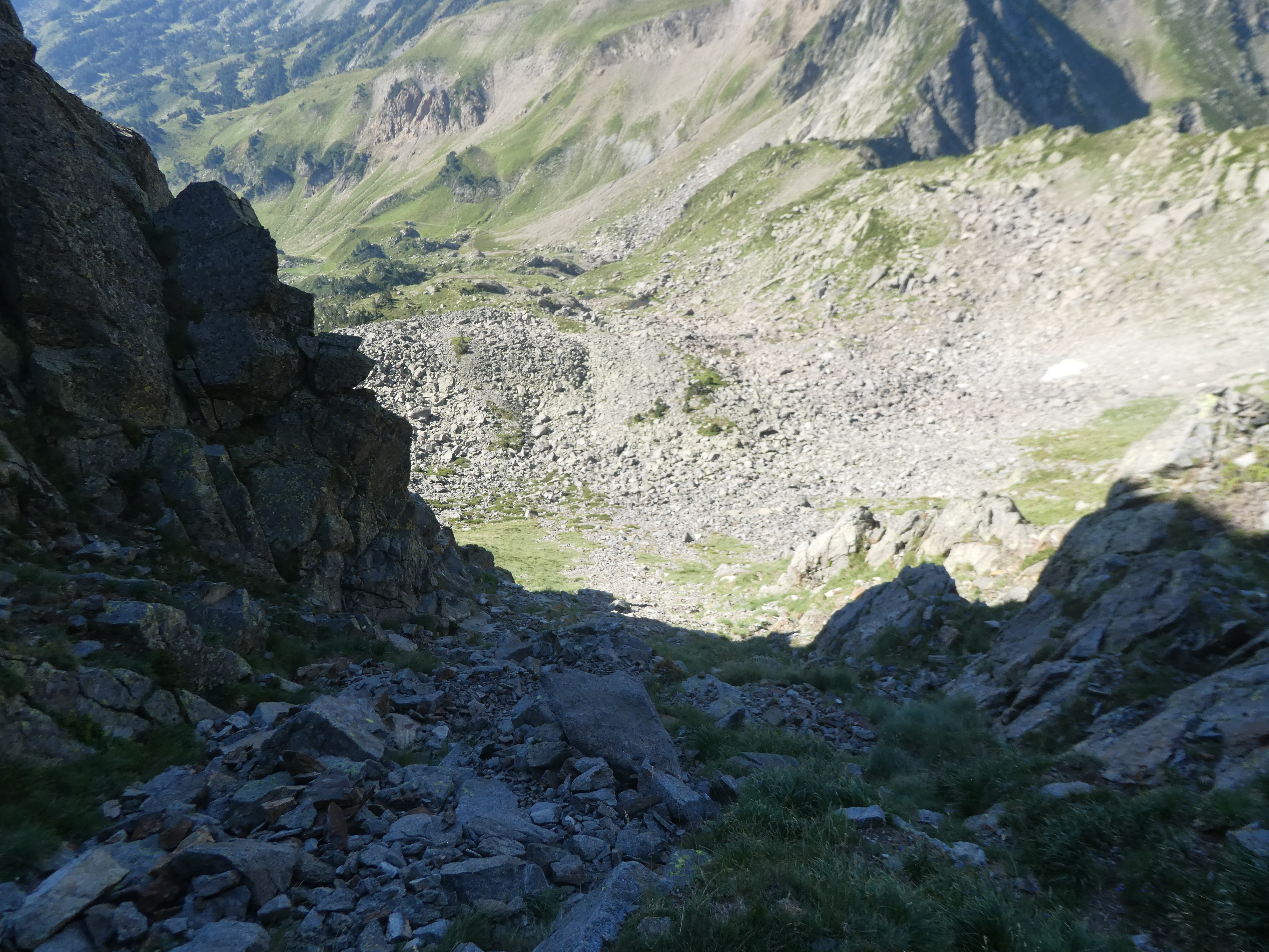 Vue sur le raide "couloir" de descente vers le Bac de la Portella