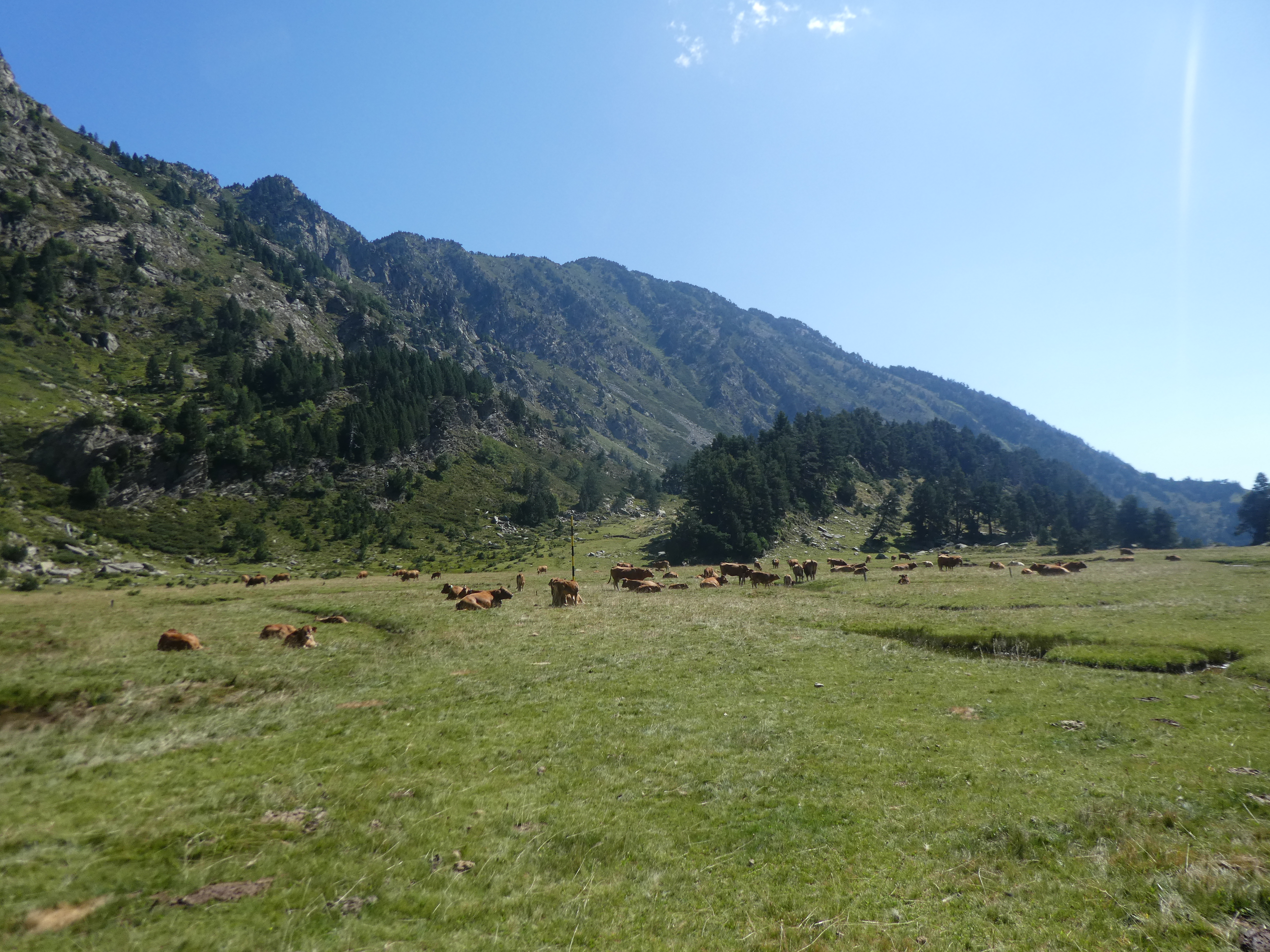 Départ Esposolla (1522 m) : suivre la rue partant tout droit vers le centre du village direction Refuge des Camporells, balisé en jaune et rouge