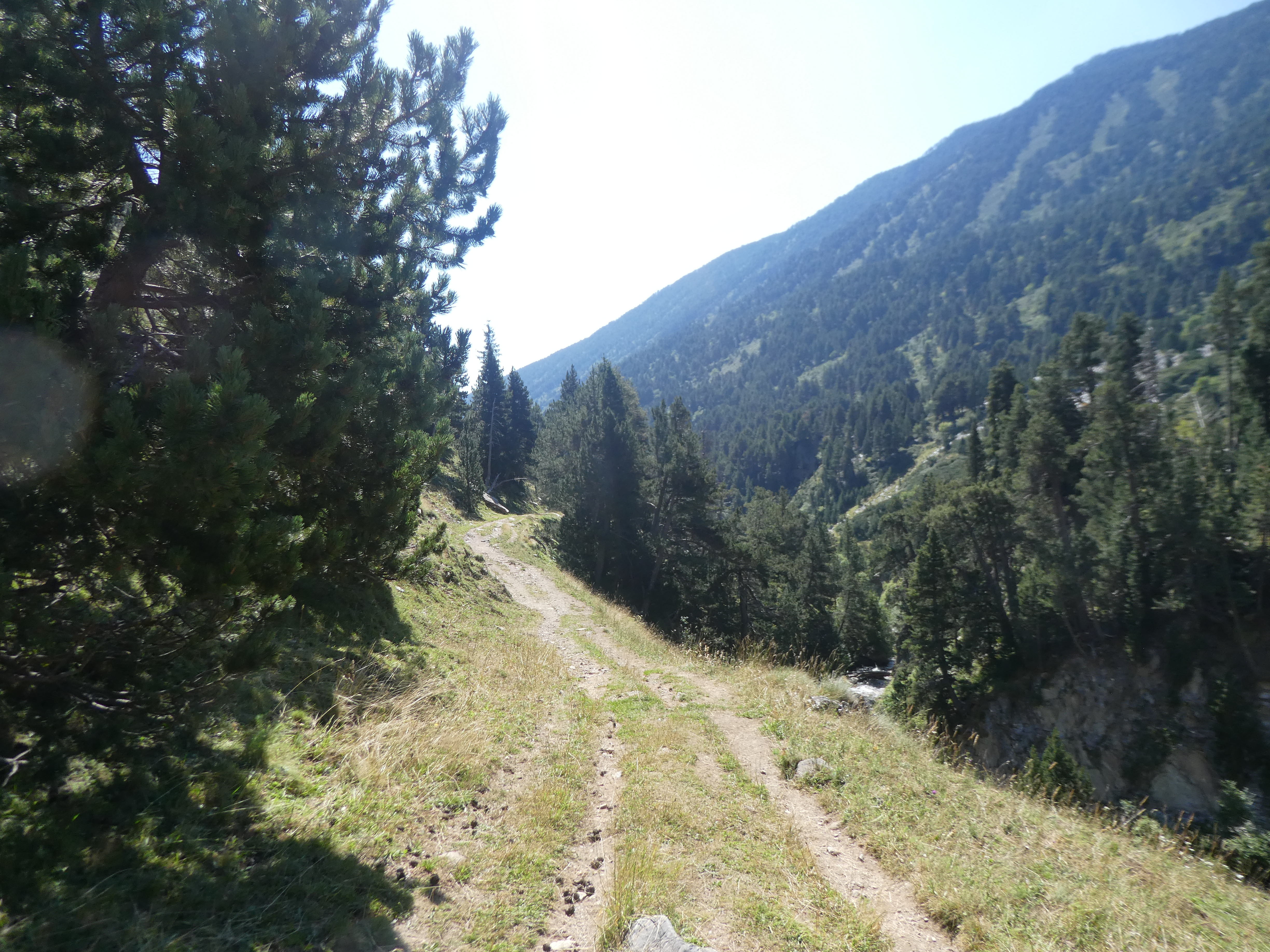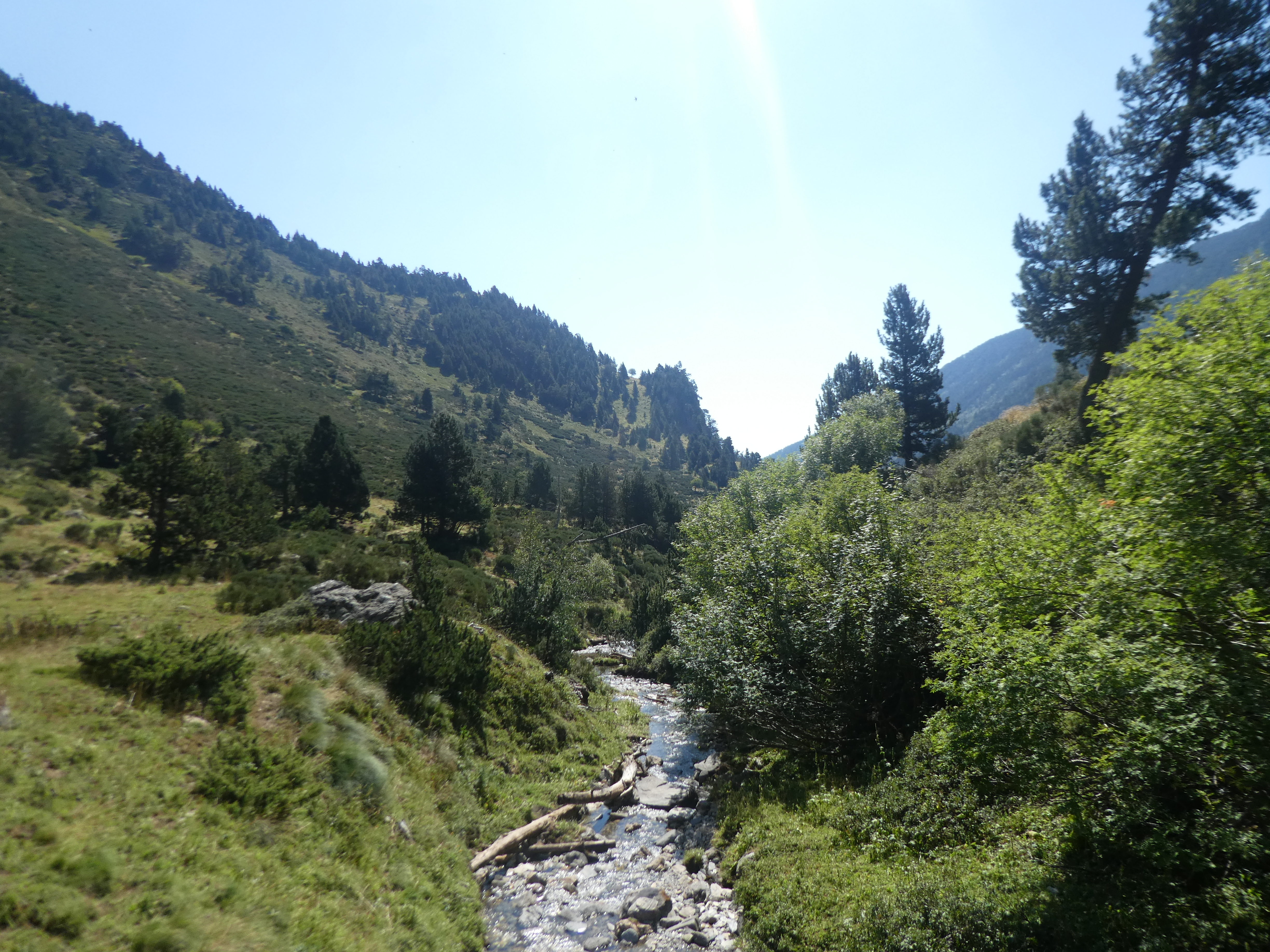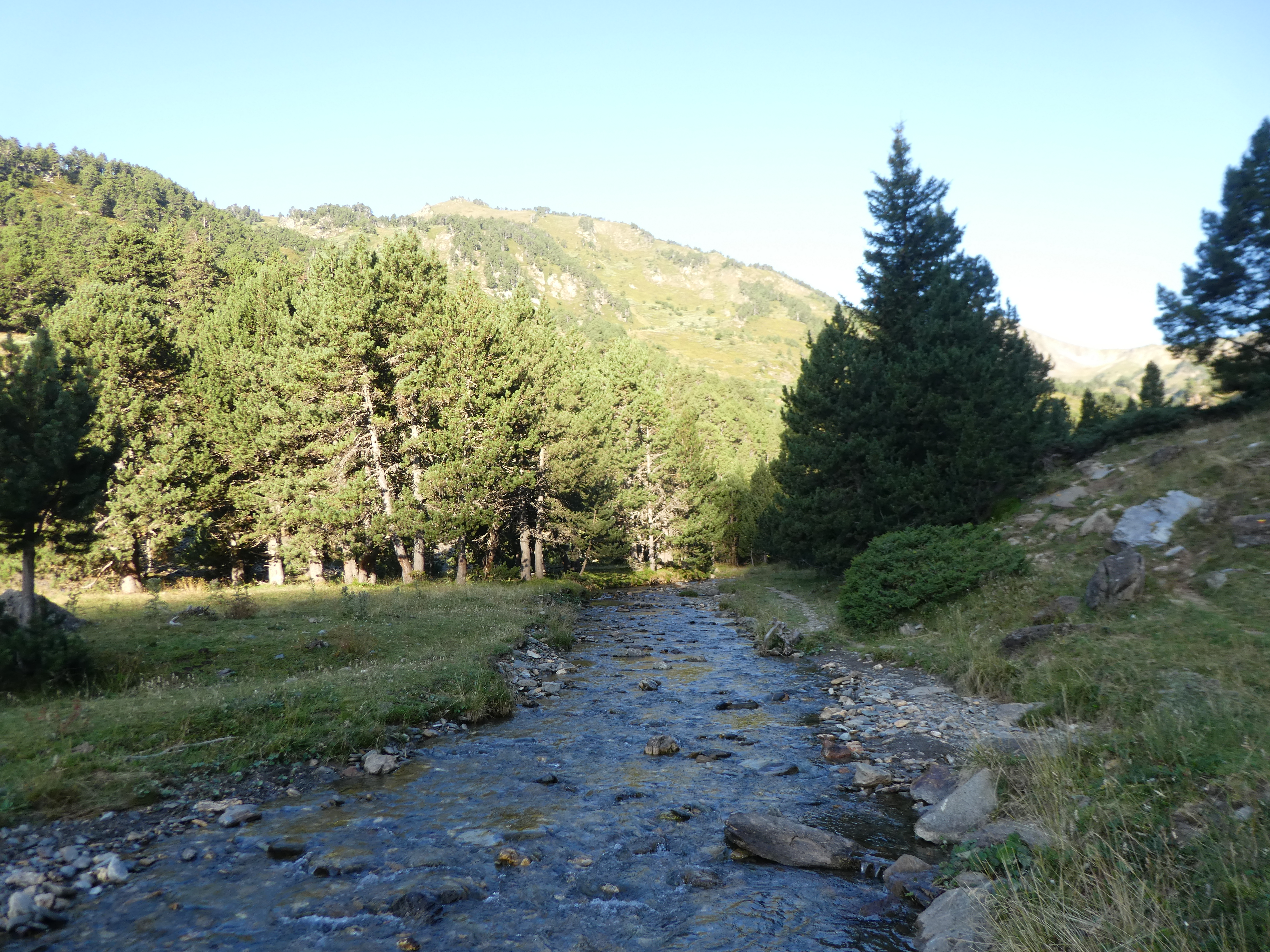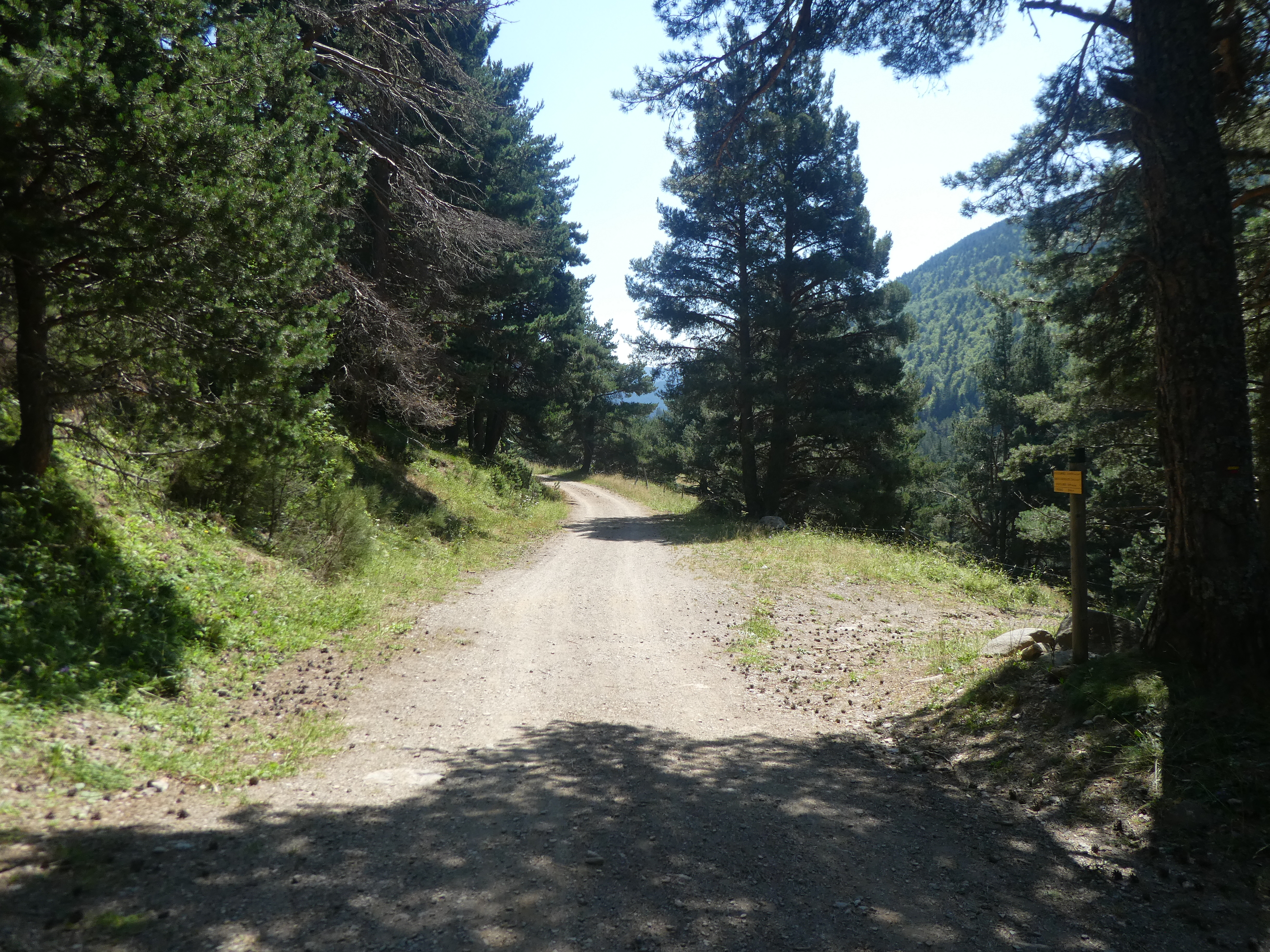 Pont dels Plans de l'Orriet (1625 m) : suivre la piste partant tout droit direction Refuge des Camporells, balisé en jaune et rouge
