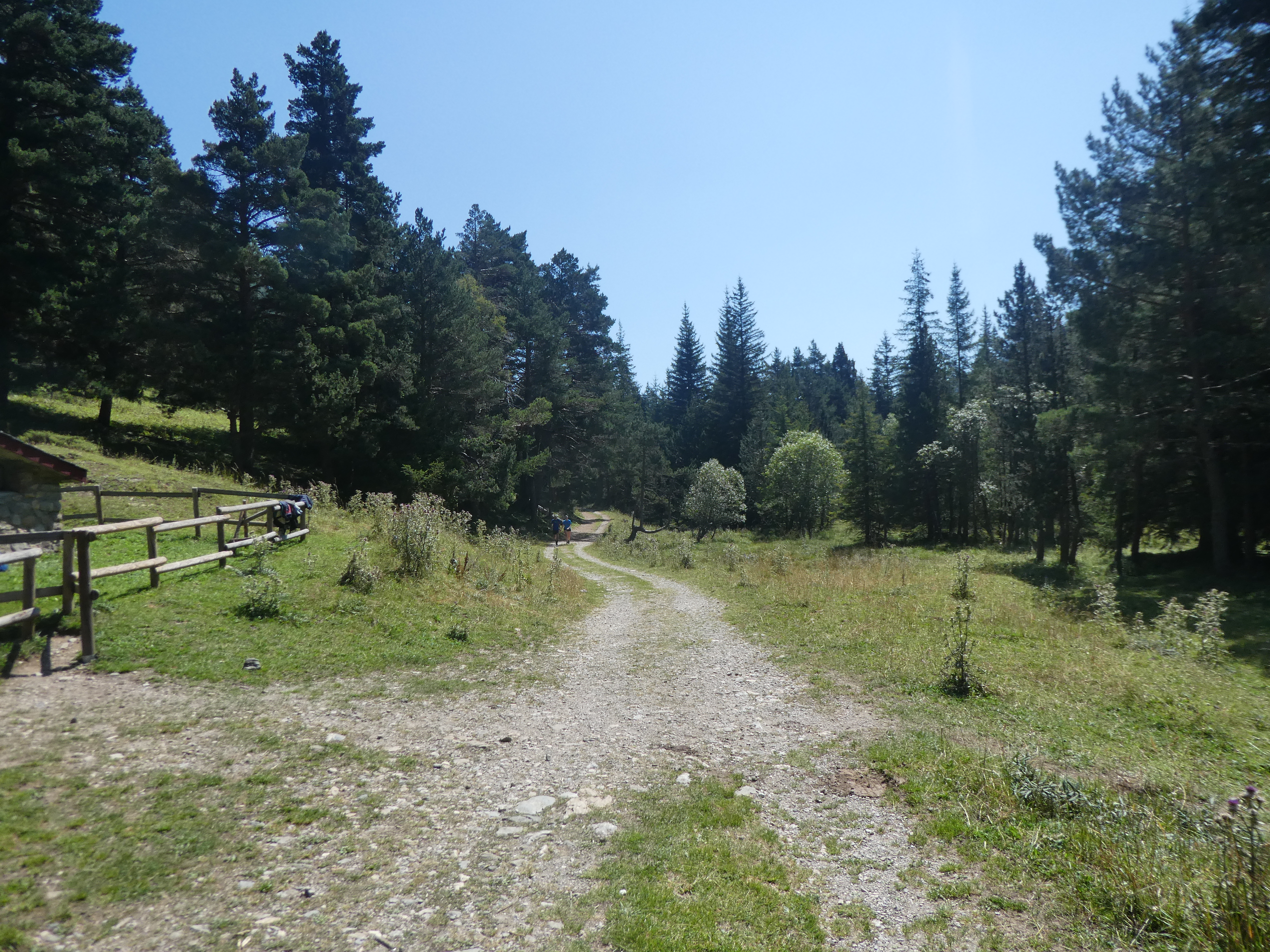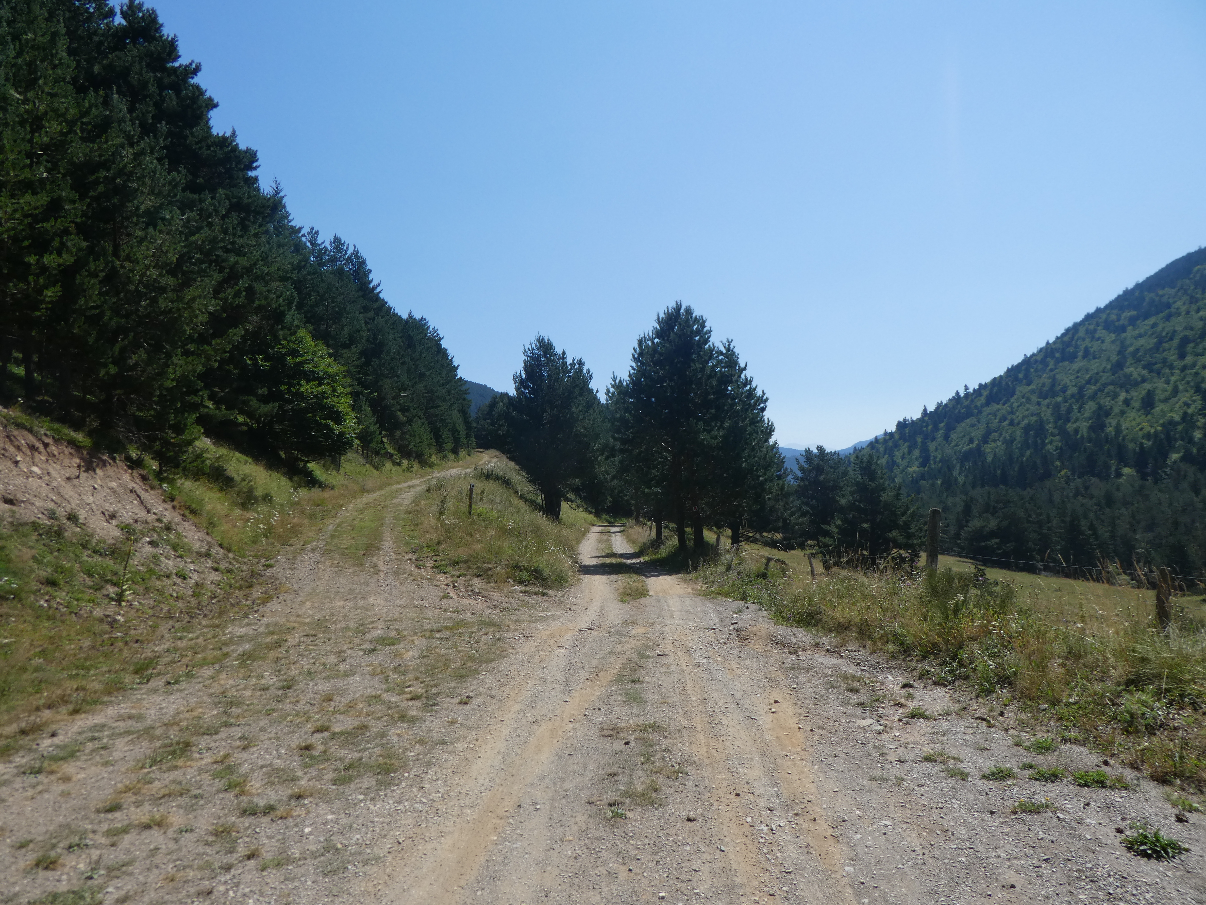 A ce croisement (2800 mètres après le précédent) (1548 m), suivre le chemin partant sur la droite direction Esposolla, balisé en jaune et rouge
