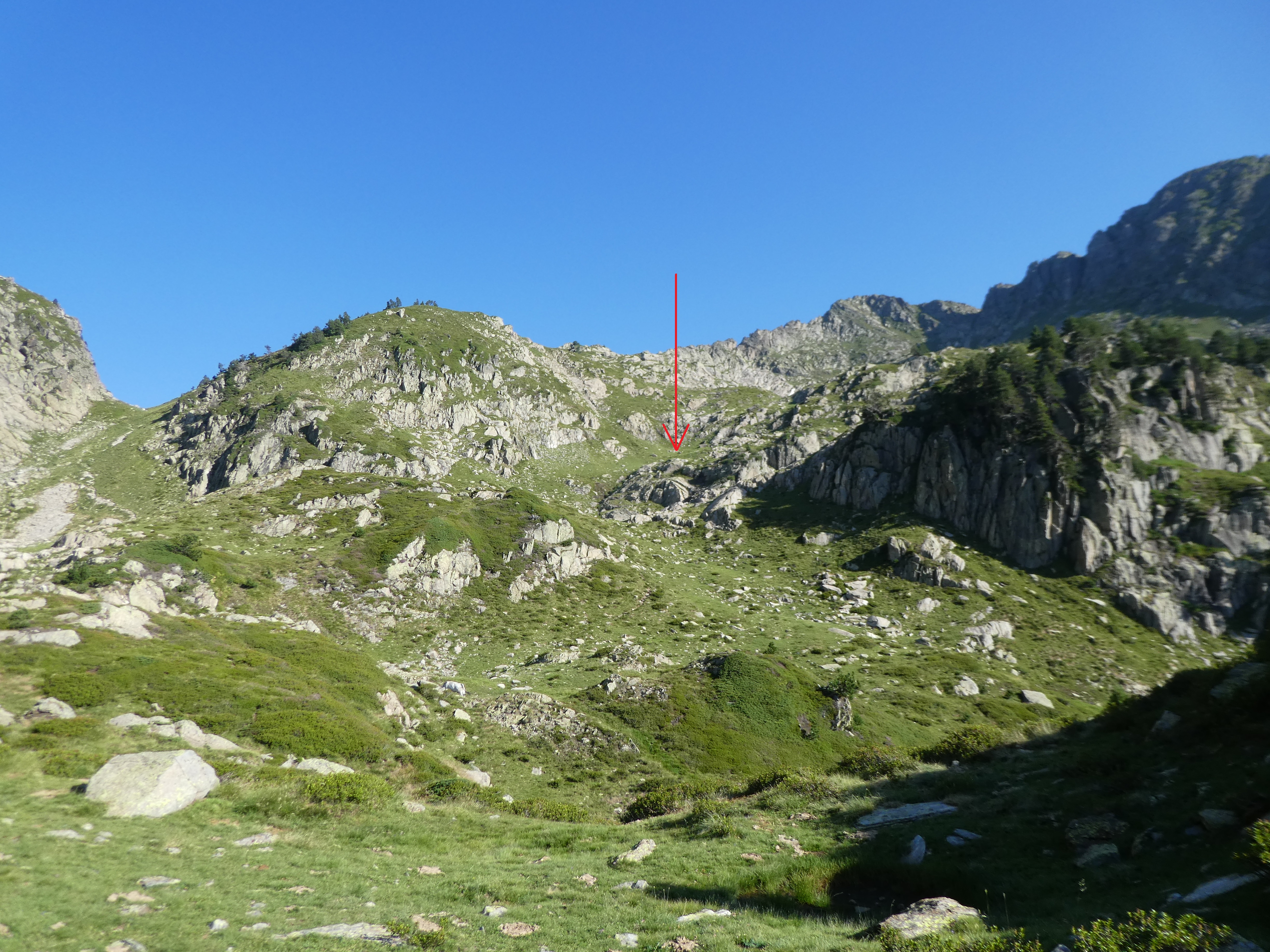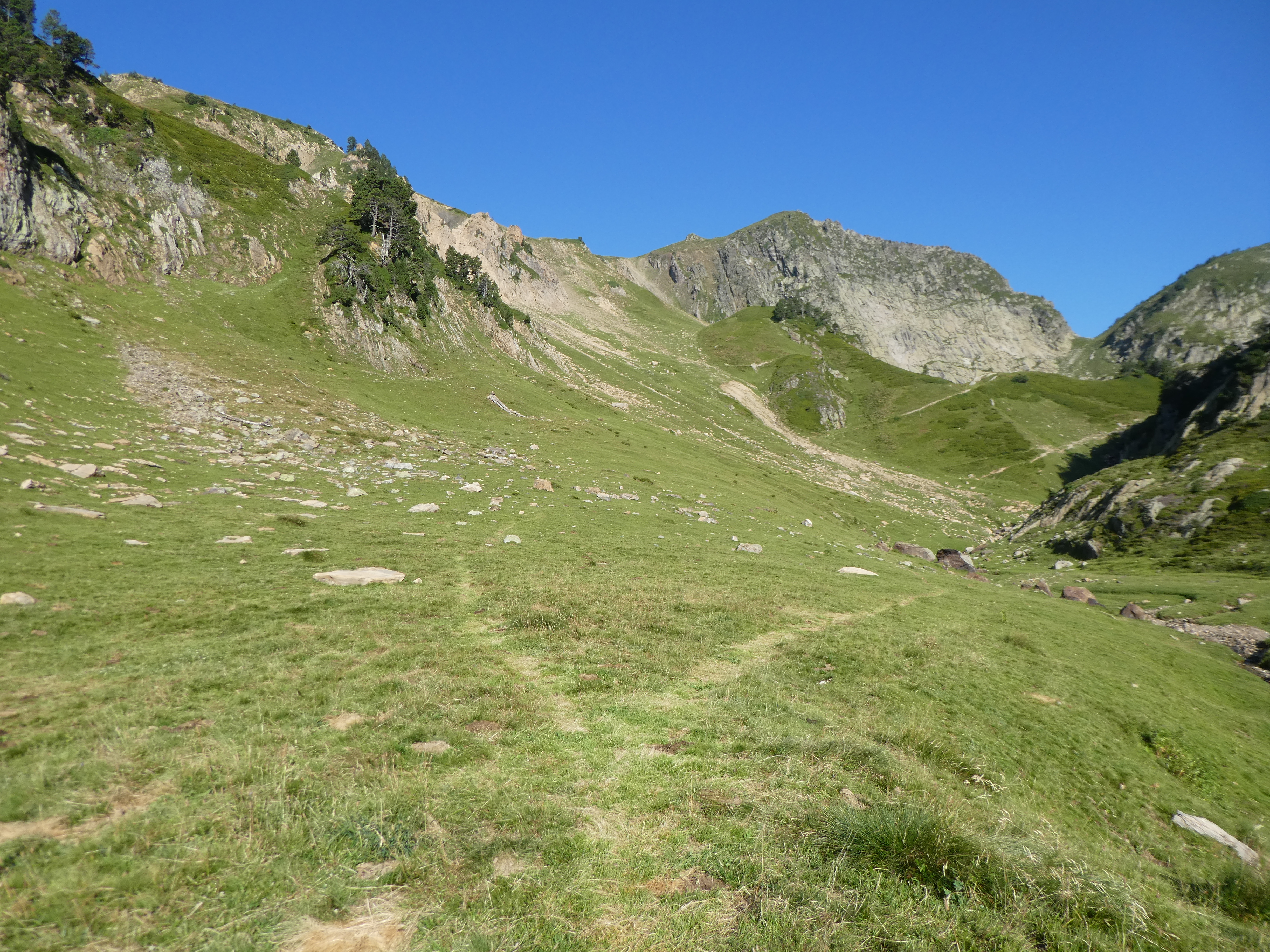 Après avoir contourné le mamelon herbeux, franchir le verrou du Bac de la Portella en montant la pente herbeuse en prenant une direction Nord-Ouest direction Pic de Baxouillade (présence de quelques cairns)
