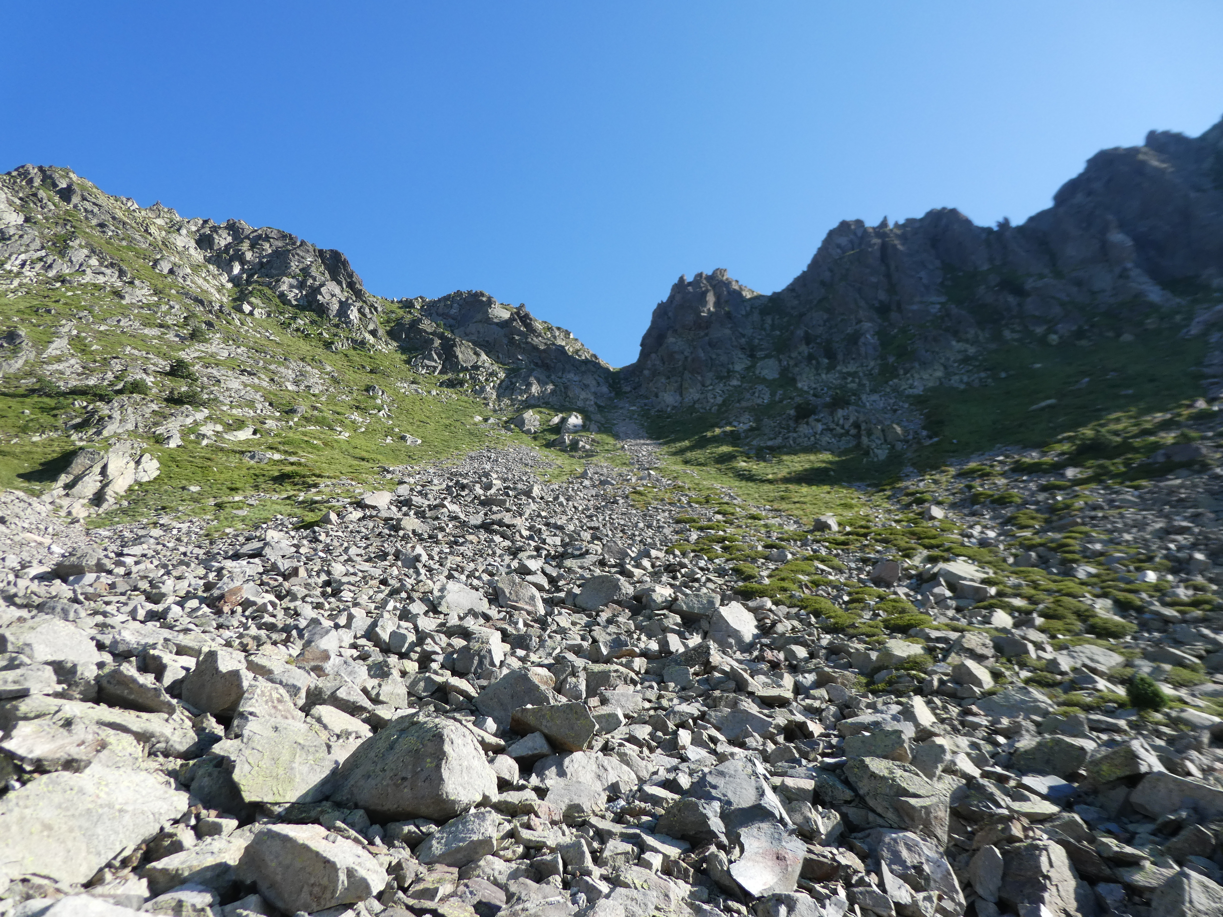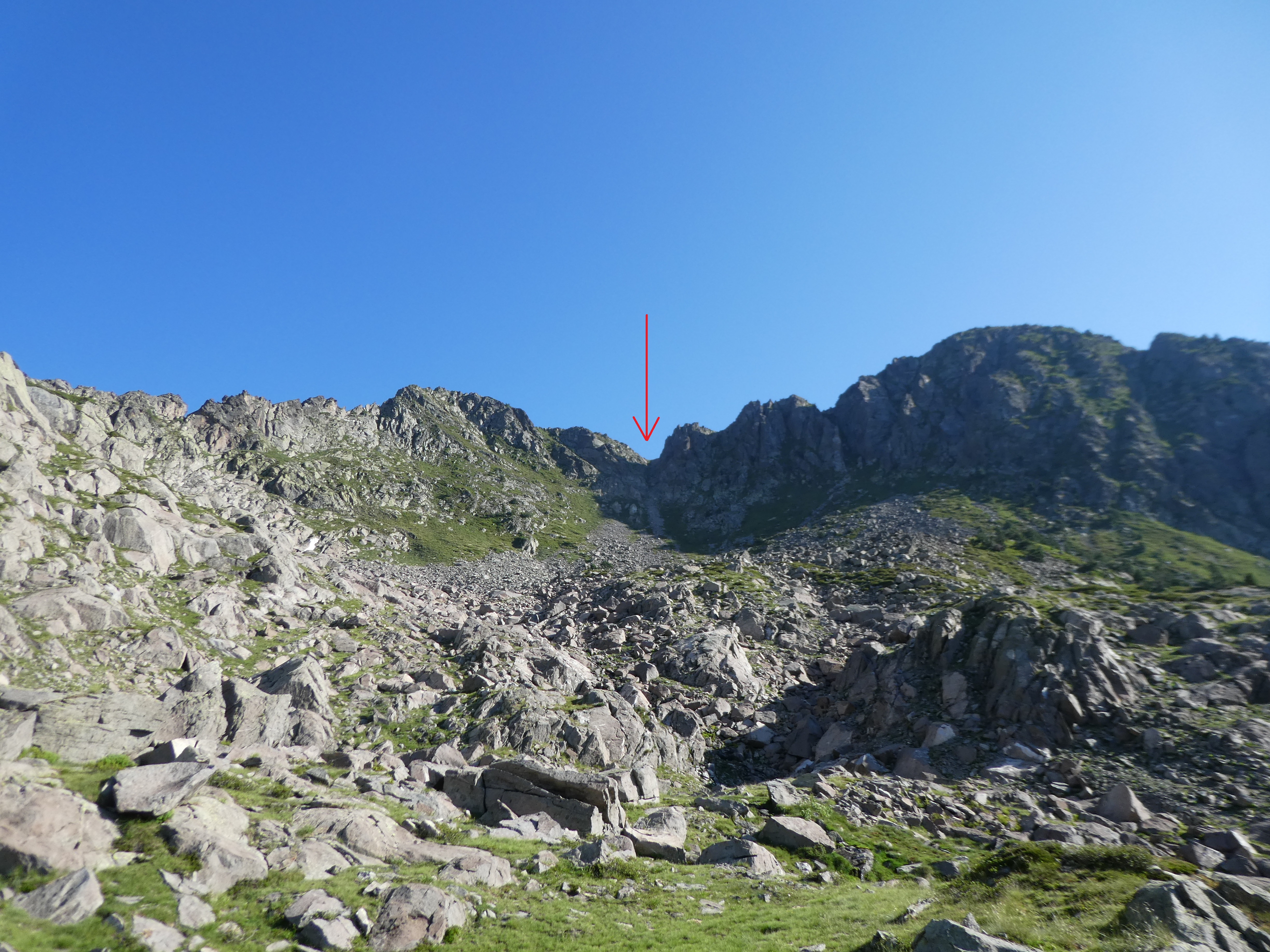 Dès que le verrou du Bac de la Portella est franchi (500 mètres après le précédent croisement), viser le pied de la brèche du Pic de Baxouillade en prenant une direction plein Nord direction Pic de Baxouillade