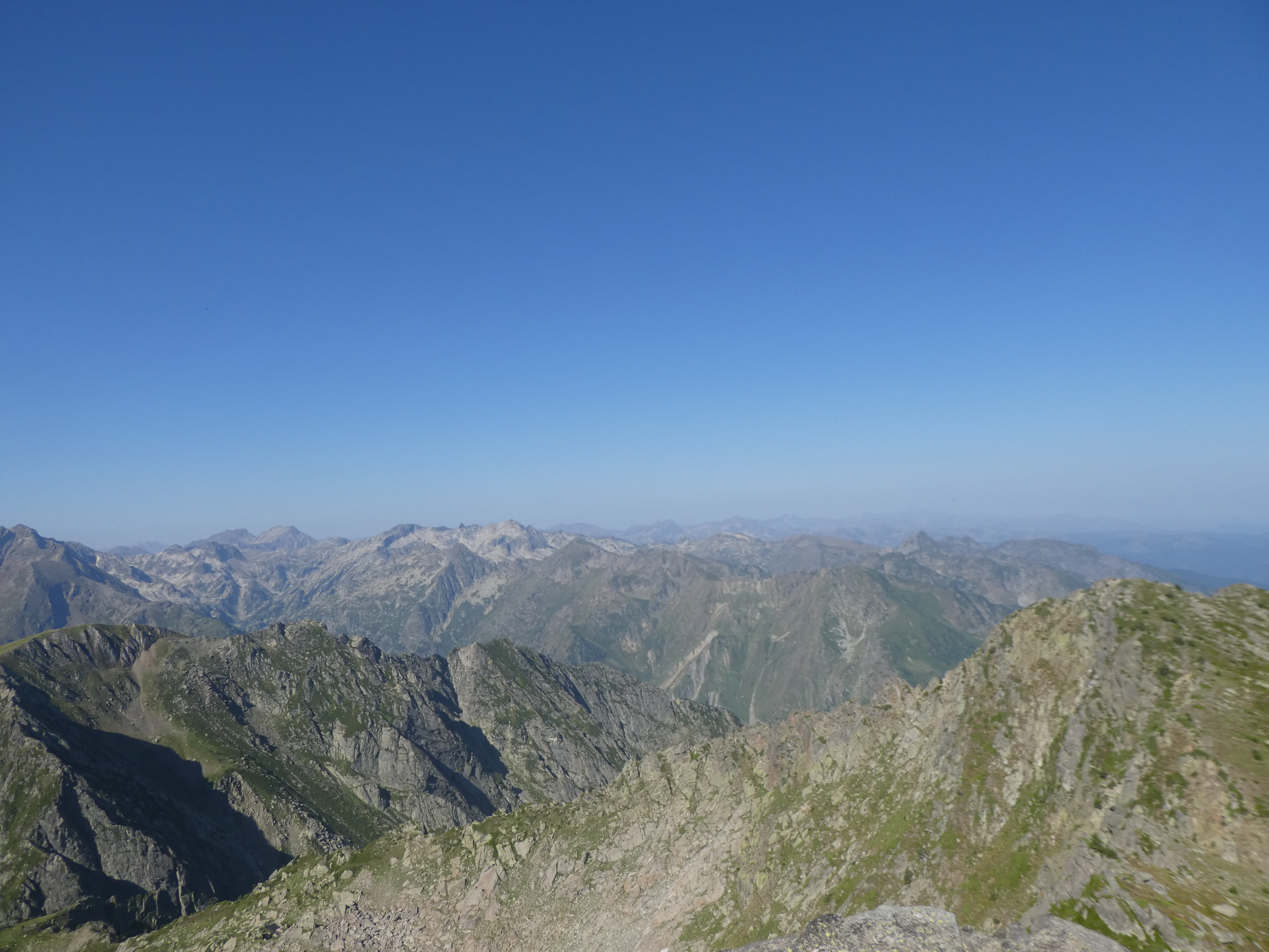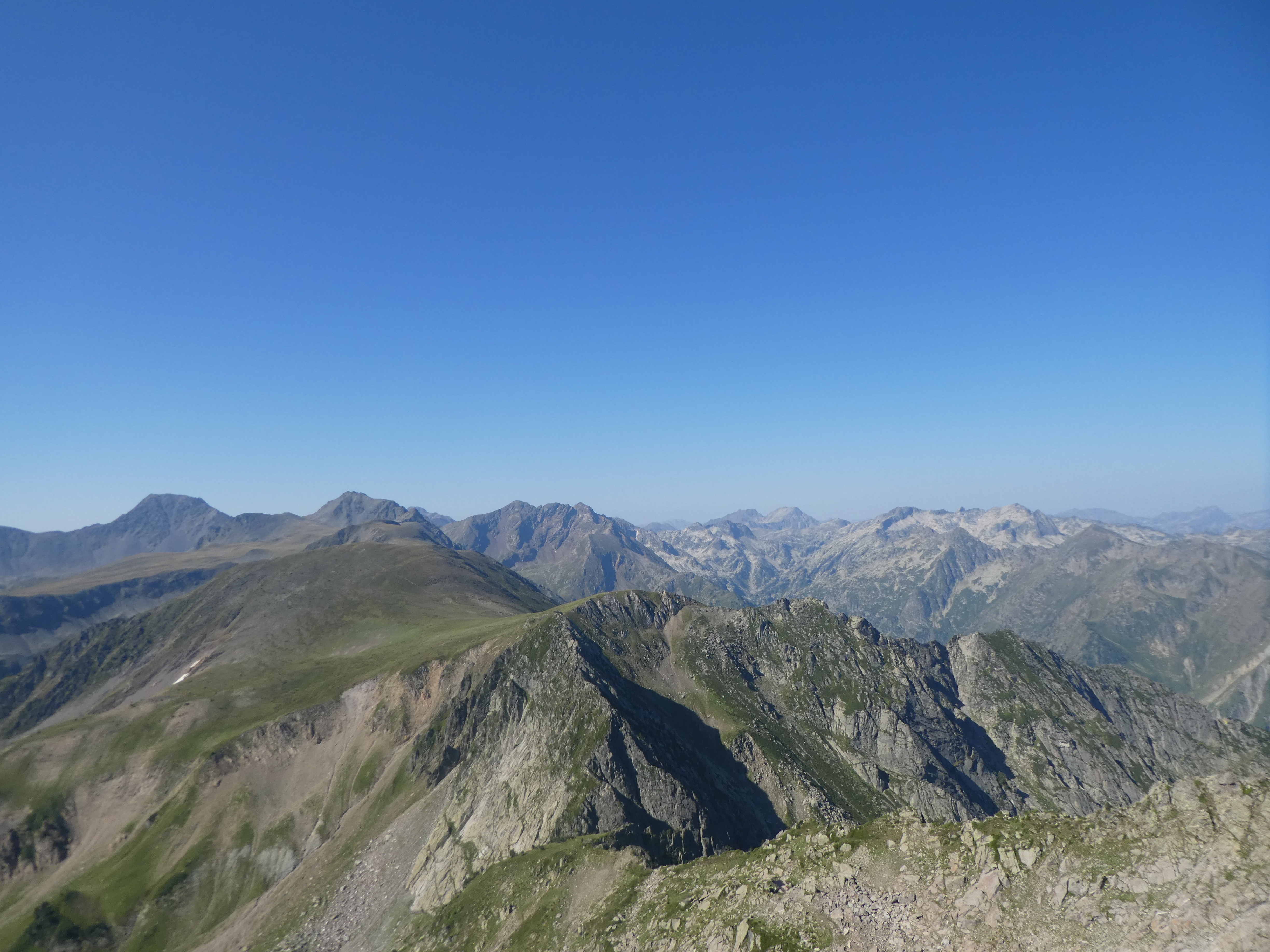 Arrivée au sommet du Pic de Baxouillade (2546 m) : beau panorama sur les sommets du Capcir, de la Cerdanya, de l'Andorre, de la Haute-Ariège, du Pays de Tarascon, des Monts d'Olmes, des Pyrénées Audoises, des Corbières, du Conflent et de la Cerdanya