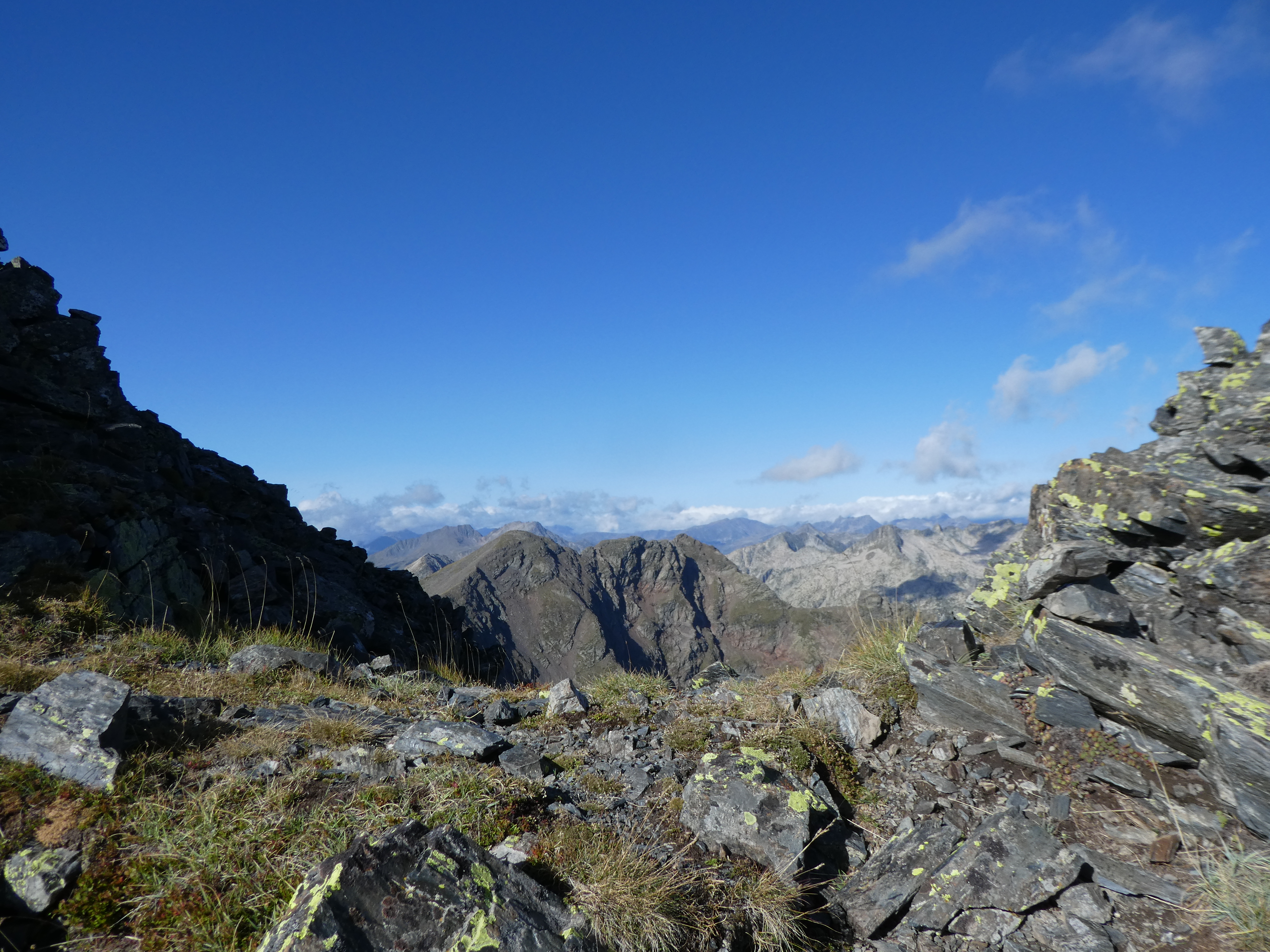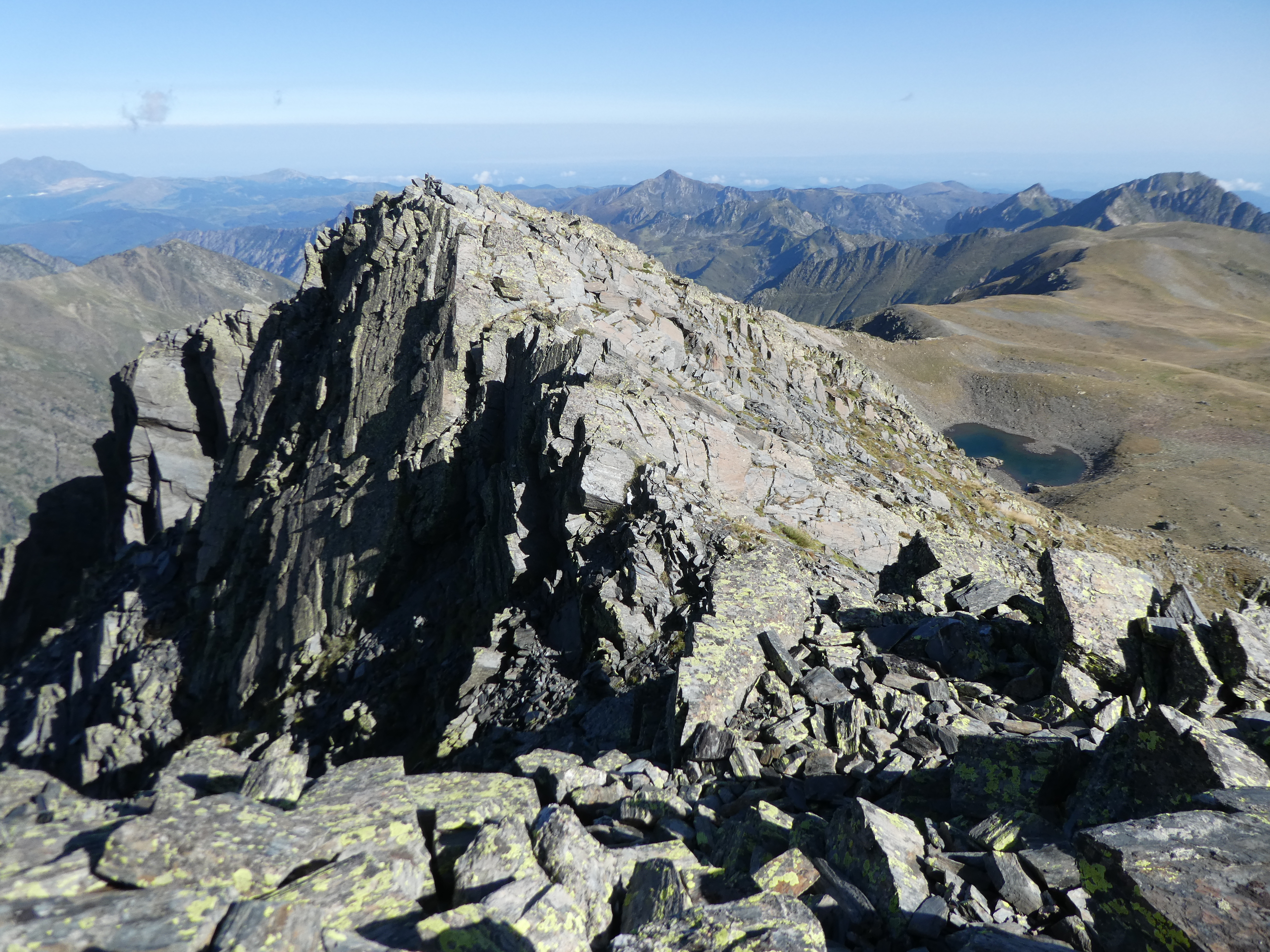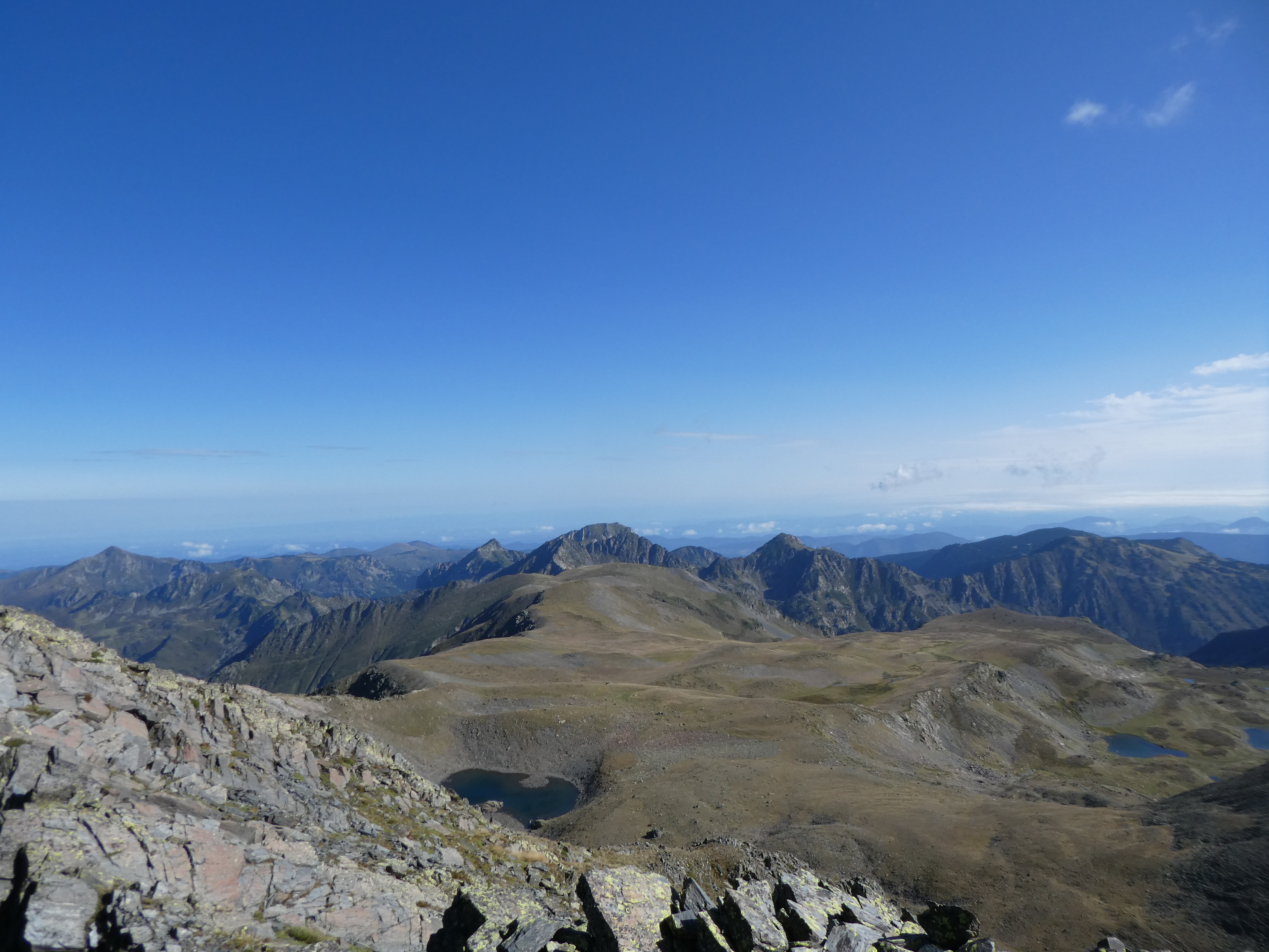 Arrivée au sommet du Puig de la Portella Gran (2765 m) : panorama semblable à celui du Puig de Camporells avec vue plus étendue sur les sommets de la Cerdanya, de l'Andorre et de la Haute-Ariège