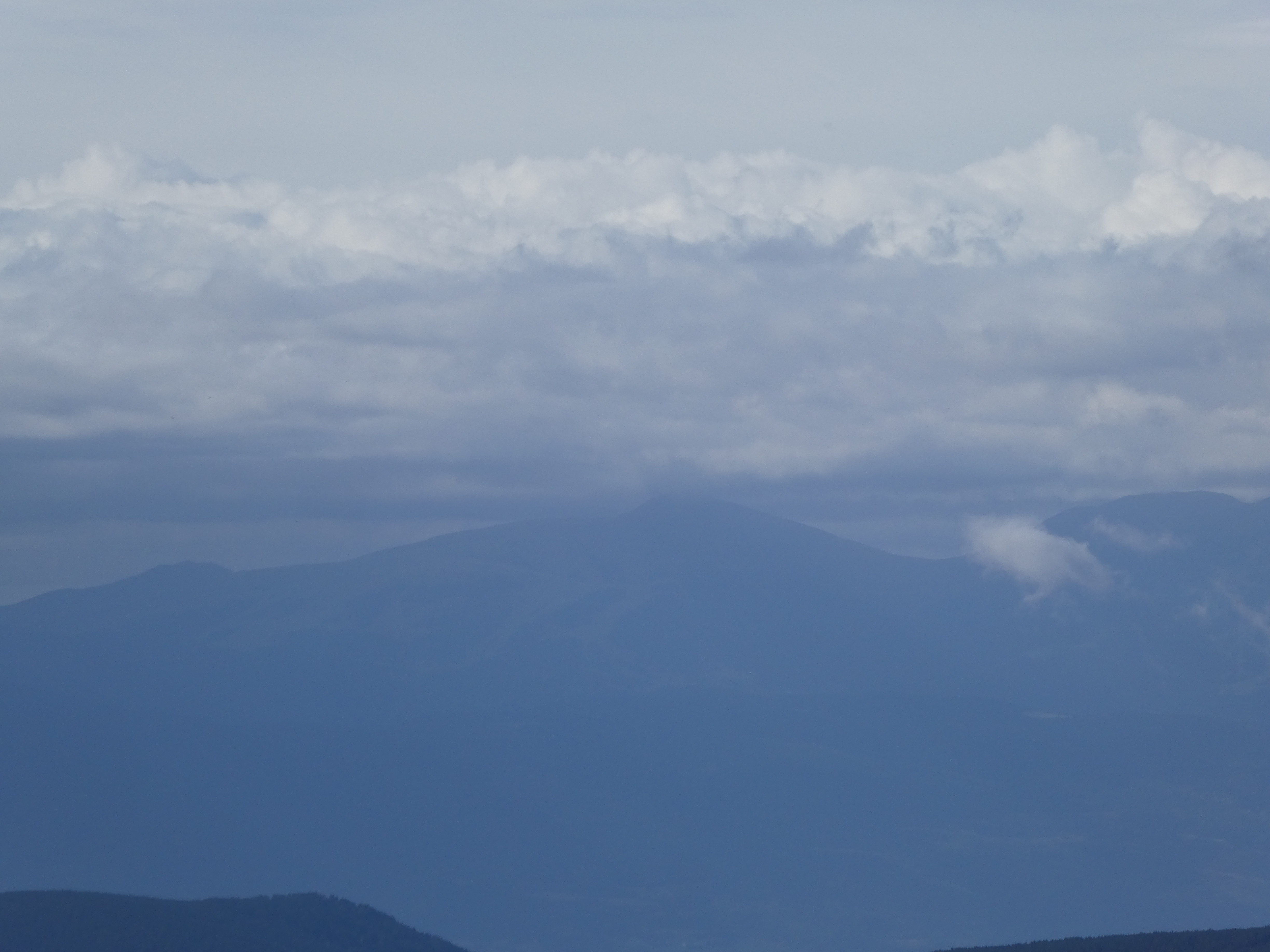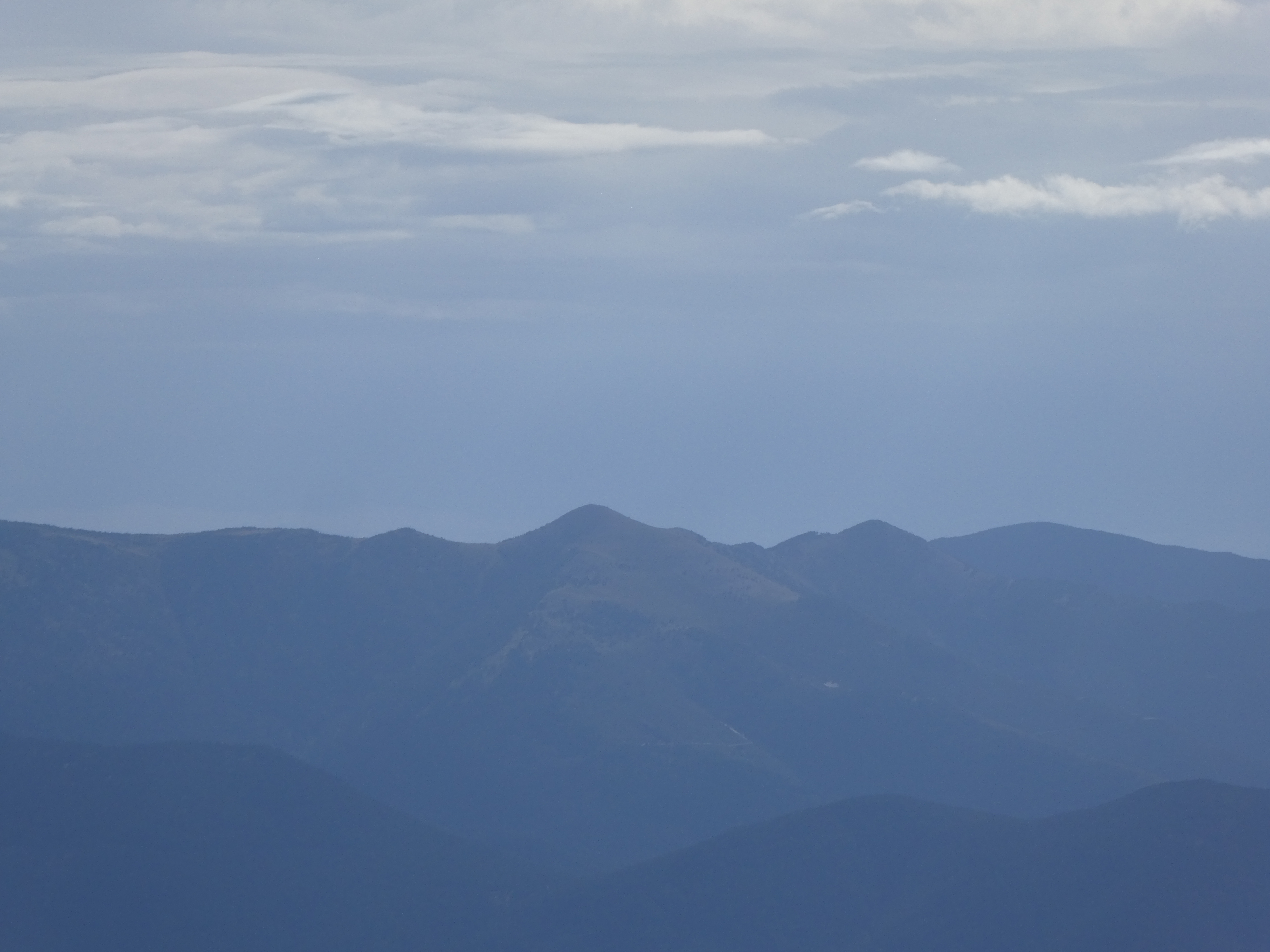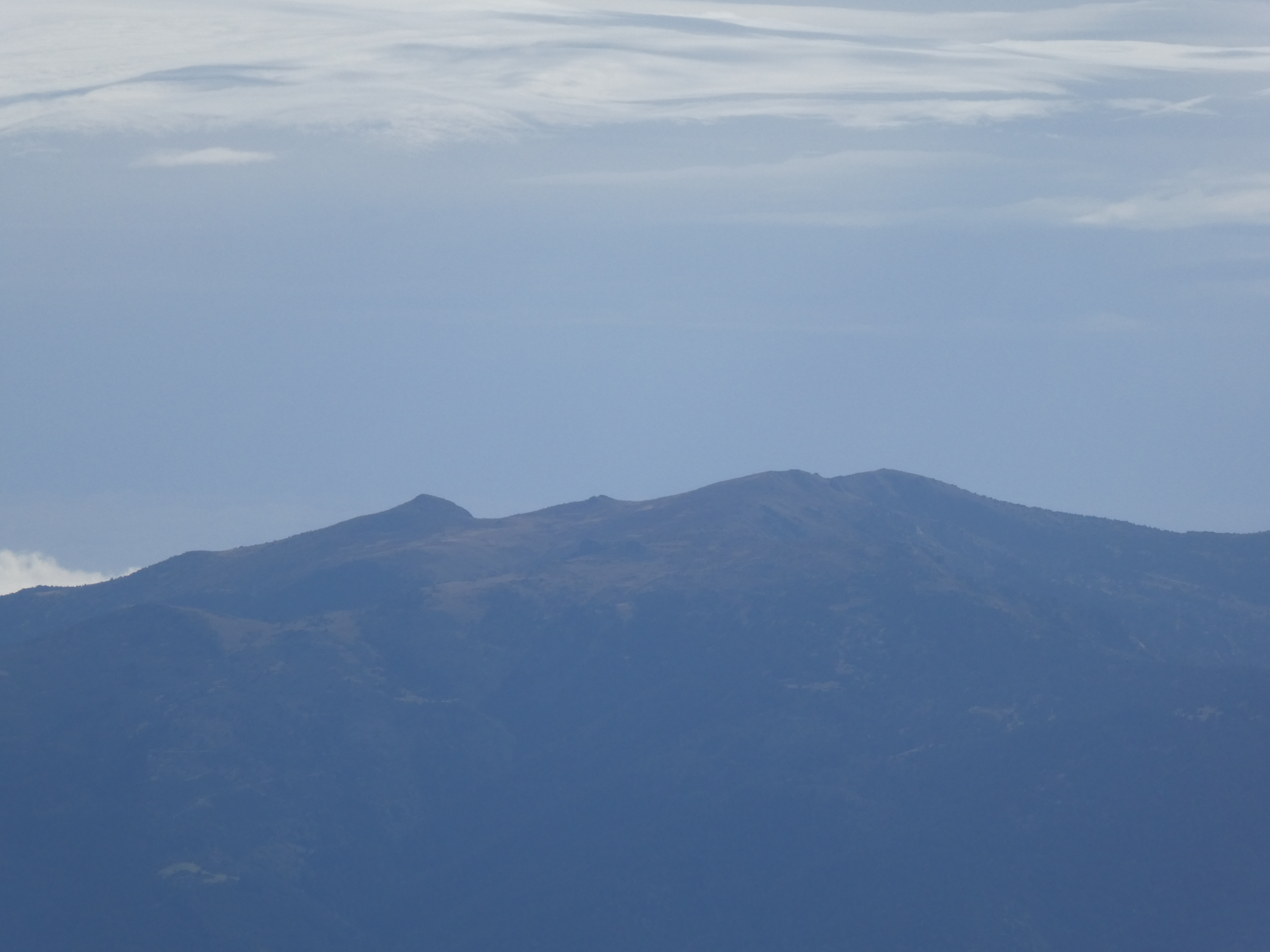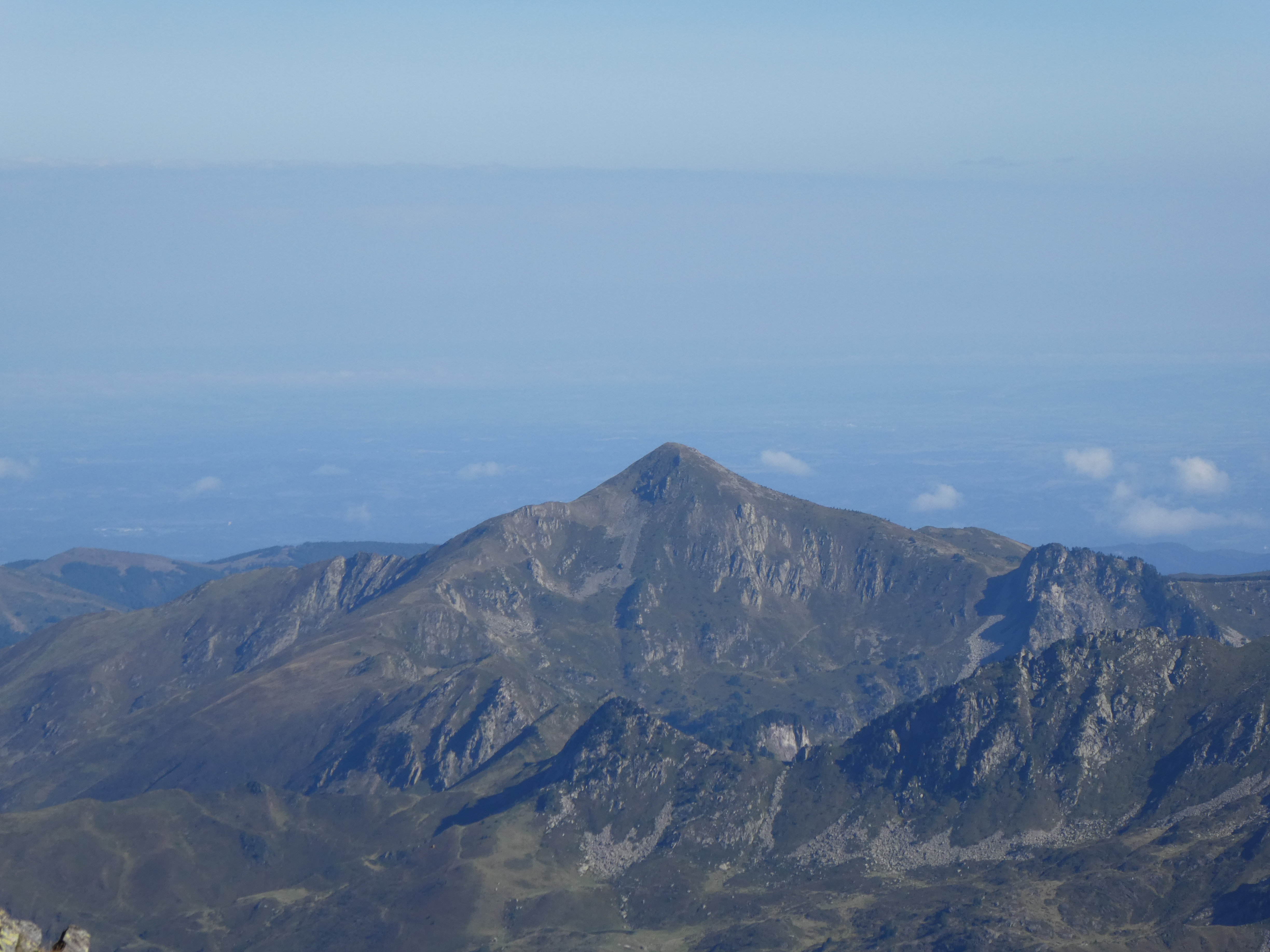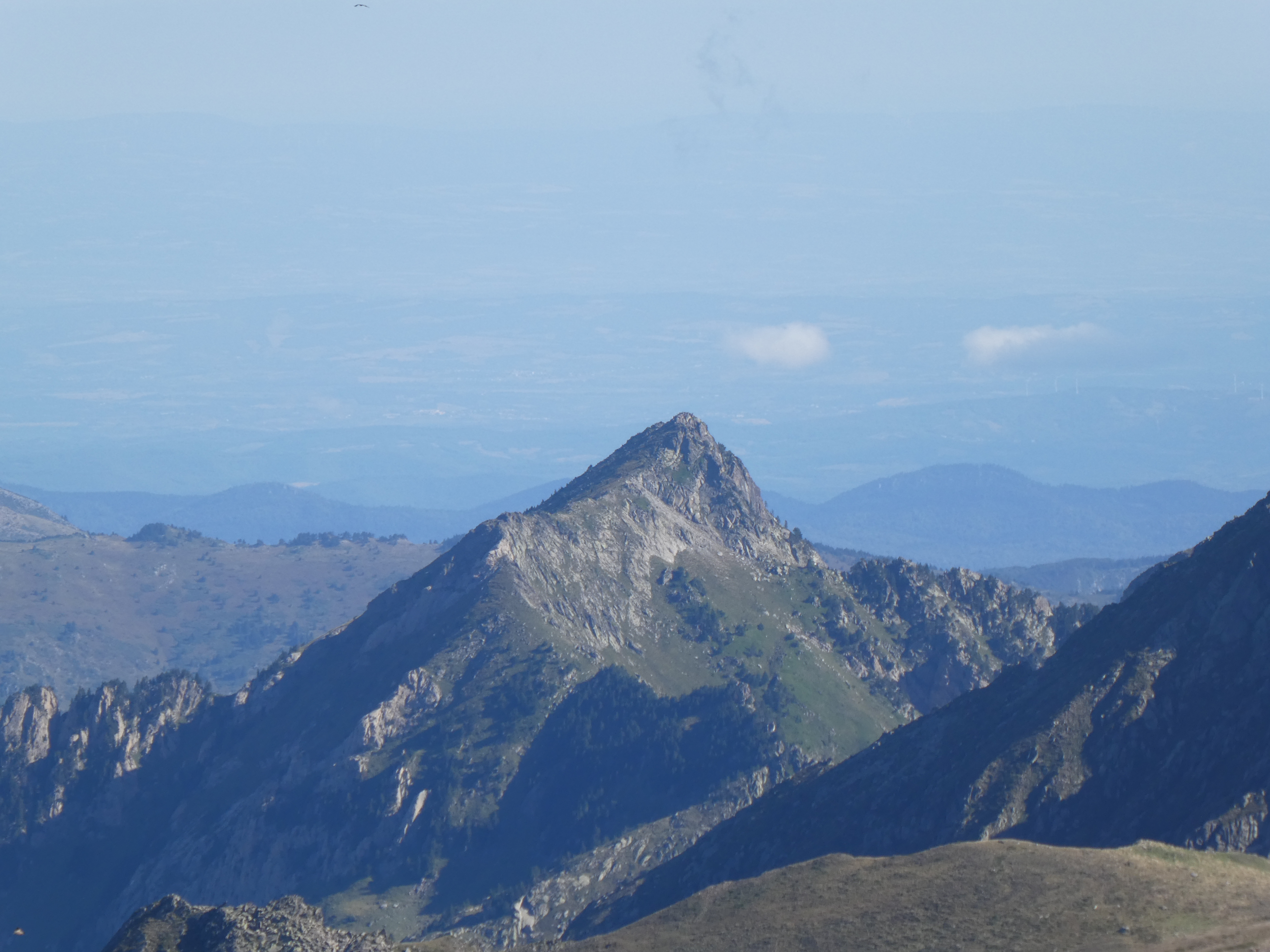Zoom sur le massif du Canigou avec le Pic du Canigou (2784 m) à gauche, le Puig del Roc Negre (2714 m) et le Puig dels Tres Vents (2731 m) au centre, et le Puig Rojà (2724 m) à droite ... en bas, on aperçoit la Pica Bastard (2093 m)
