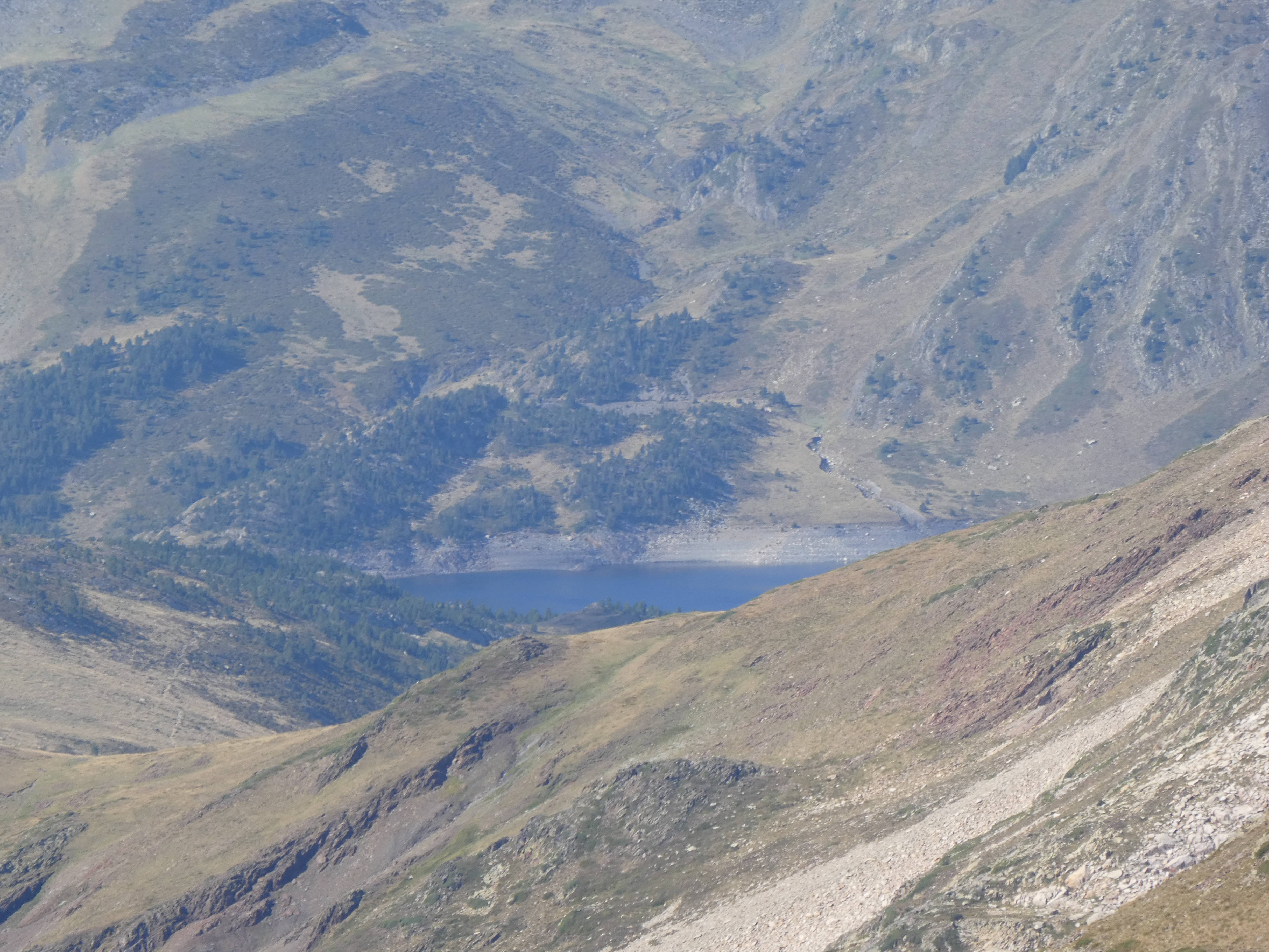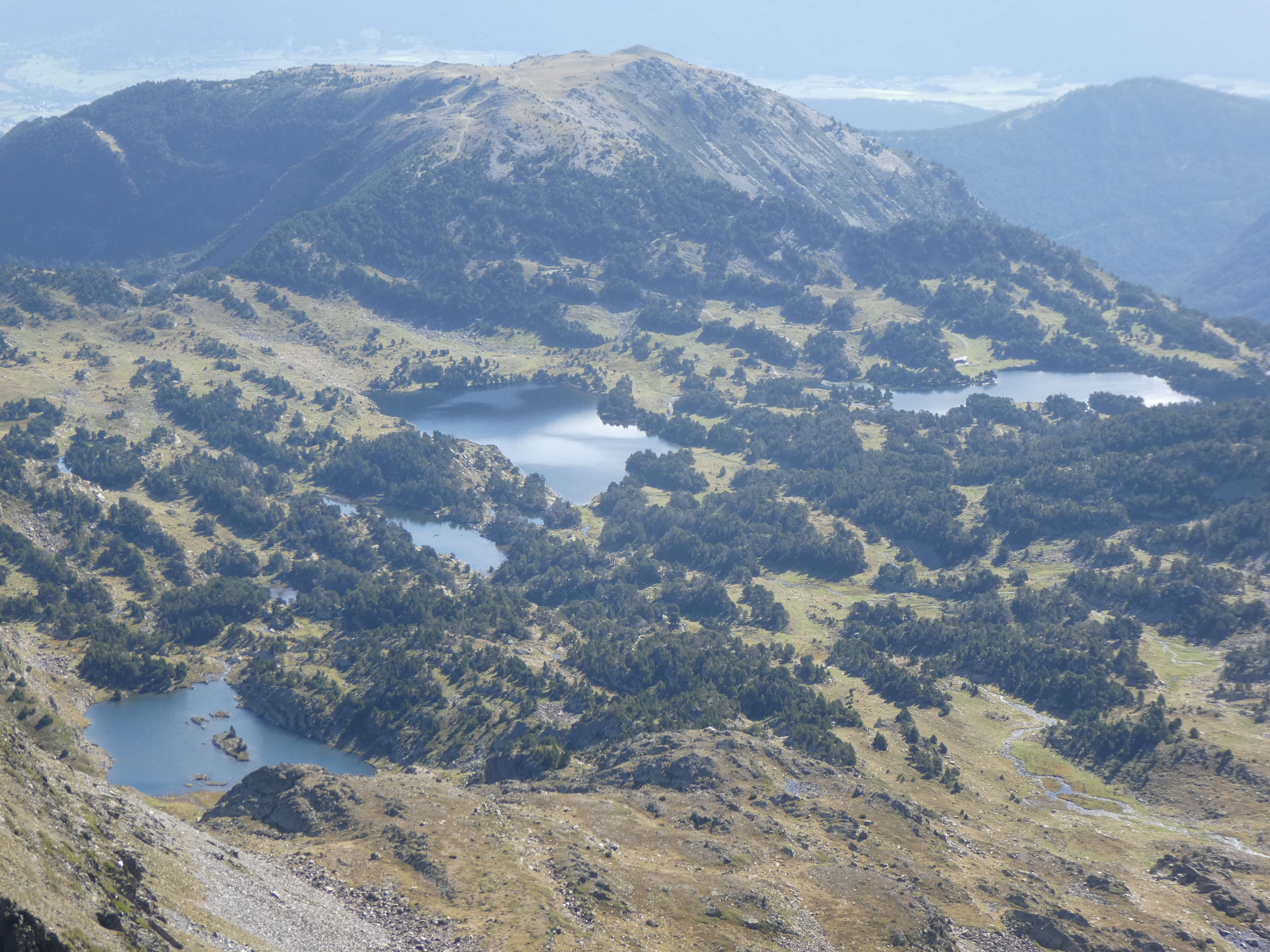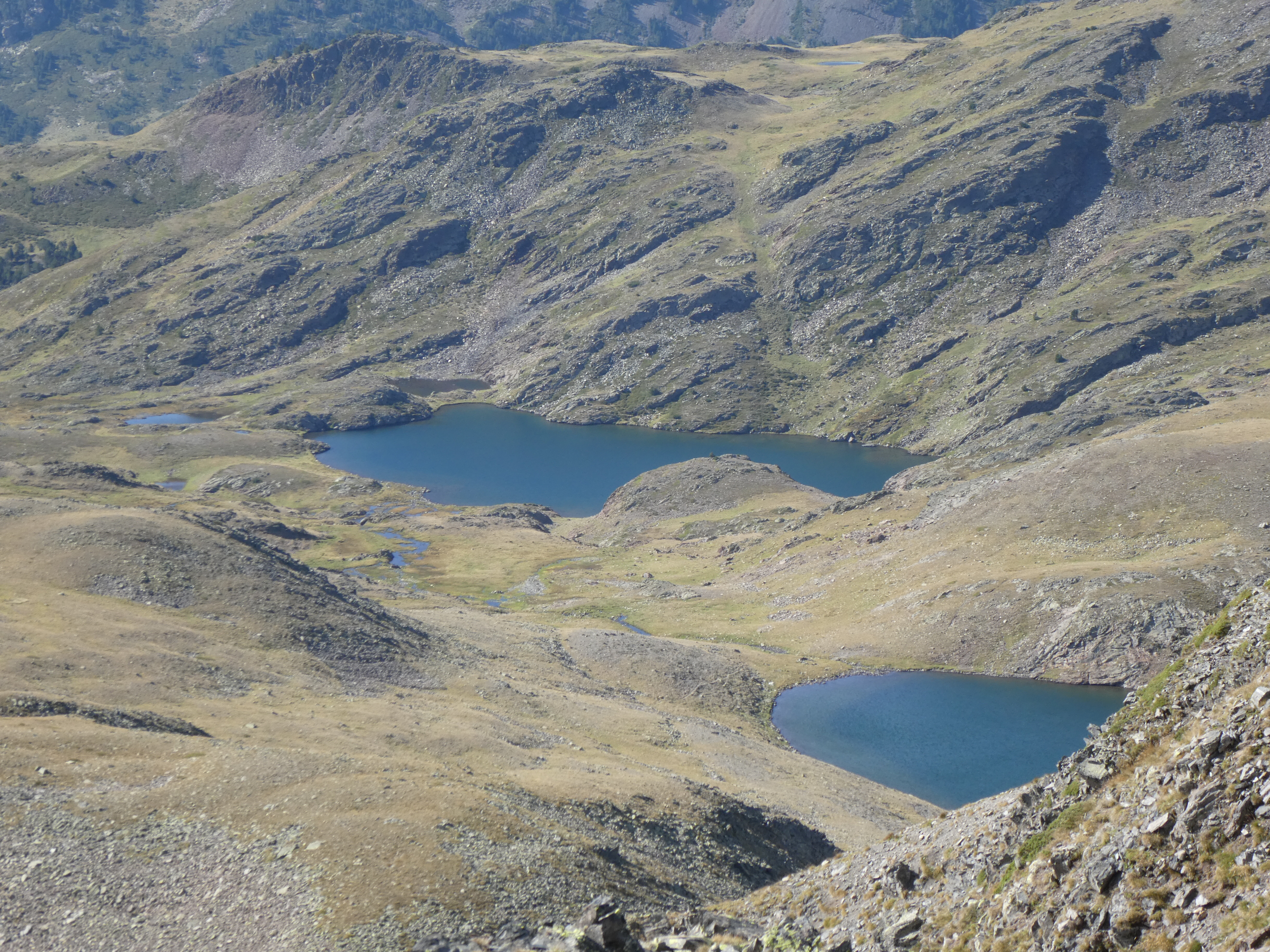 Zoom sur l'Estany Gros (2256 m) au centre et l'Estany del Mig (2240 m) à droite