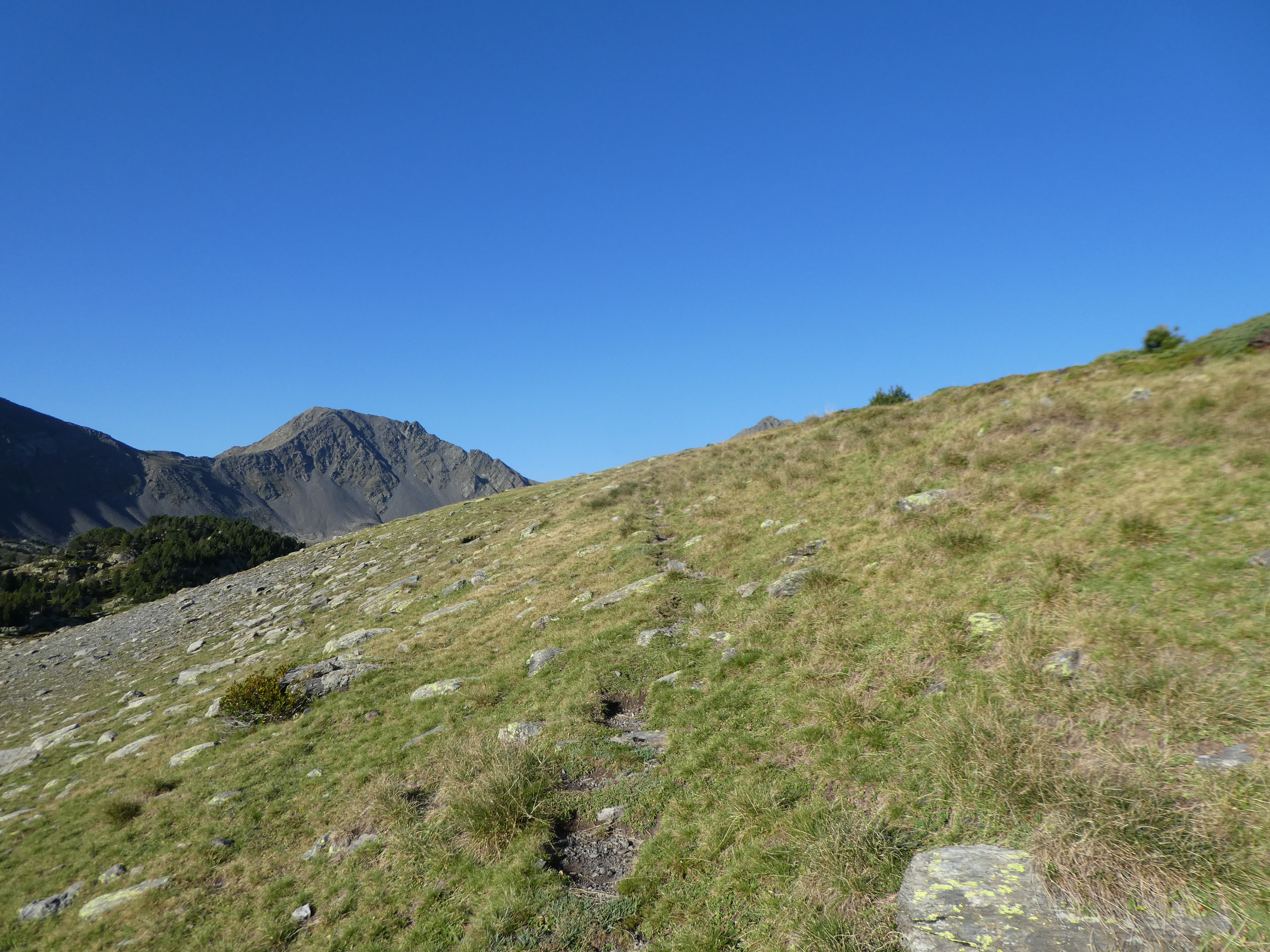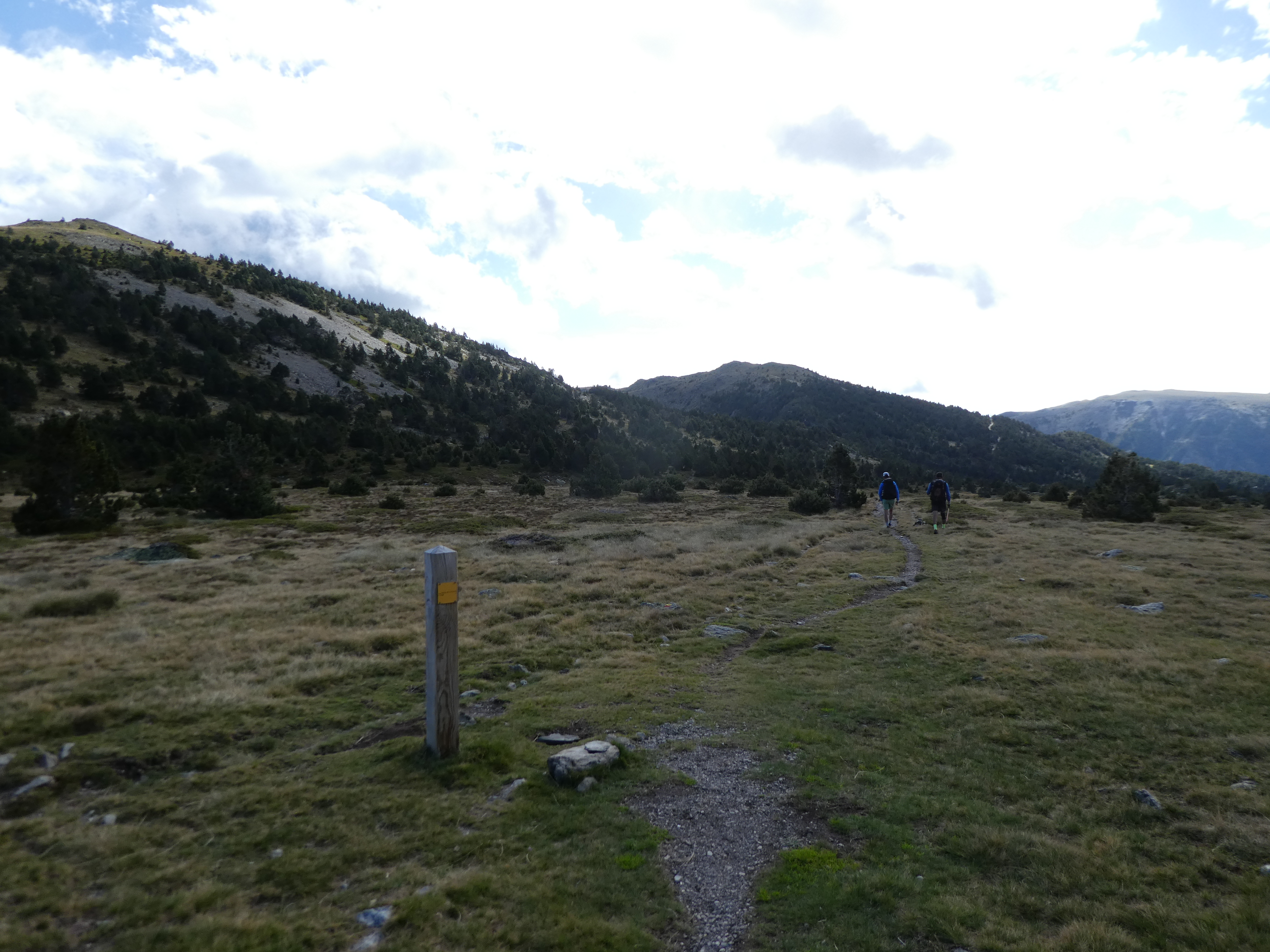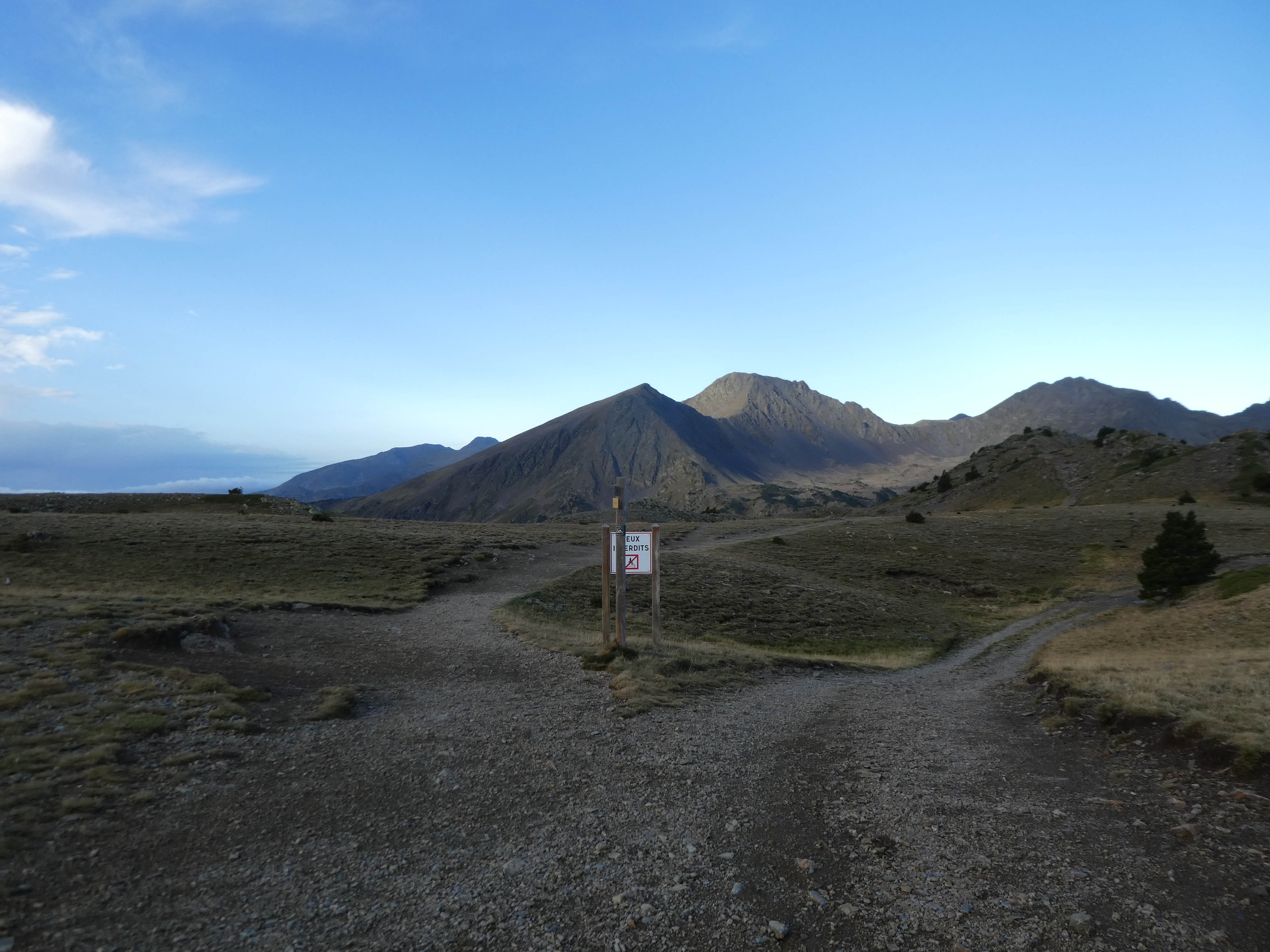 A ce croisement avec le chemin de descente vers le Coll de la Muntanyeta (600 mètres après le précédent), suivre ce dernier partant sur la droite direction Estany Gros, aucun balisage dorénavant (le sentier partant sur la gauche mène directement au Refuge des Camporells)