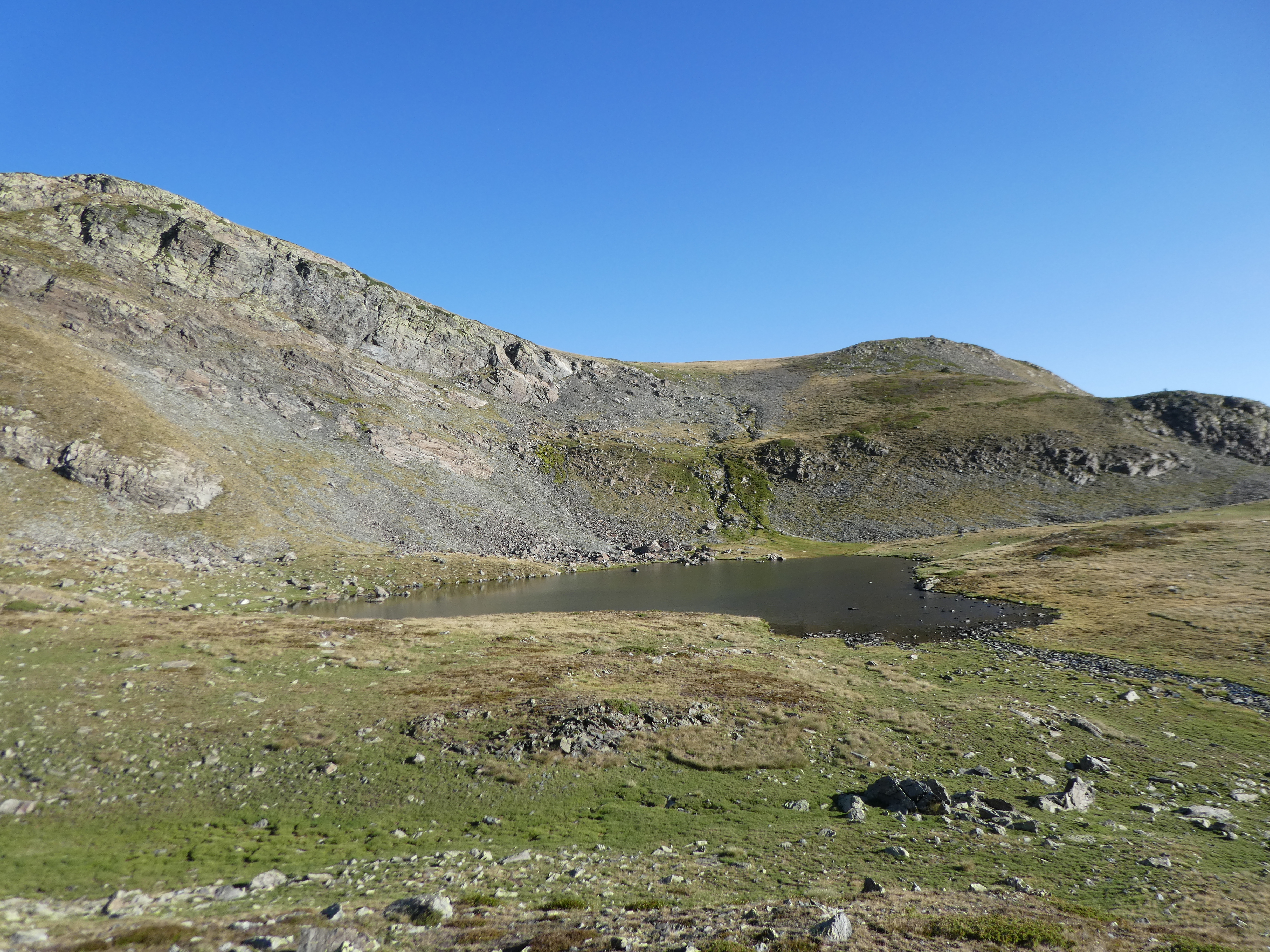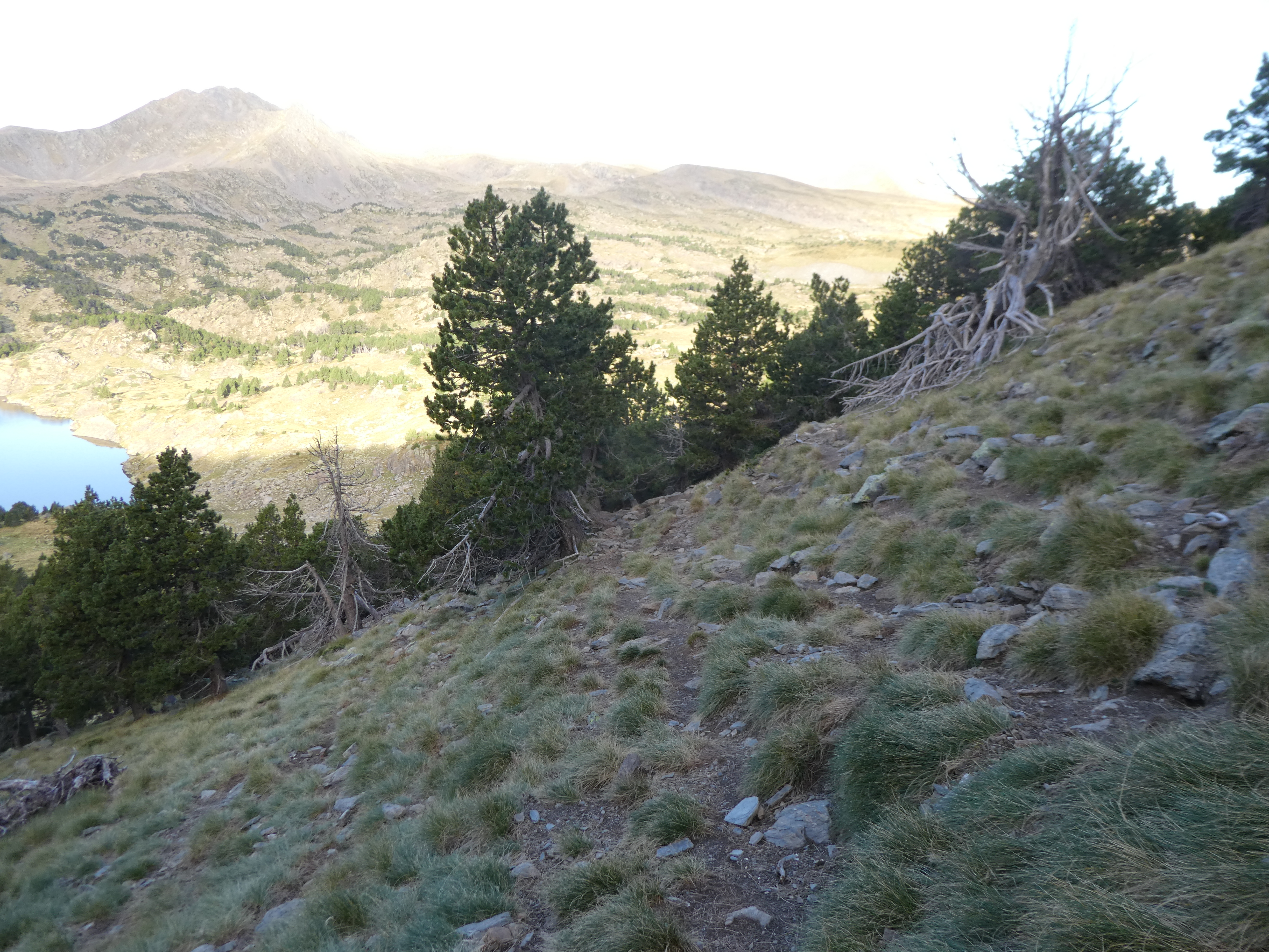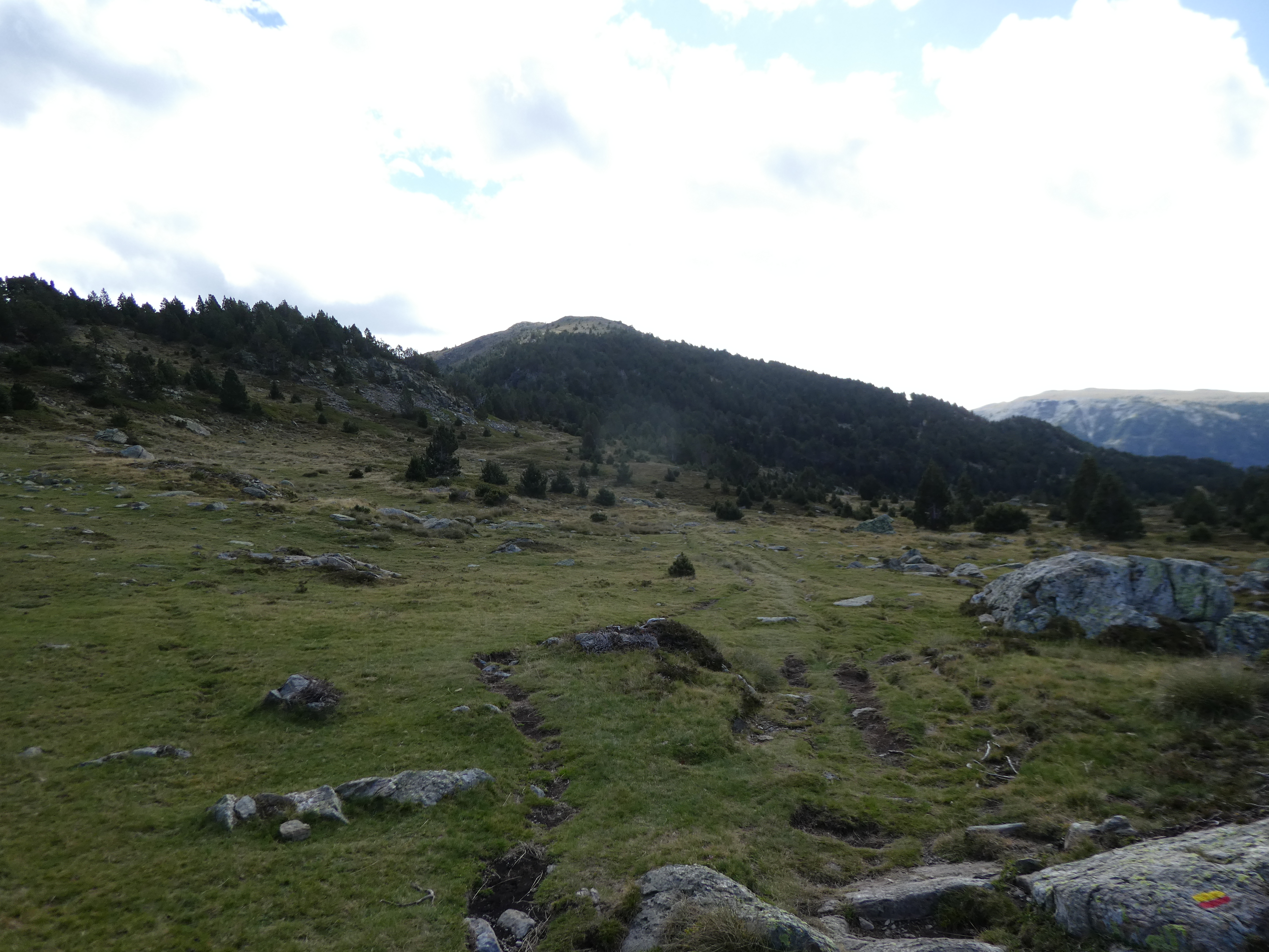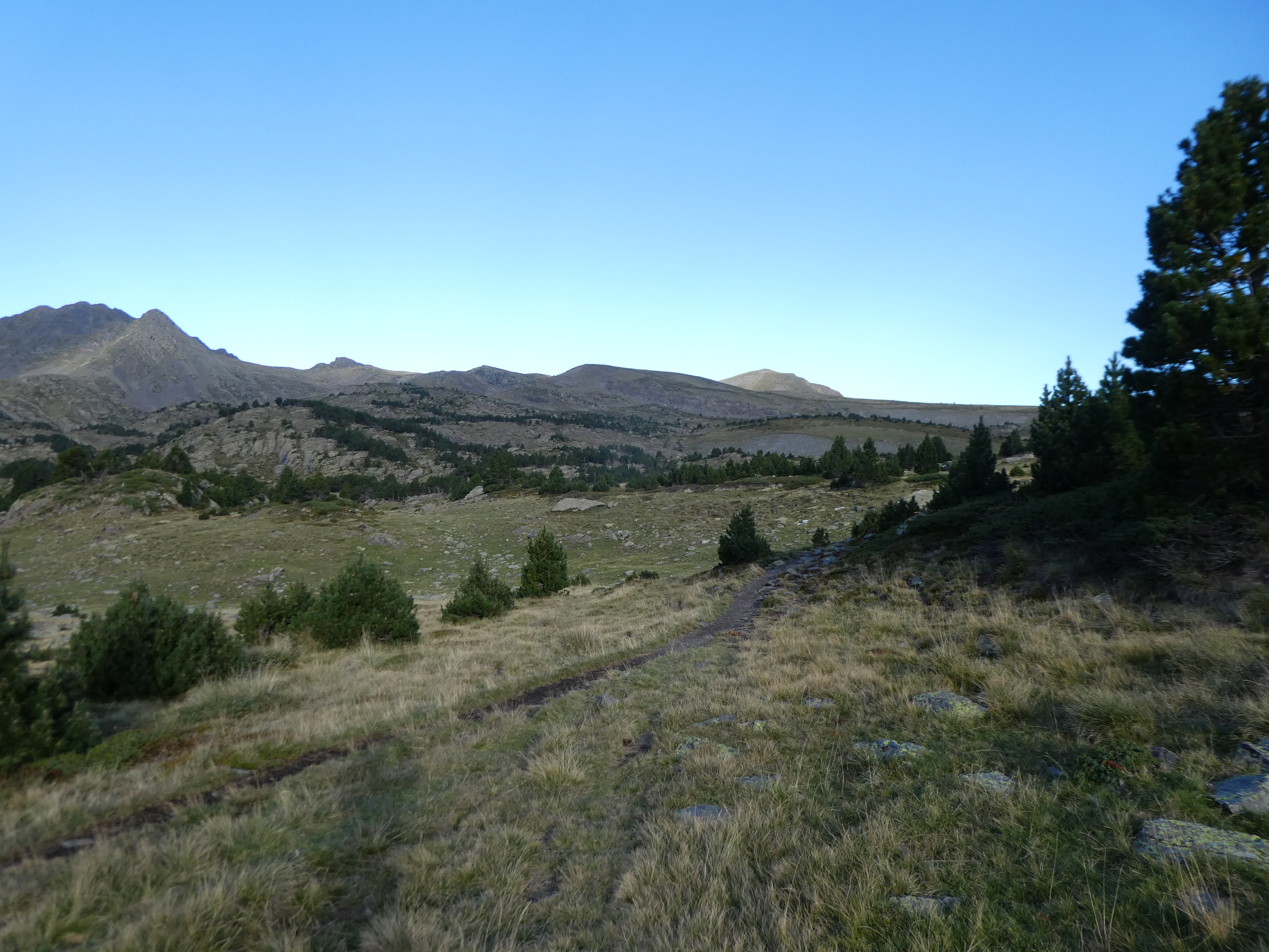 A ce croisement avec le chemin de descente vers le Coll de la Muntanyeta (600 mètres après le précédent), suivre ce dernier partant sur la droite direction Estany Gros, aucun balisage dorénavant (le sentier partant sur la gauche mène directement au Refuge des Camporells)