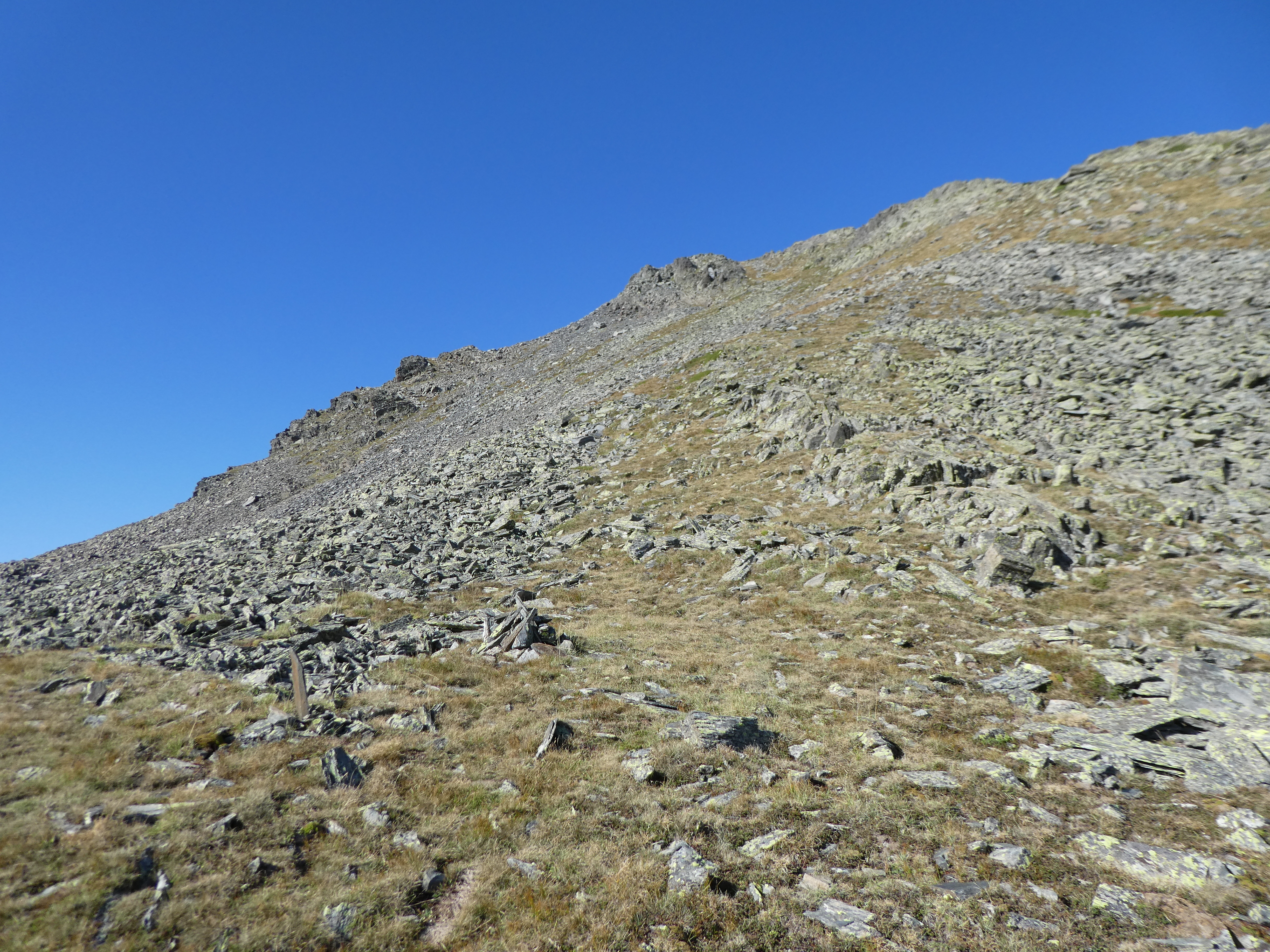 Dès que le pied du Puig de Camporells est atteint (1000 mètres après avoir quitté le deuxième étang), quitter l'itinéraire cairné partant tout droit pour monter hors sentier sur la gauche direction Puig de Camporells (ceux qui voudraient aller directement au Puig de la Portella Gran, continuer à suivre le semblant de chemin cairné partant tout droit)
