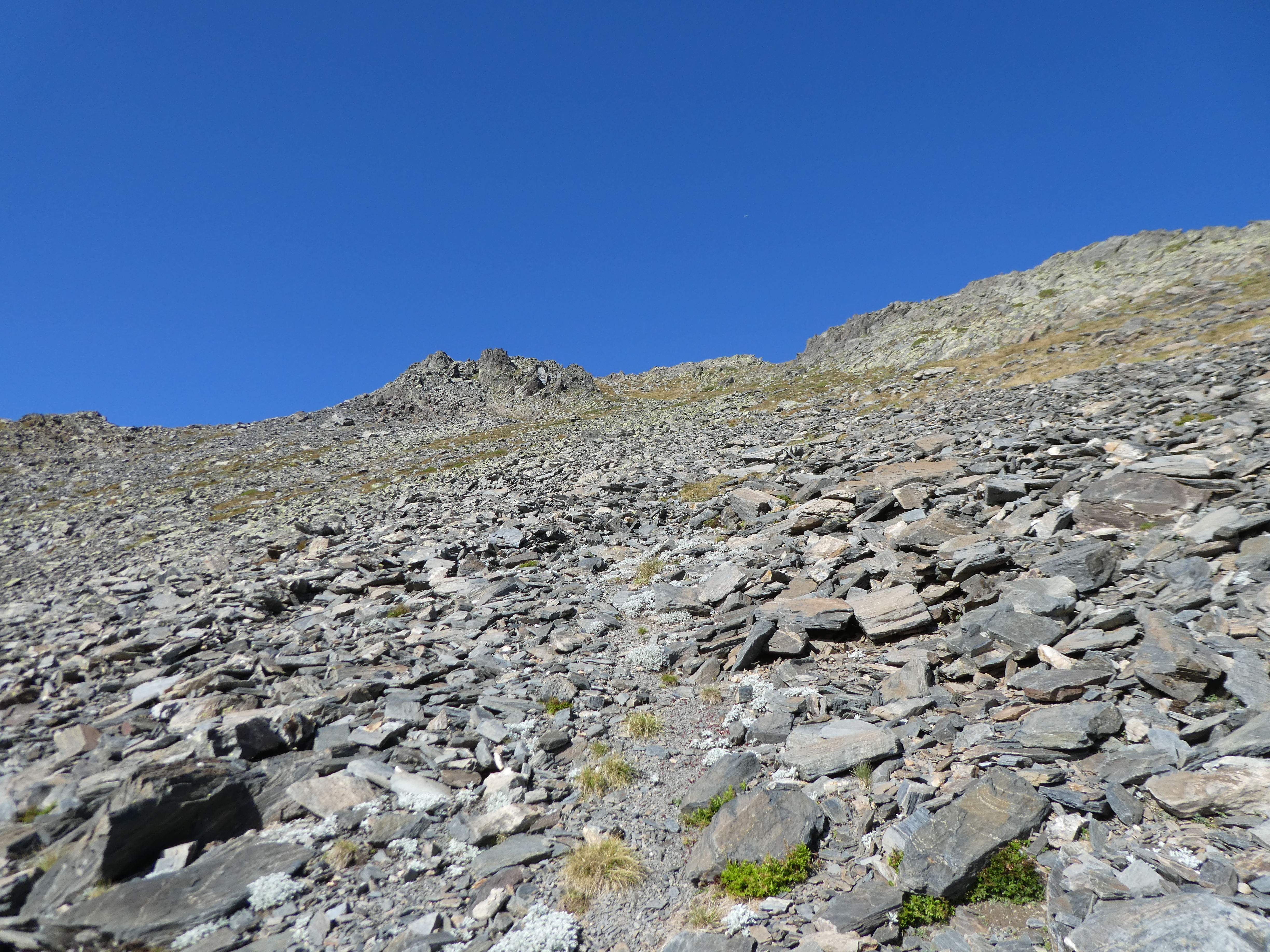 Vue sur la raide montée hors sentier vers le Puig de Camporells