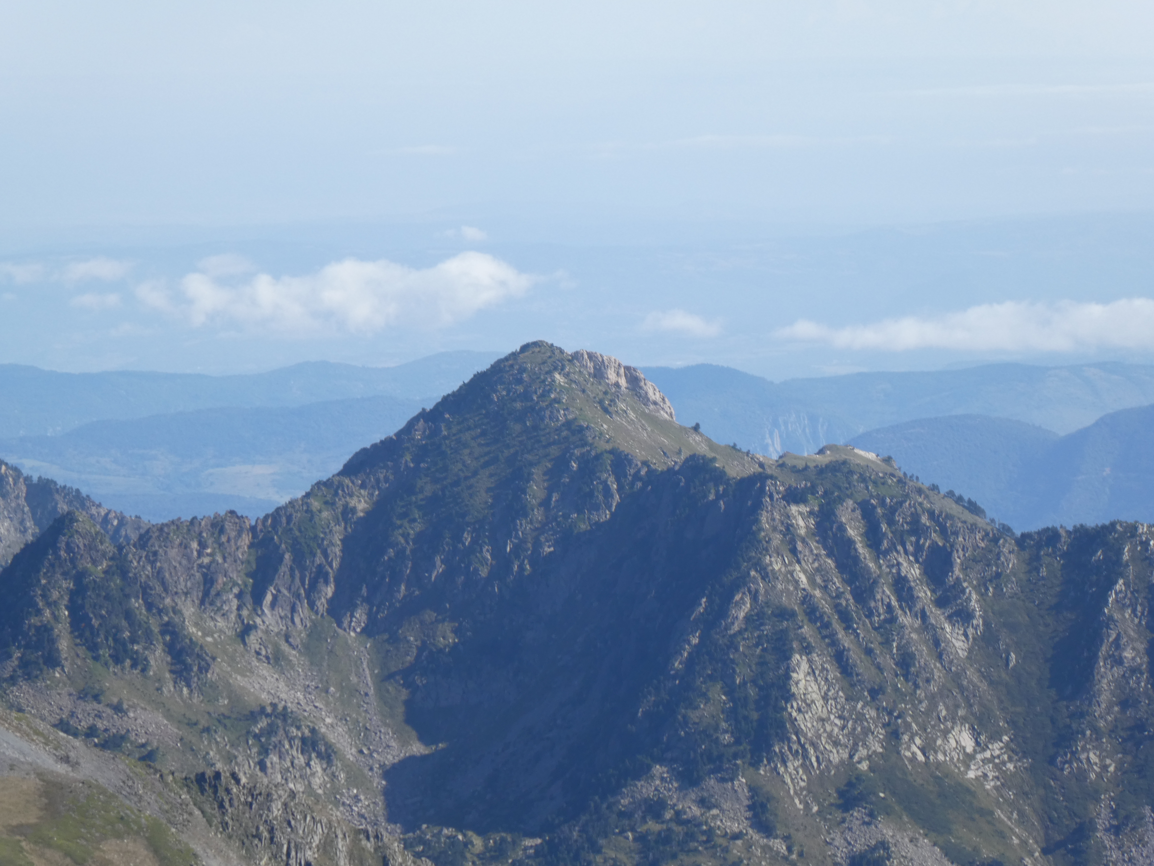 Zoom sur le Pic de Fontanette (2002 m) à gauche, et le Pic des Trois Seigneurs (2199 m) et le Pic de Pioulou (2166 m) à droite