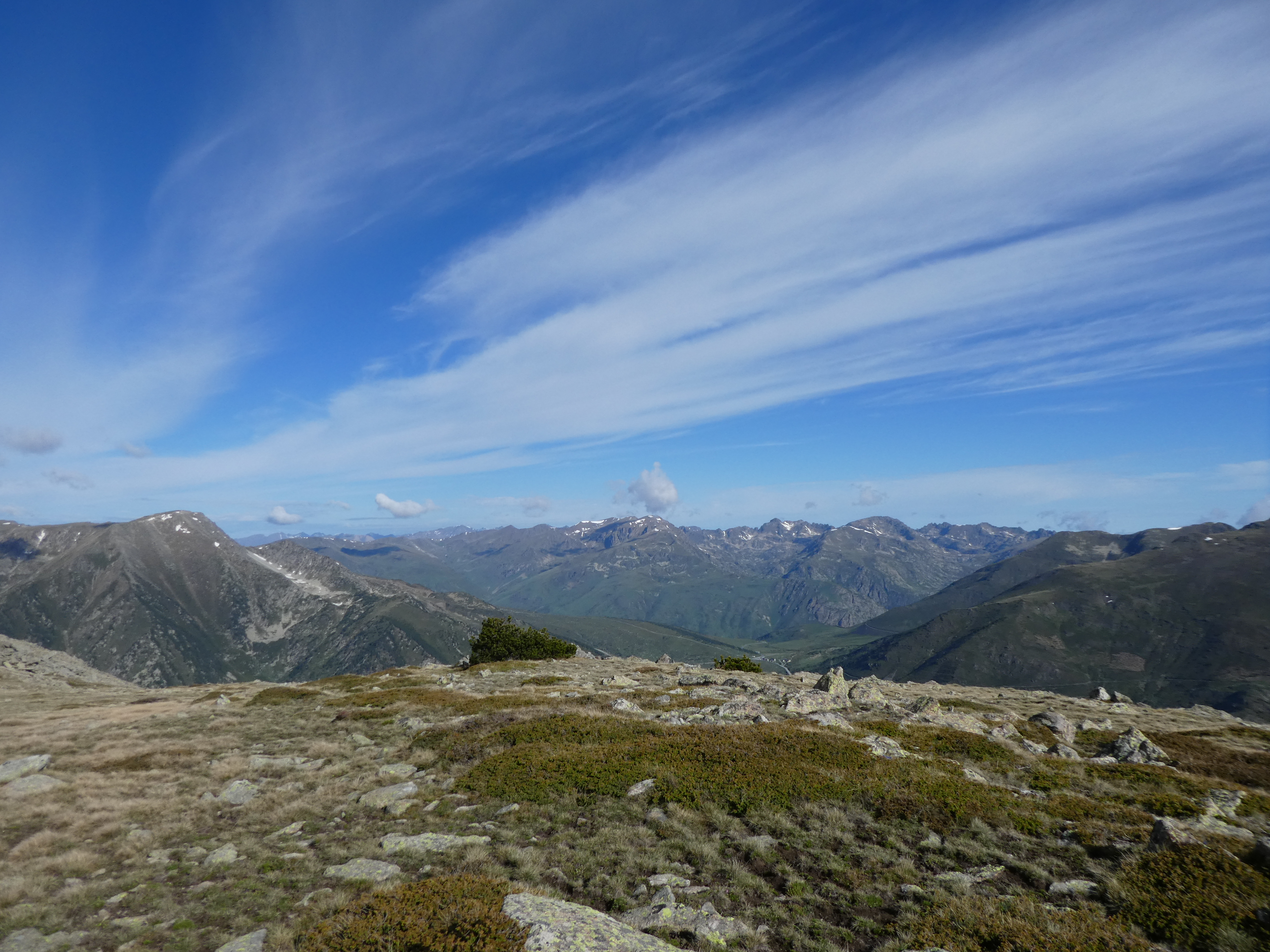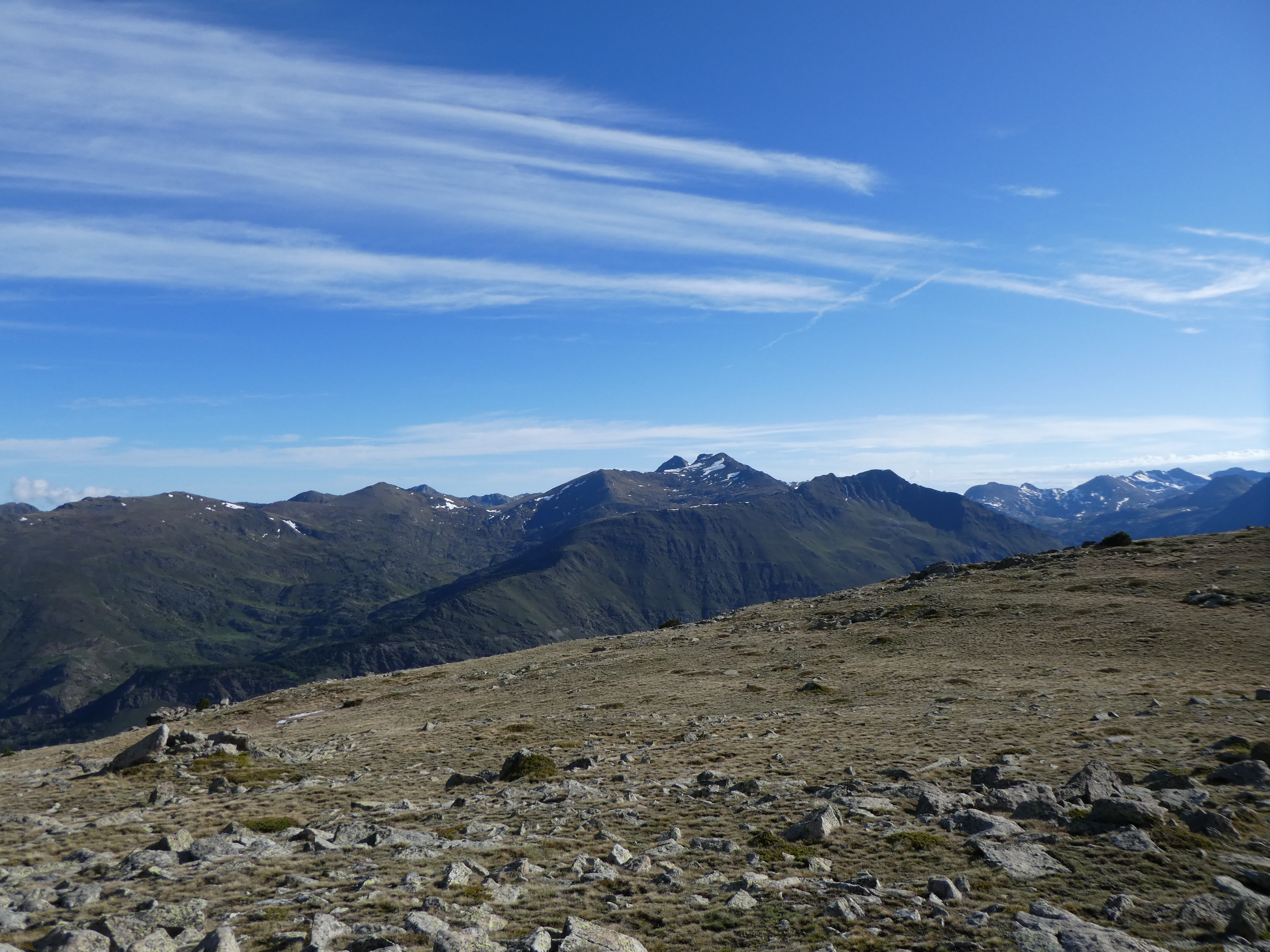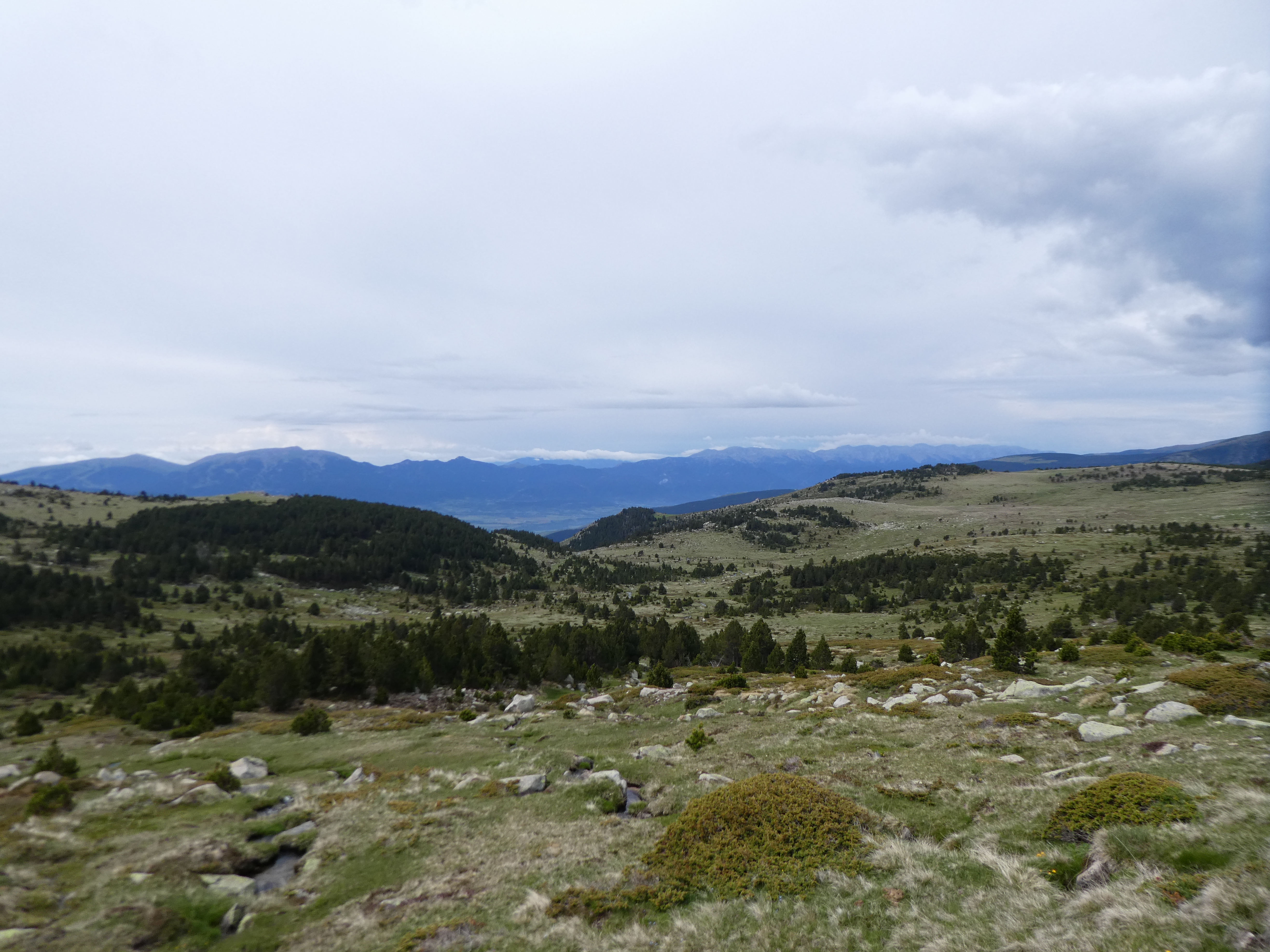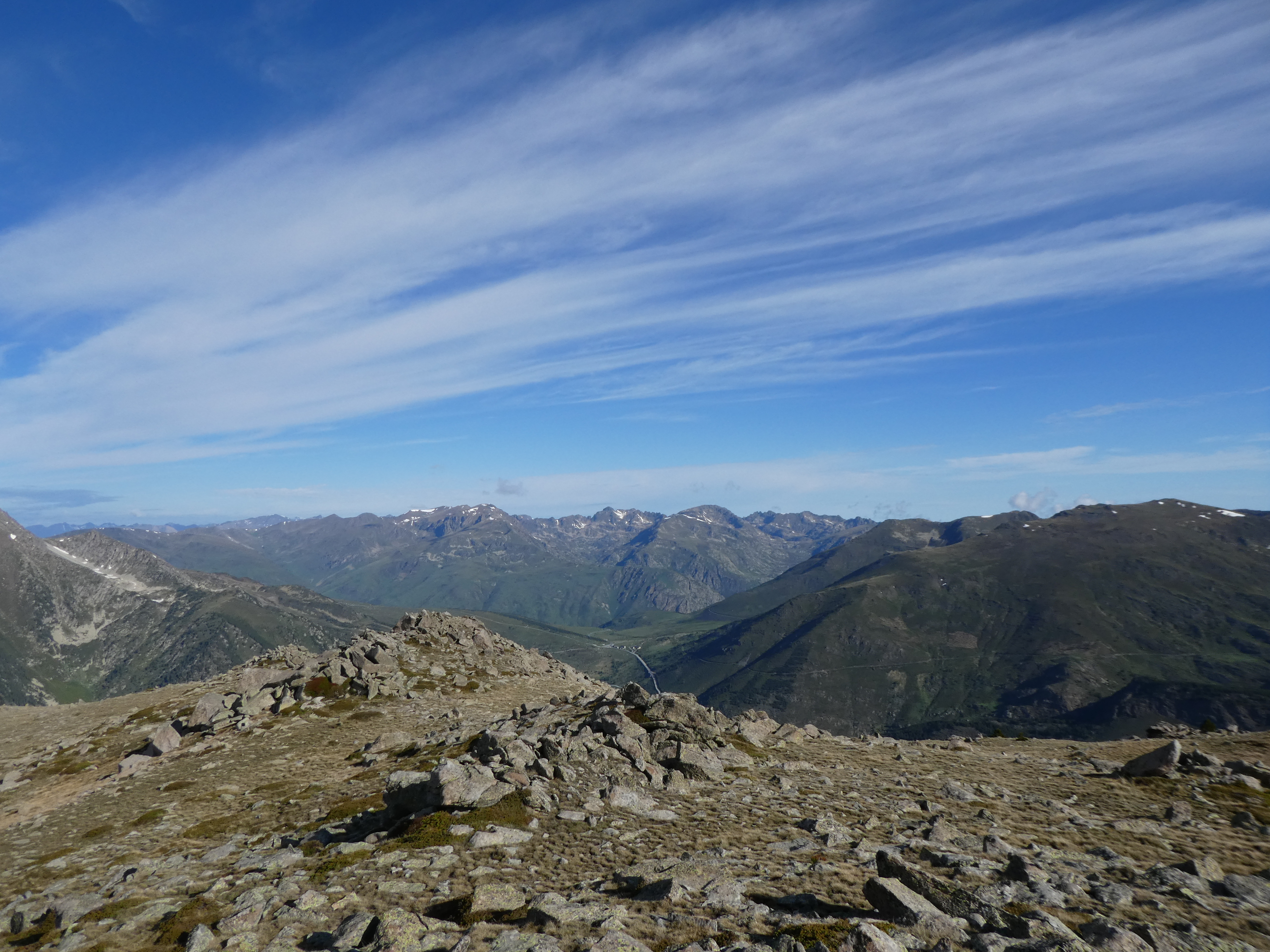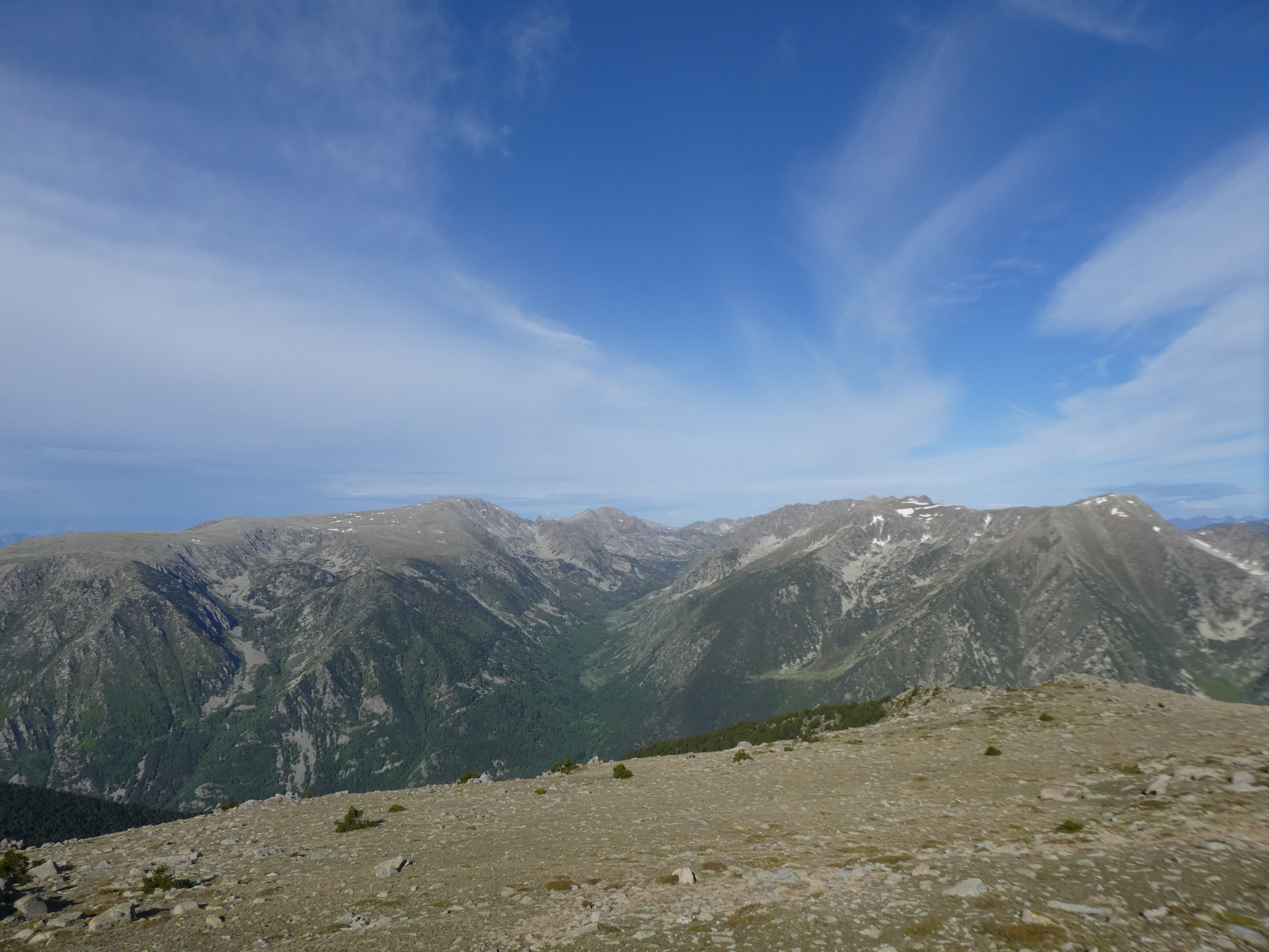 Arrivée au sommet de la Serra de la Portella de Bac d'Hortell (2574 m) : panorama semblable à celui d'el Punxó avec vue plus dégagée sur la Haute Vallée du Querol