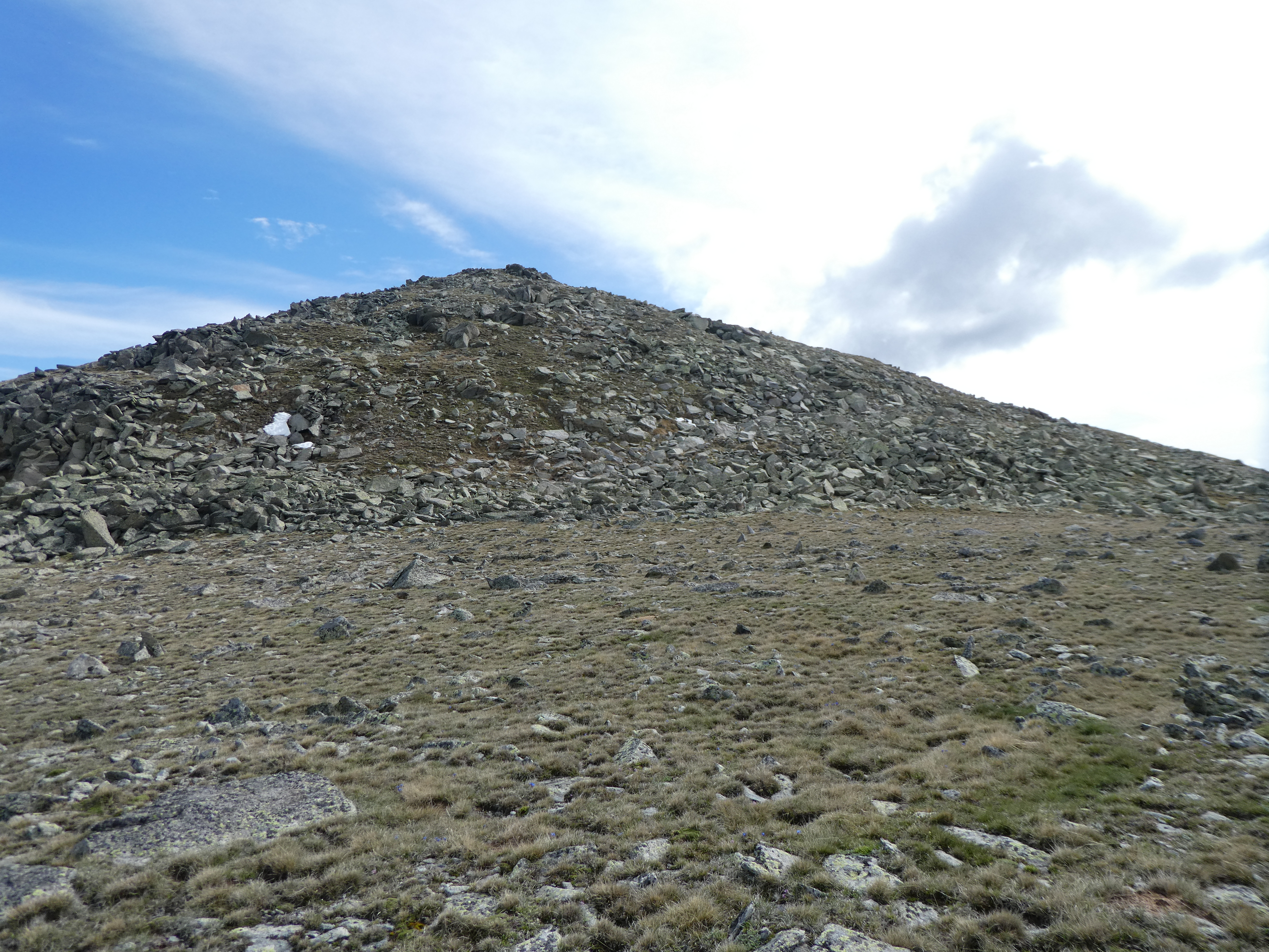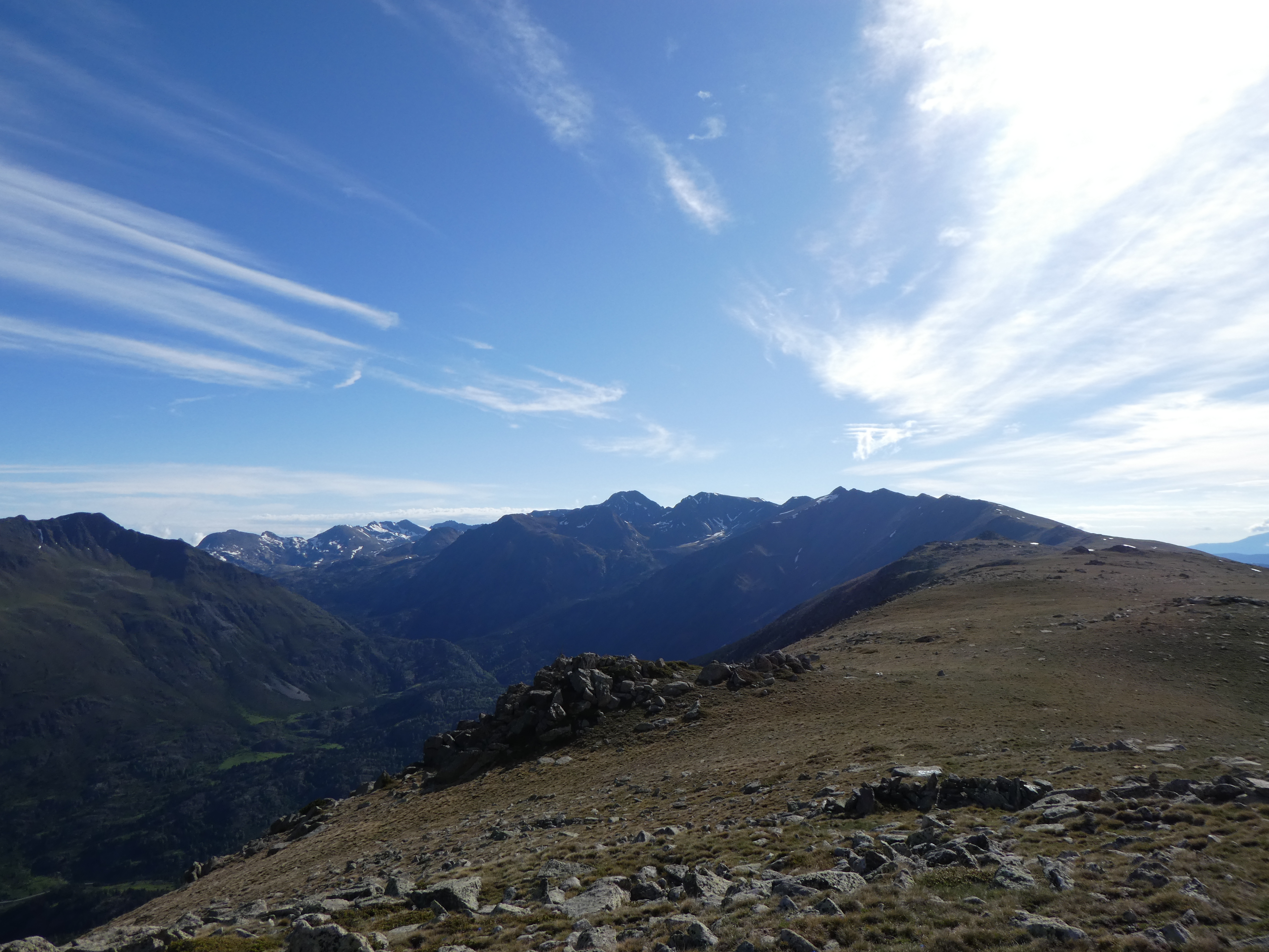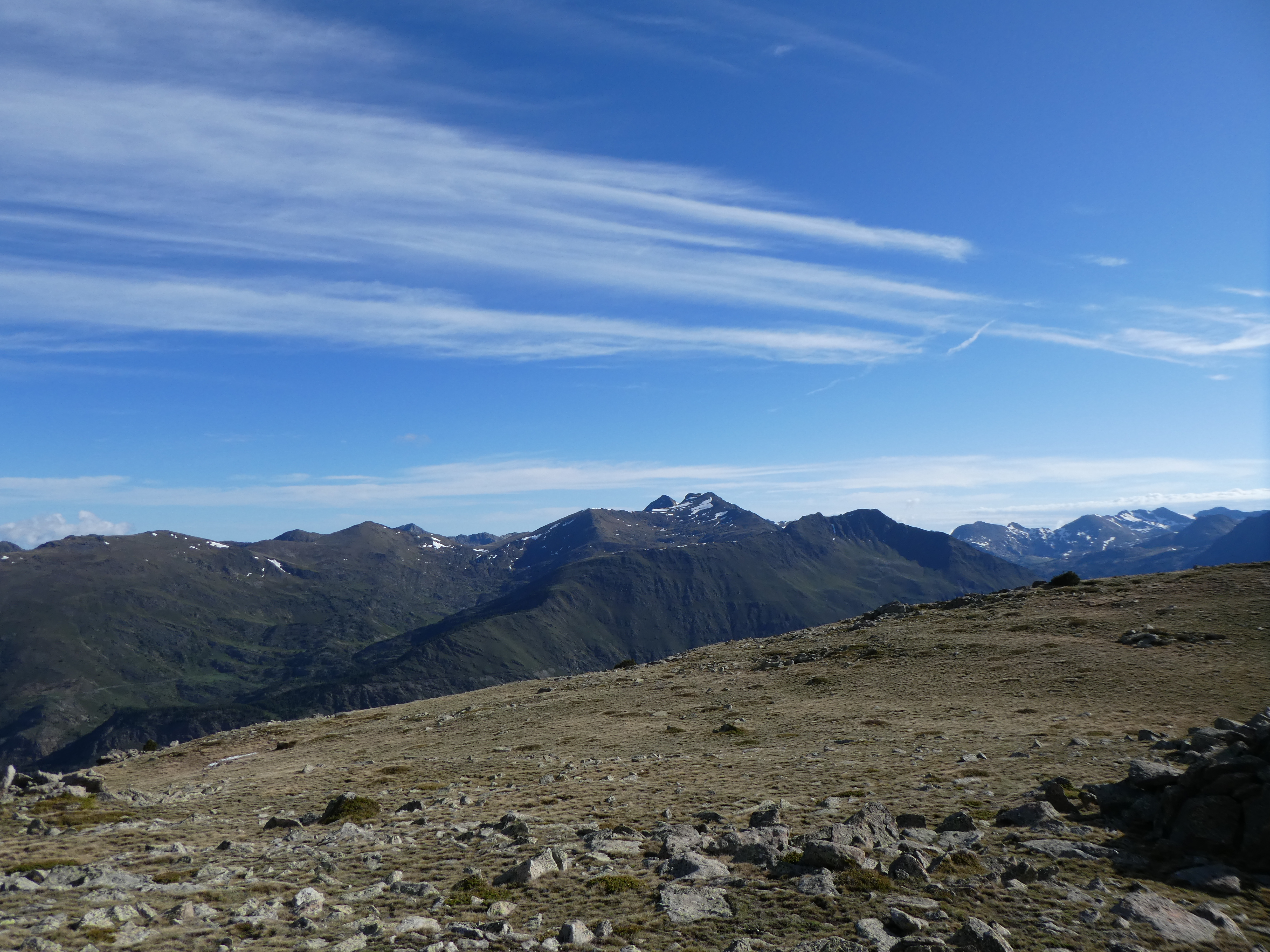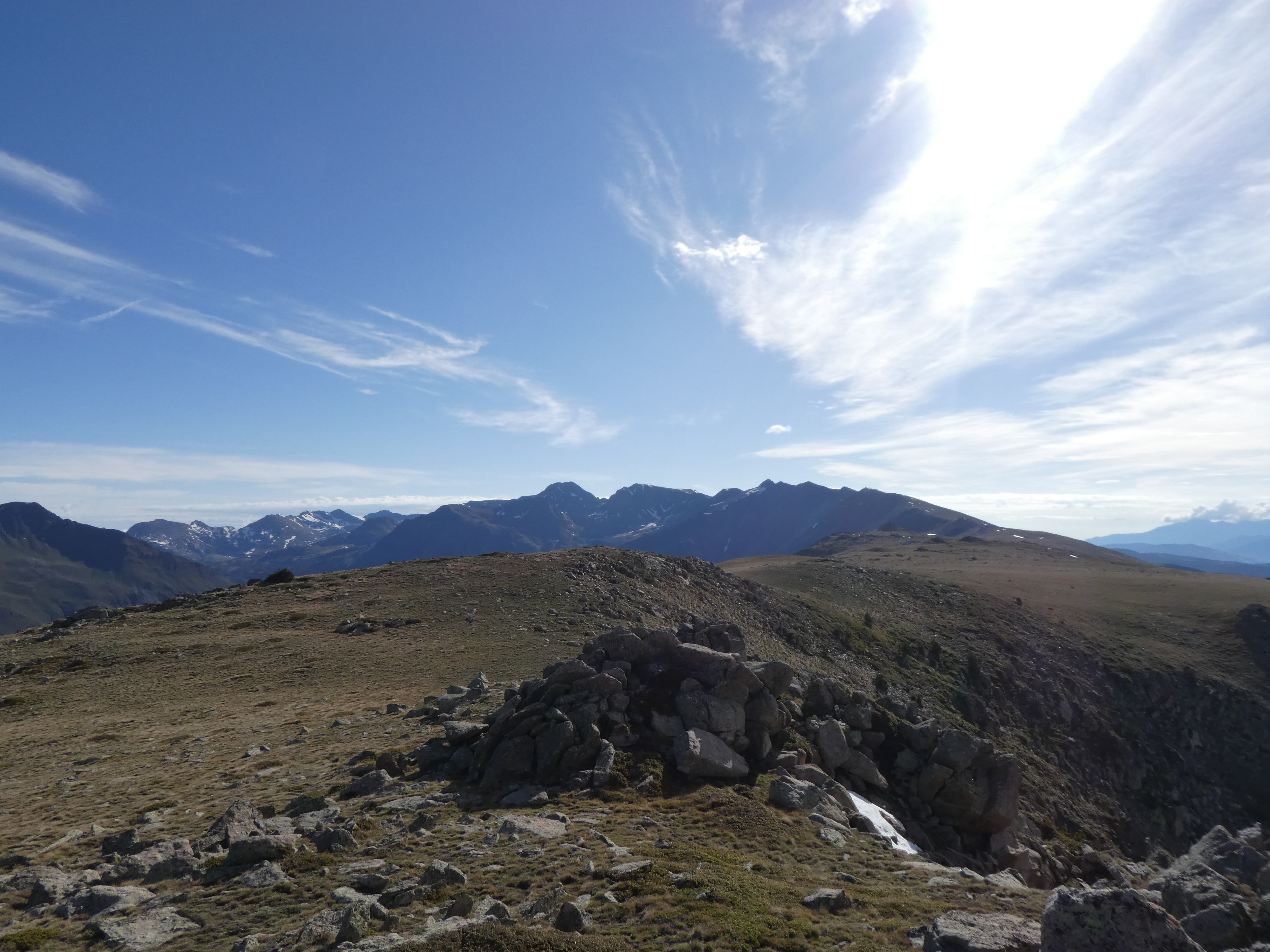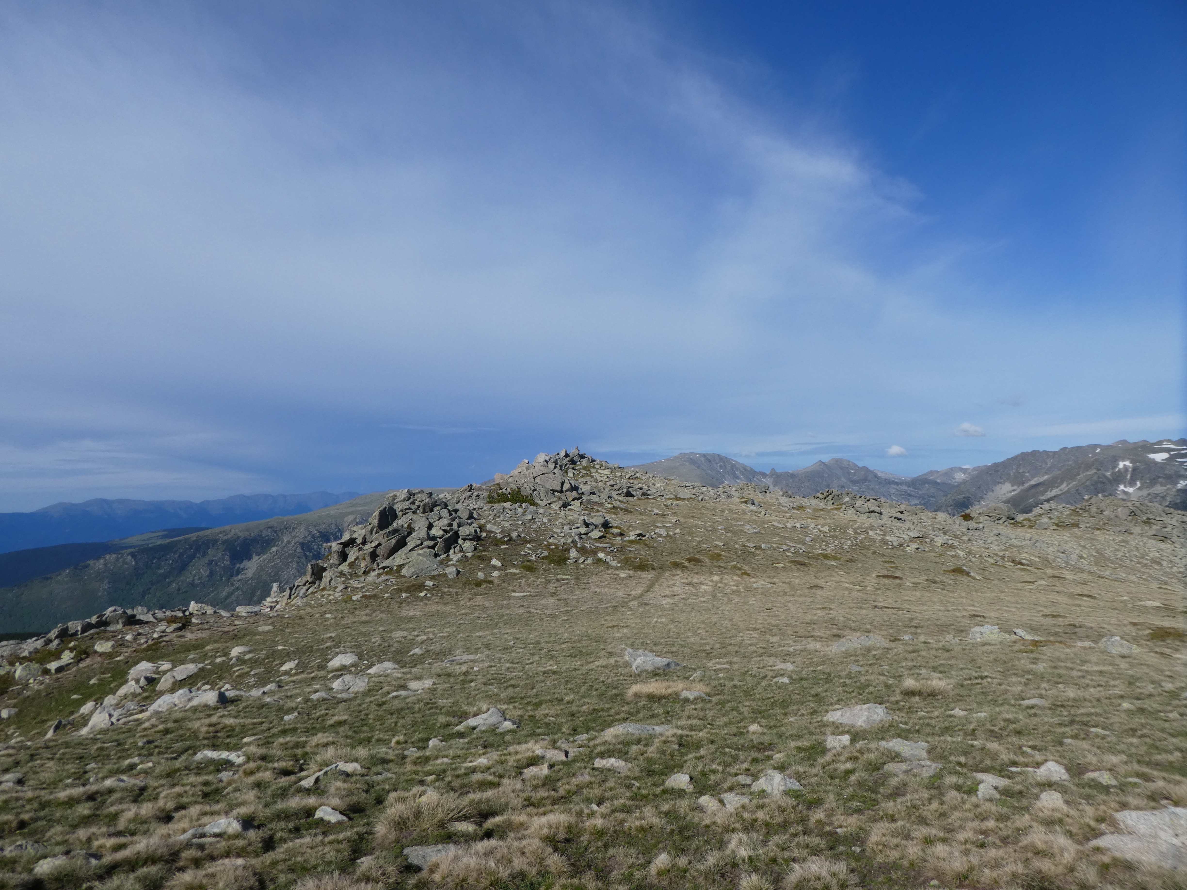 Arrivée au sommet d'el Punxó (2581 m) : beau panorama sur les sommets du Conflent, de la Haute-Cerdagne, de la Cerdanya, de la Vall de Campcardós, de l'Andorre, de la Haute-Ariège, du Capcir ainsi que sur la Vallée du Sègre