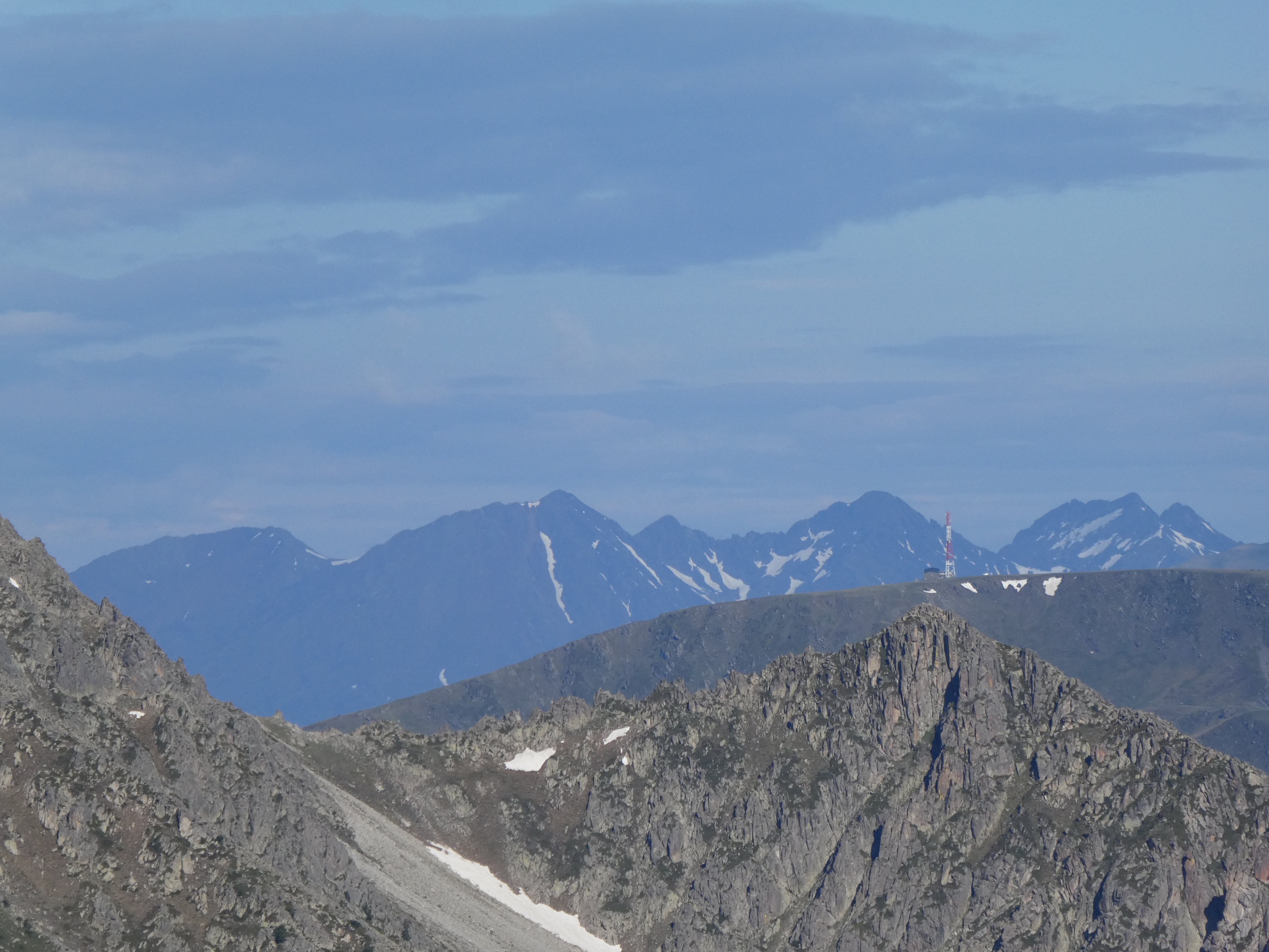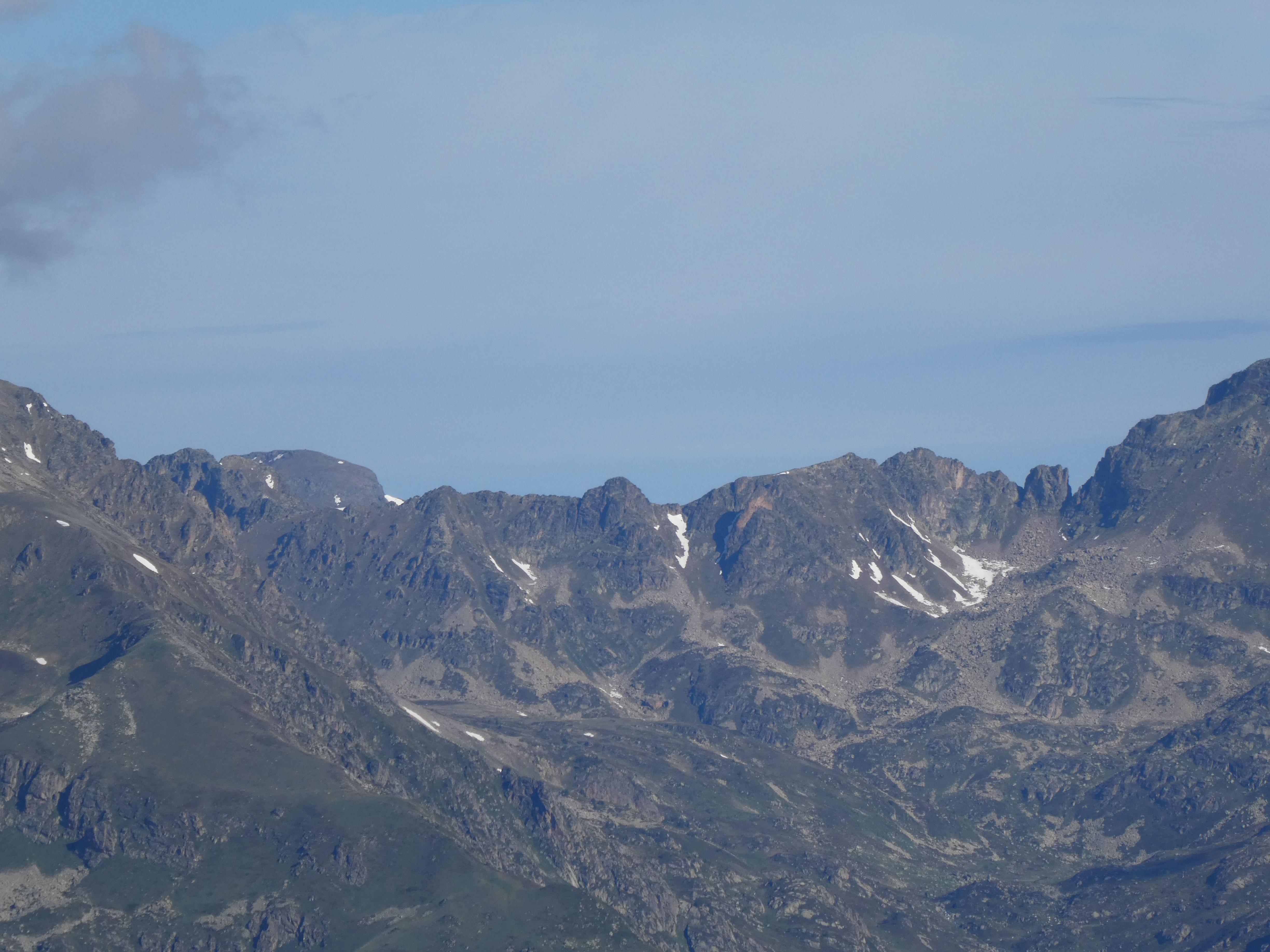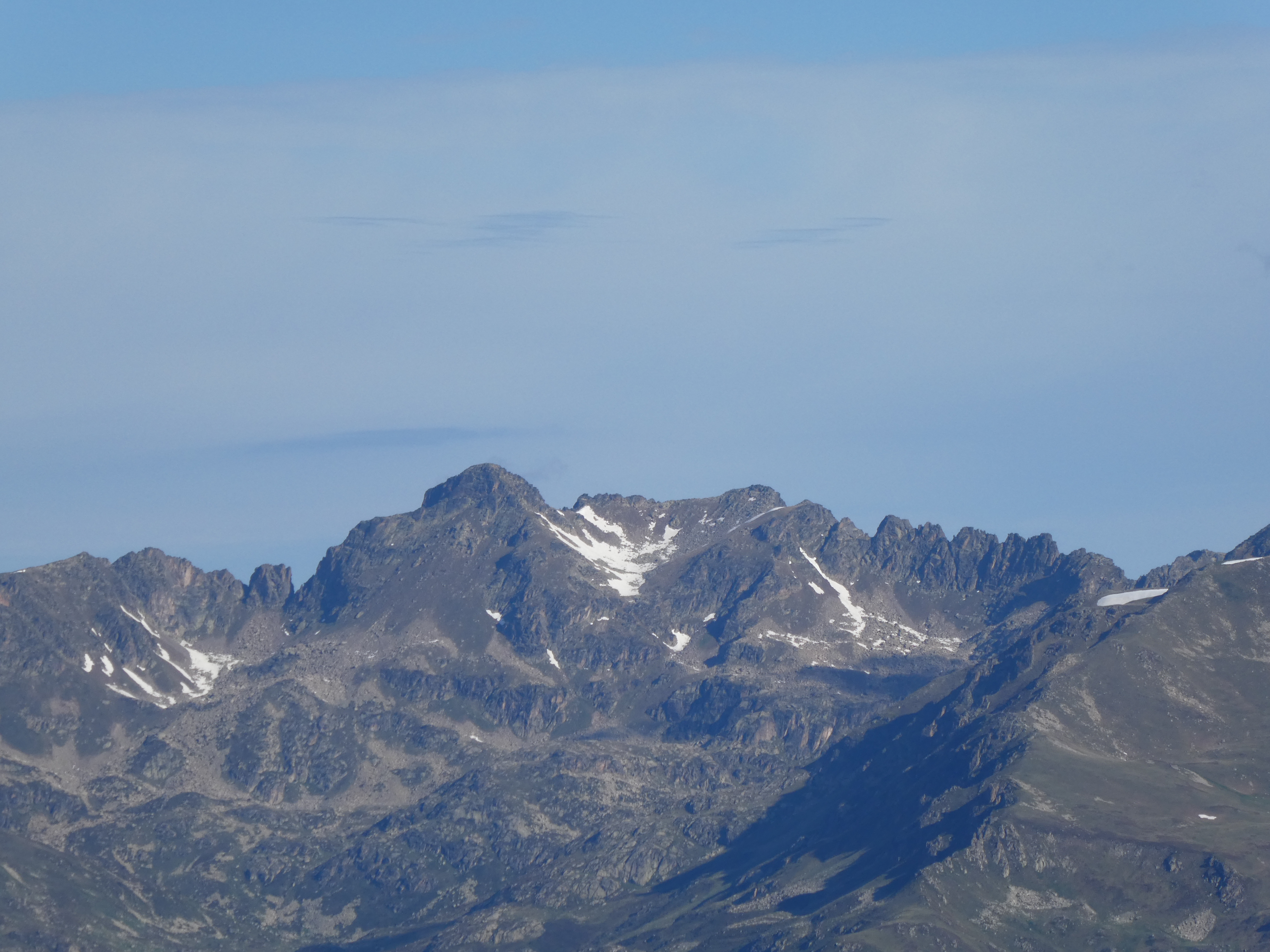 Zoom sur le Pic de Sanfonts (2885 m) à gauche, le Pic de Comapedrosa (2942 m) au centre-gauche, la Roca Entravessada (2929 m) au centre-droit et et le Pic de Médécourbe (2913 m) à droite