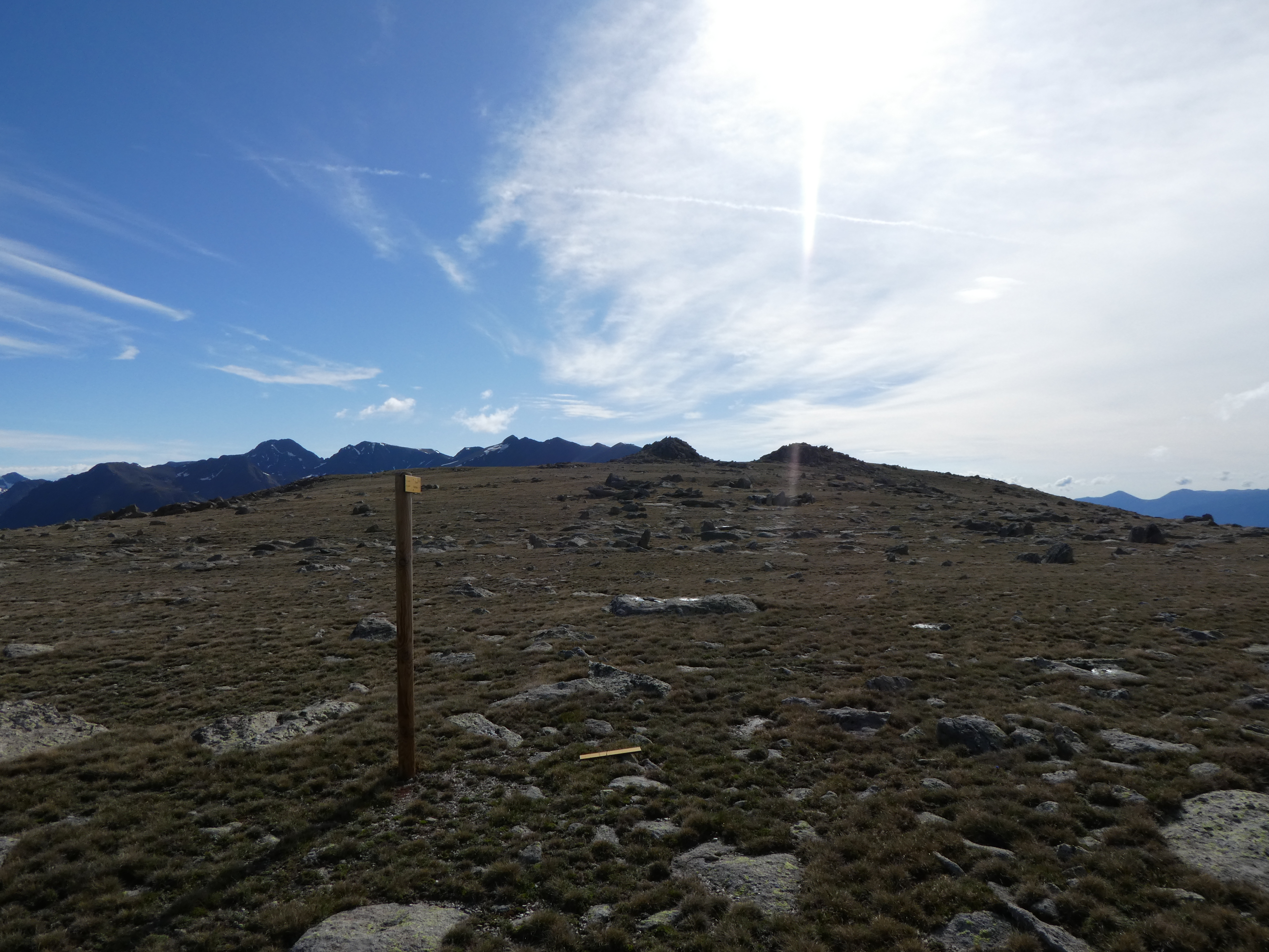 Coll de l'Home Mort (2292 m) : suivre le semblant de chemin partant sur la droite direction el Punxó, aucun balisage dorénavant (il existe un sentier partant sur la droite visible au milieu de la végétation basse)
