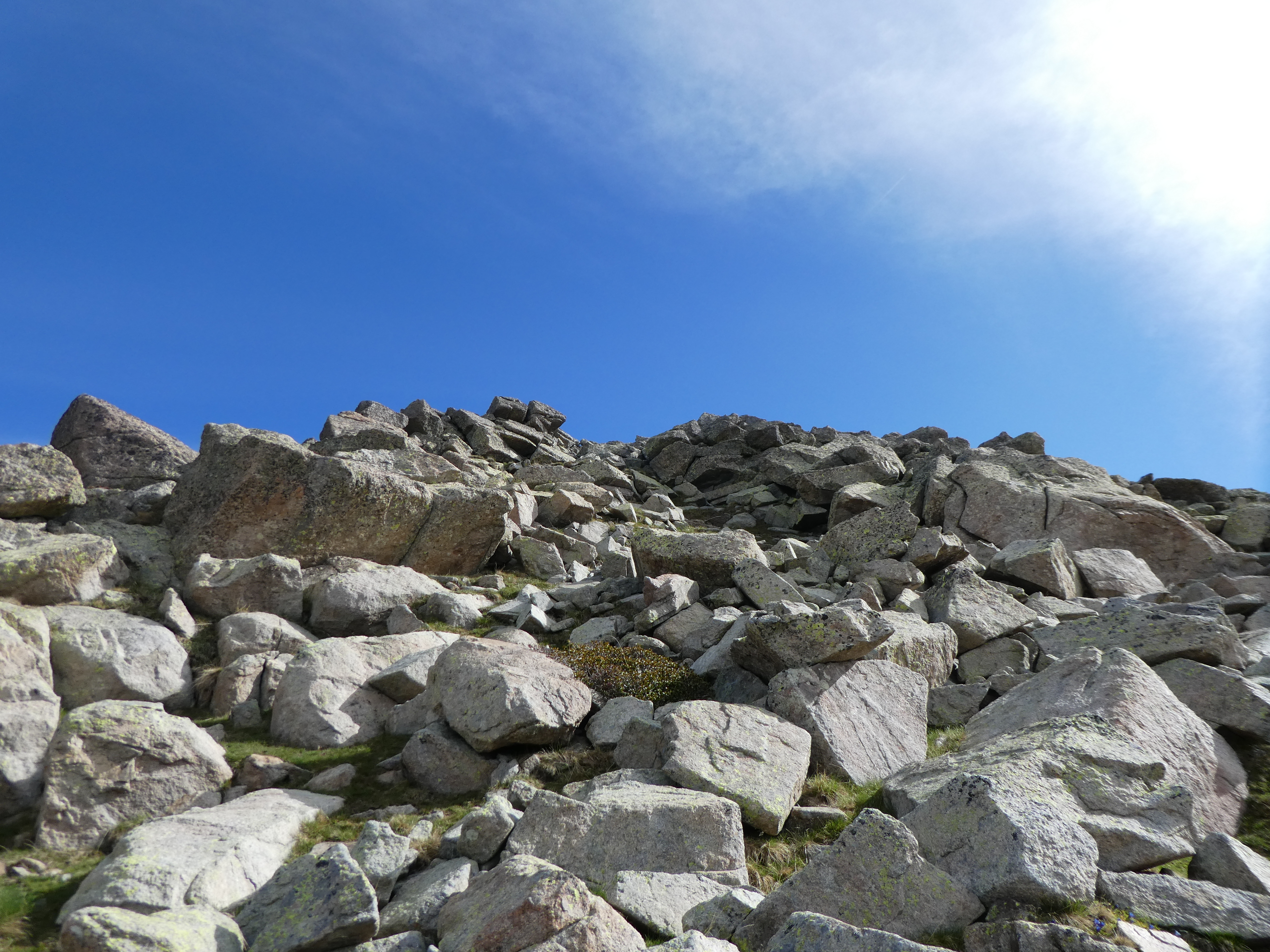 Vue sur la montée vers le sommet de la Serra de la Portella de Bac d'Hortell entre les gros blocs rocheux (sans danger)