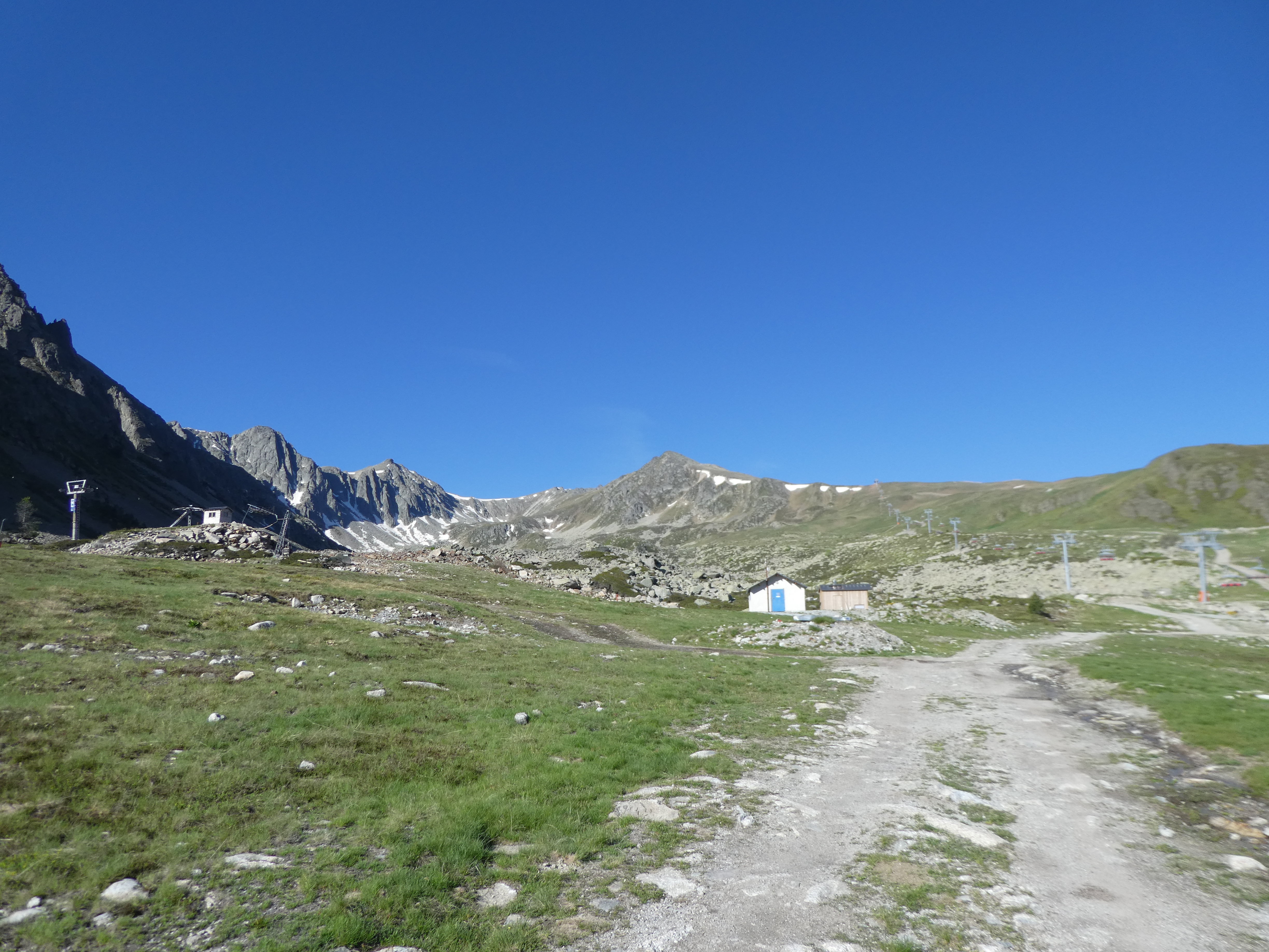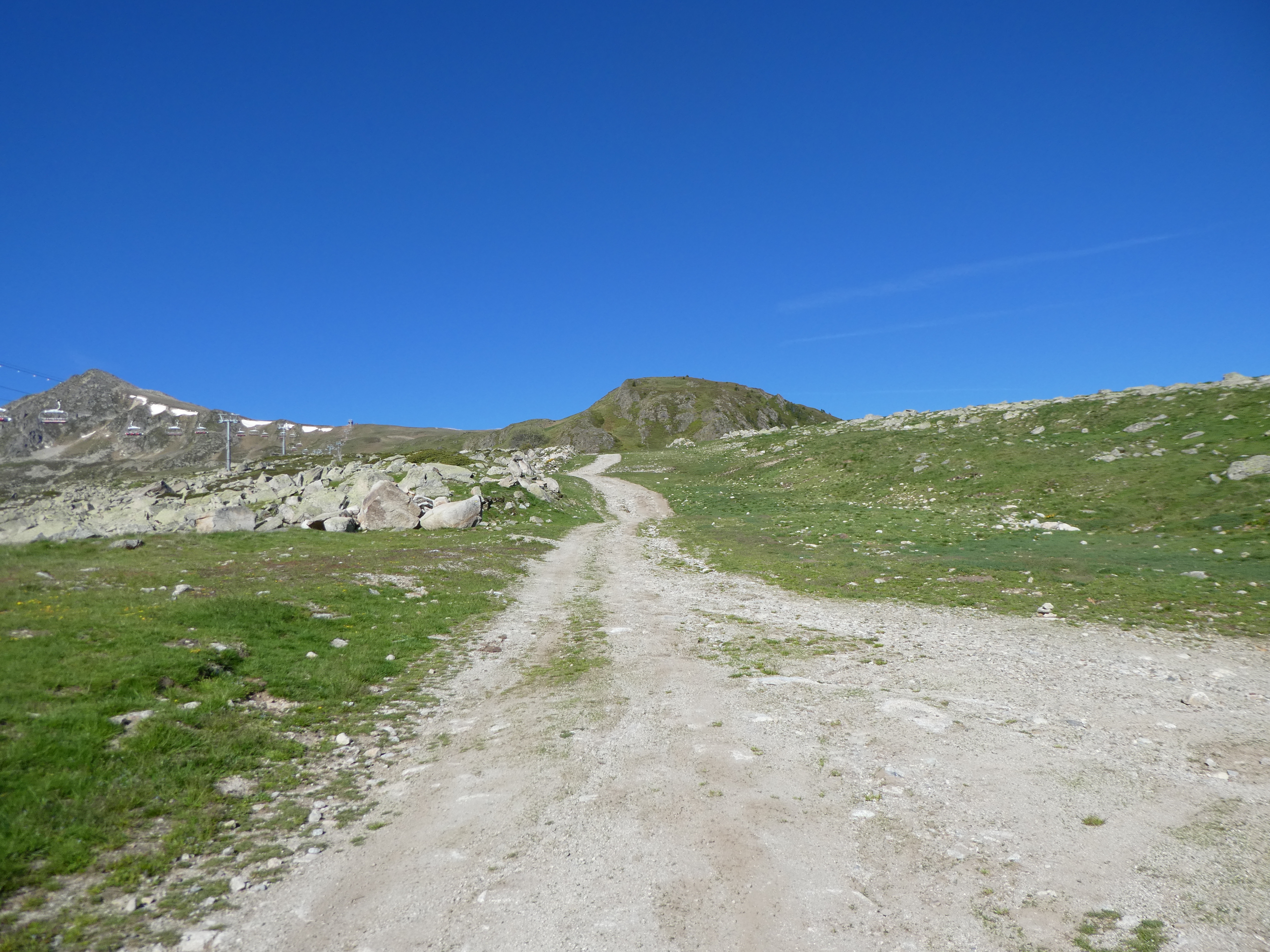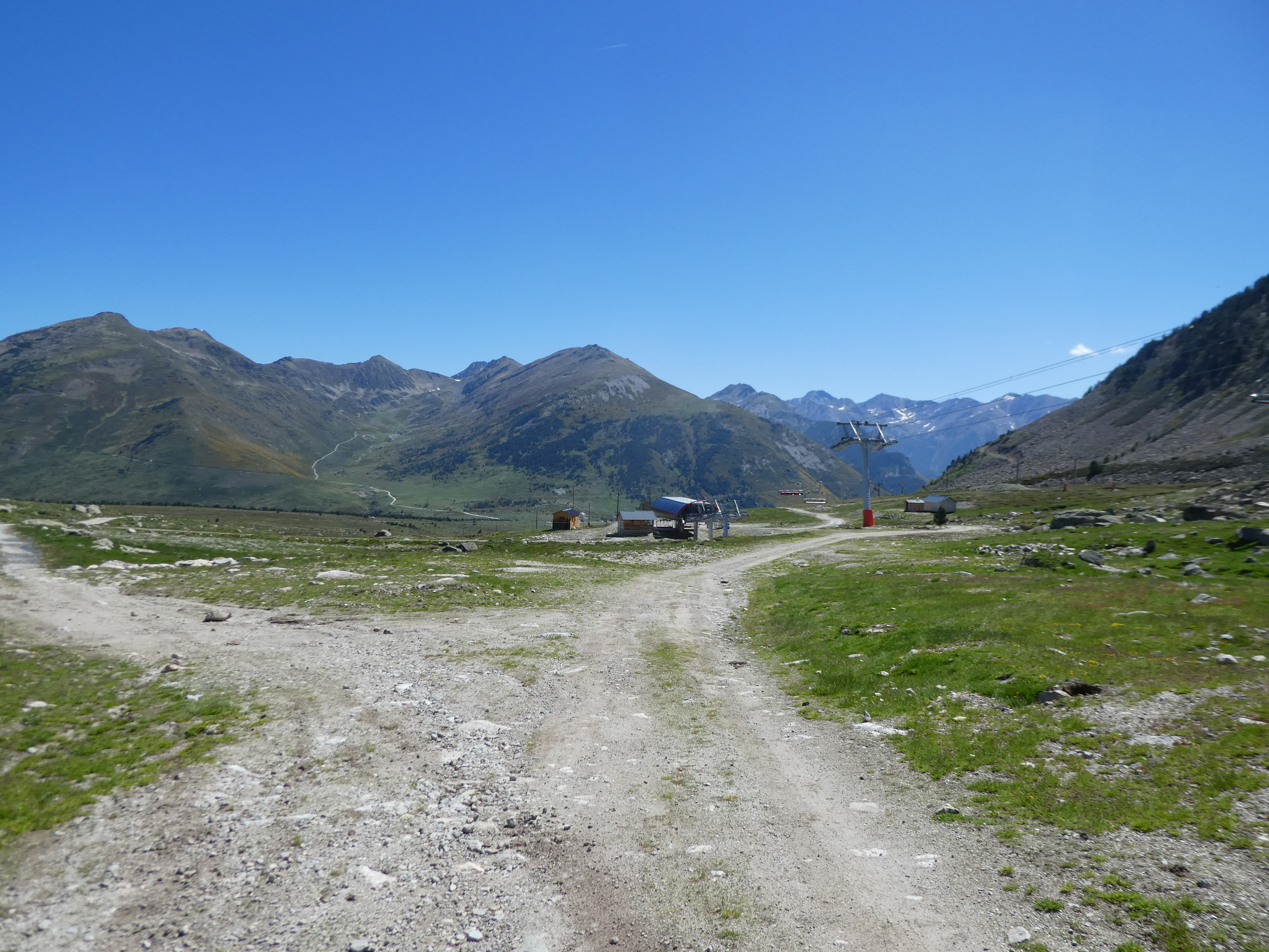 A ce croisement situé au niveau du départ du Télésiège du Dôme de la Mine (400 mètres après le précédent) (2092 m), suivre la piste descendant tout droit vers le parking de la station de ski direction Porté-Puymorens, aucun balisage dorénavant
