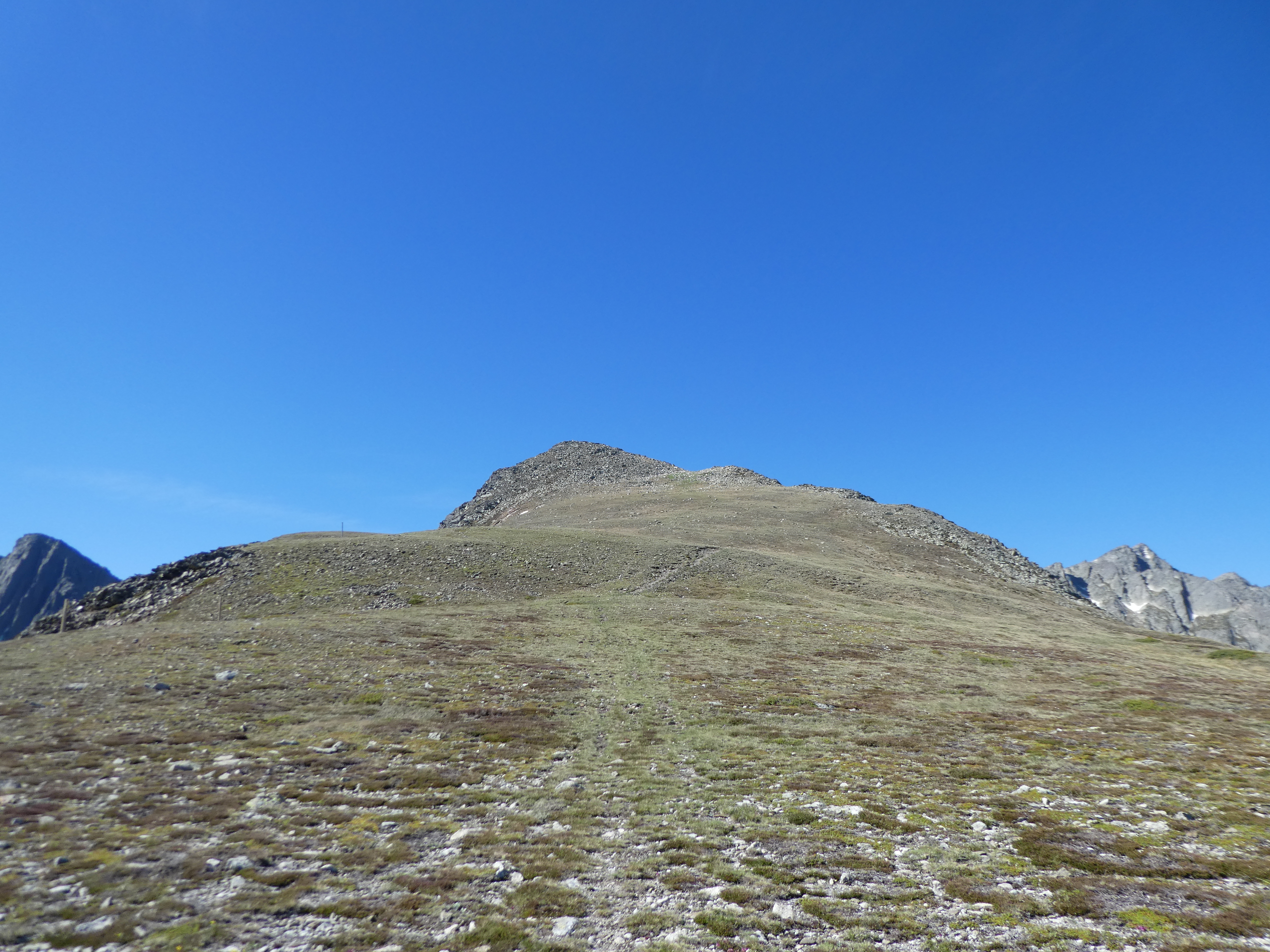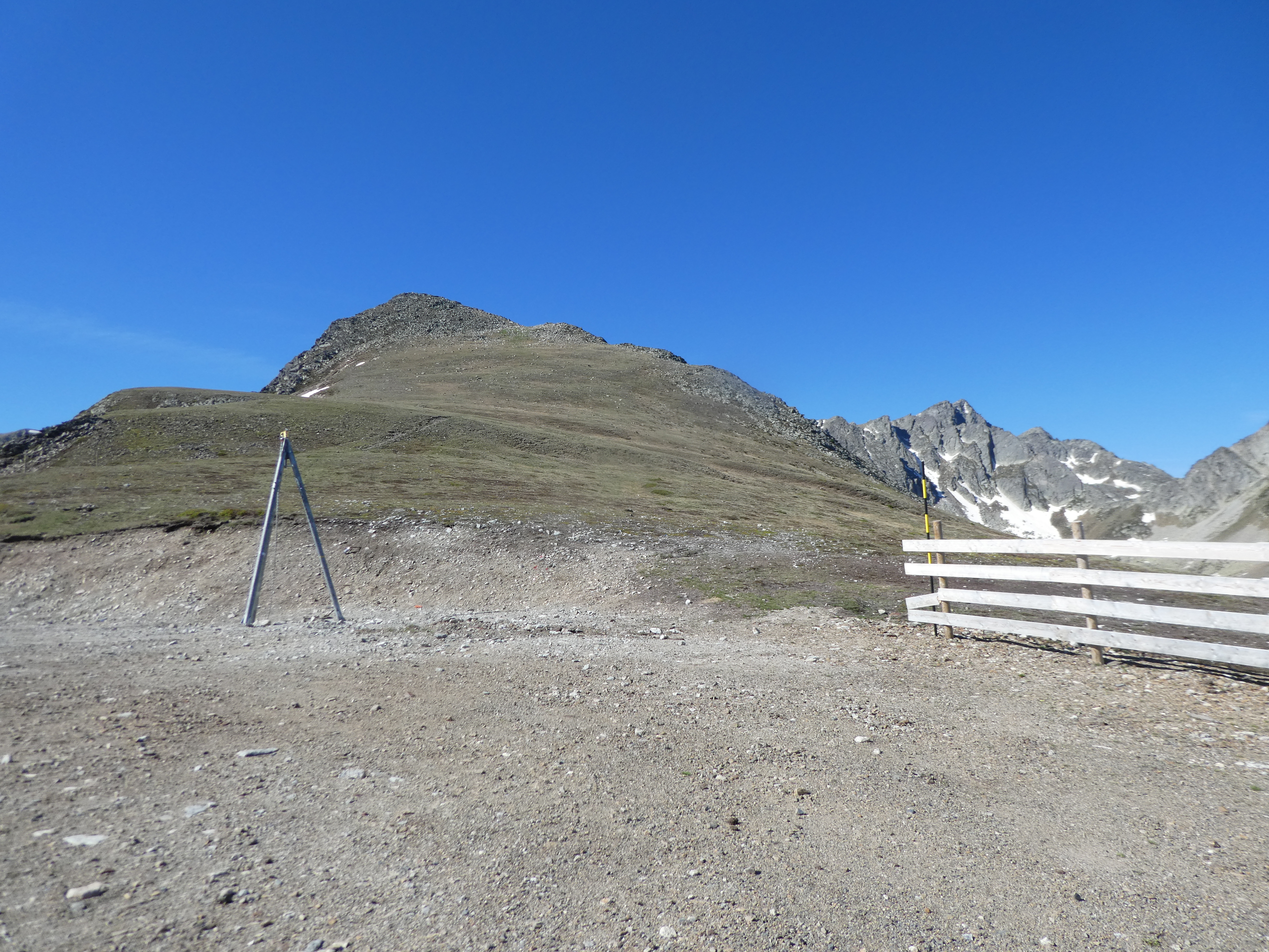 A ce croisement situé au sommet du Télésiège du Dôme de la Mine (1900 mètres après le précédent), suivre le chemin montant raidement tout droit vers le sommet direction Pic de la Mina, balisé en jaune