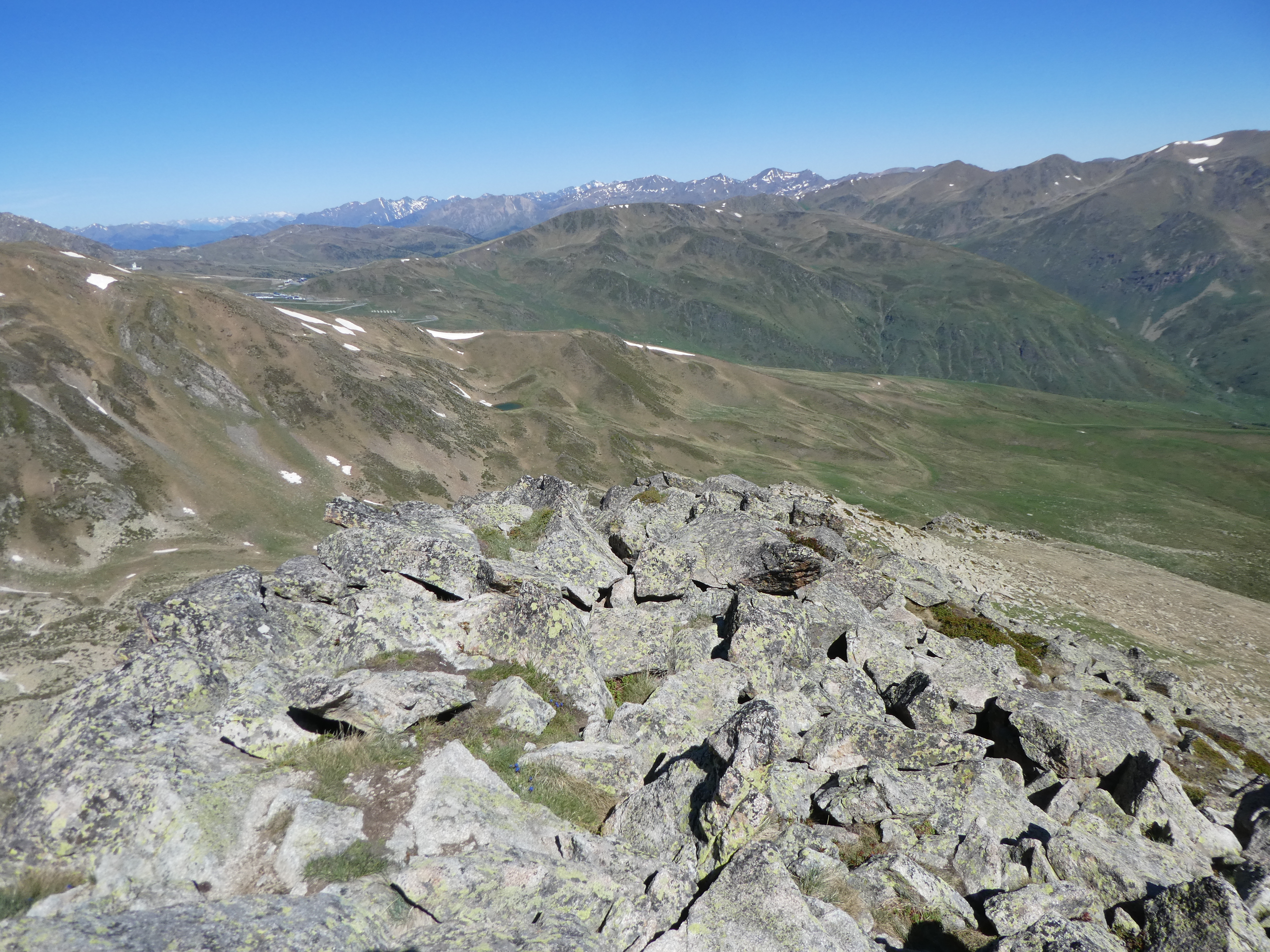 Arrivée au sommet du Pic de la Mina (2683 m) : beau panorama sur les sommets de l'Andorre, de la Haute-Ariège, des Monts d'Olmes, de la Cerdagne, du Capcir, du massif de Font Negra ainsi que sur la Vallée de l'Ariège