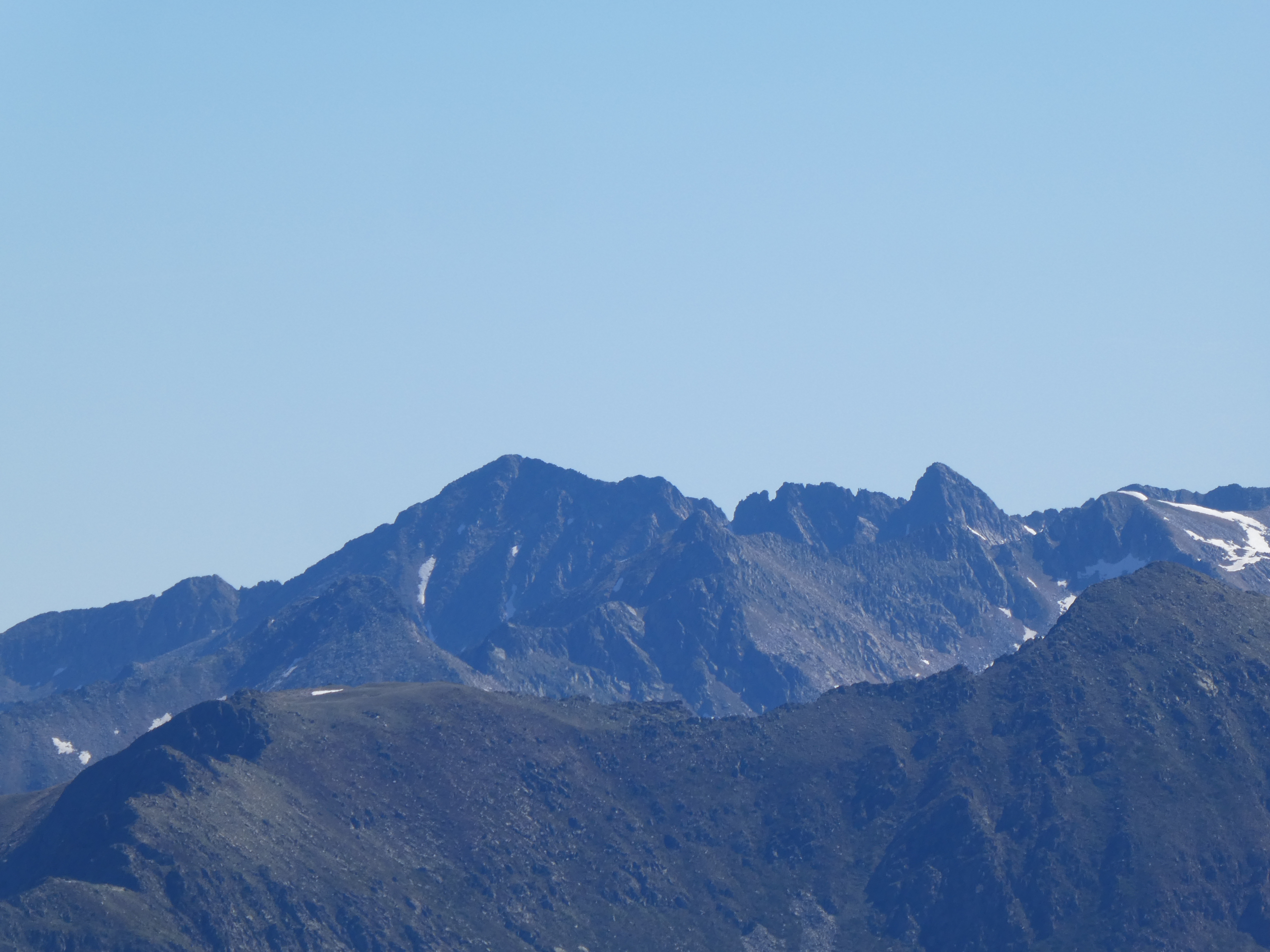 Zoom sur le Pic de Sanfonts (2883 m) à gauche, le Pic de Coma Pedrosa (2942 m) au centre, et la Roca Entravessada (2925 m) au centre, et le Pic de Medacorba (2913 m) à droite