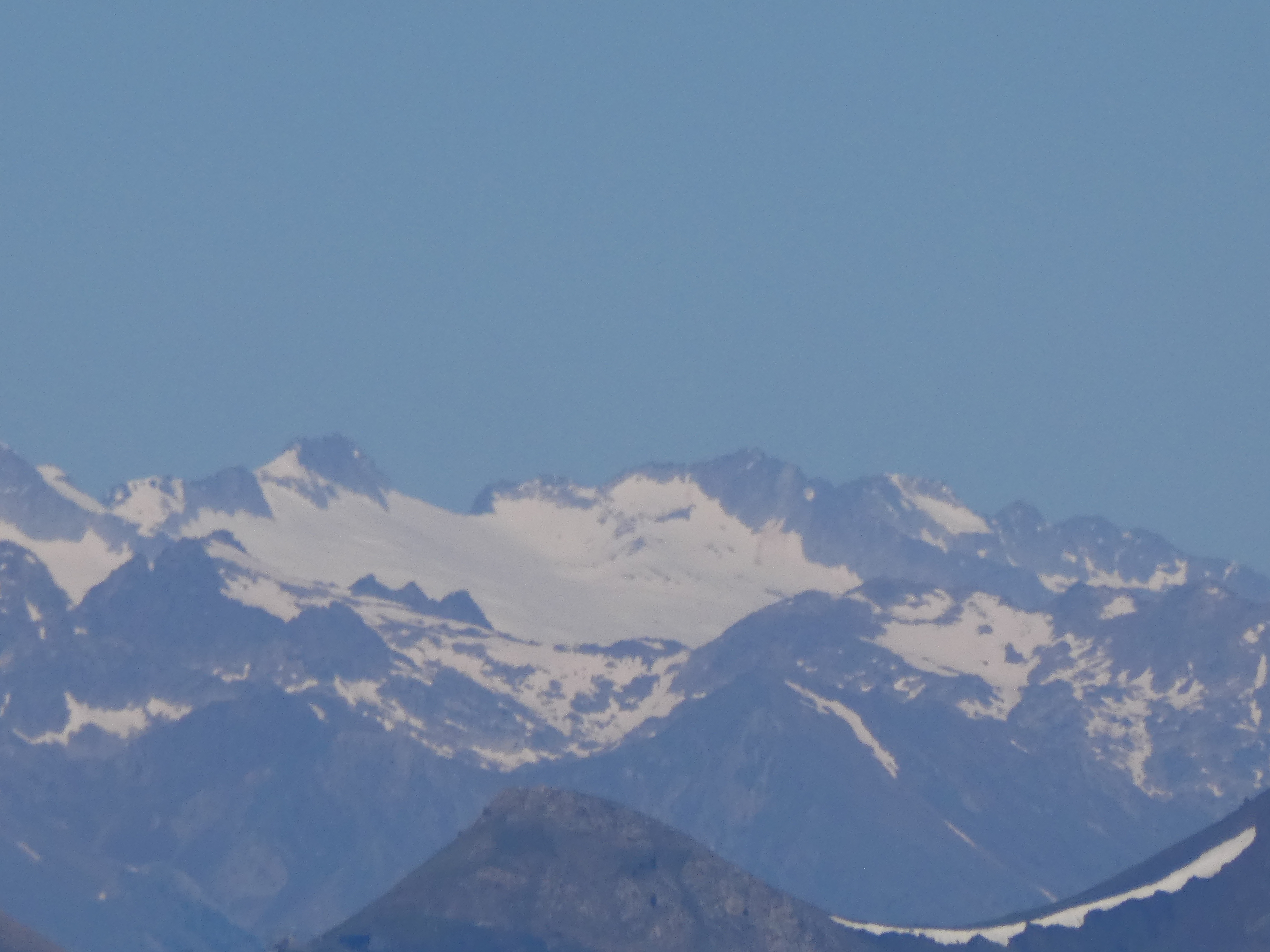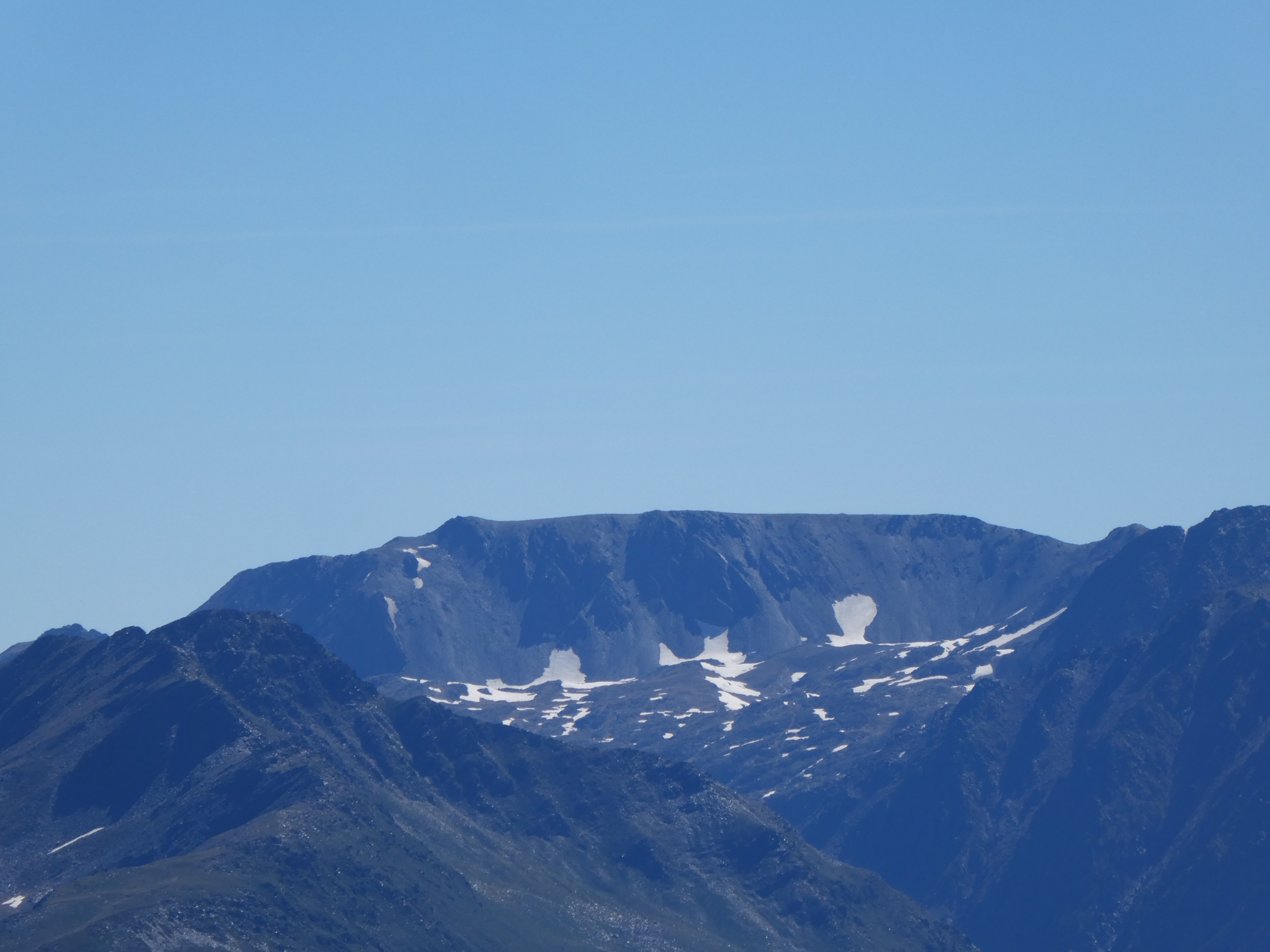 Zoom sur le Pic de Canalbonne (3964 m) à gauche, la Pica d'Estats (3143 m) au centre et le Pic de Montcalm (3077 m) à droite