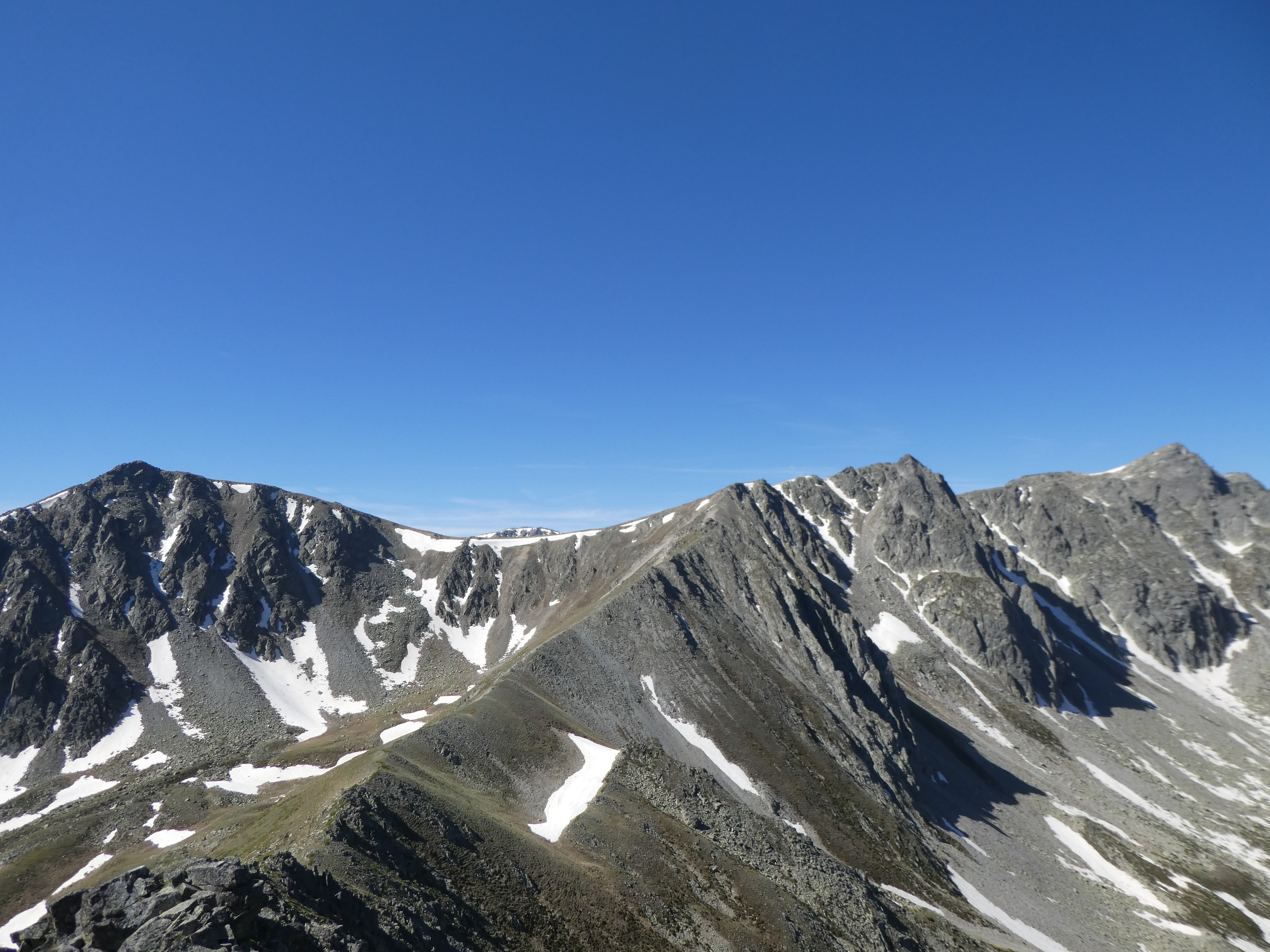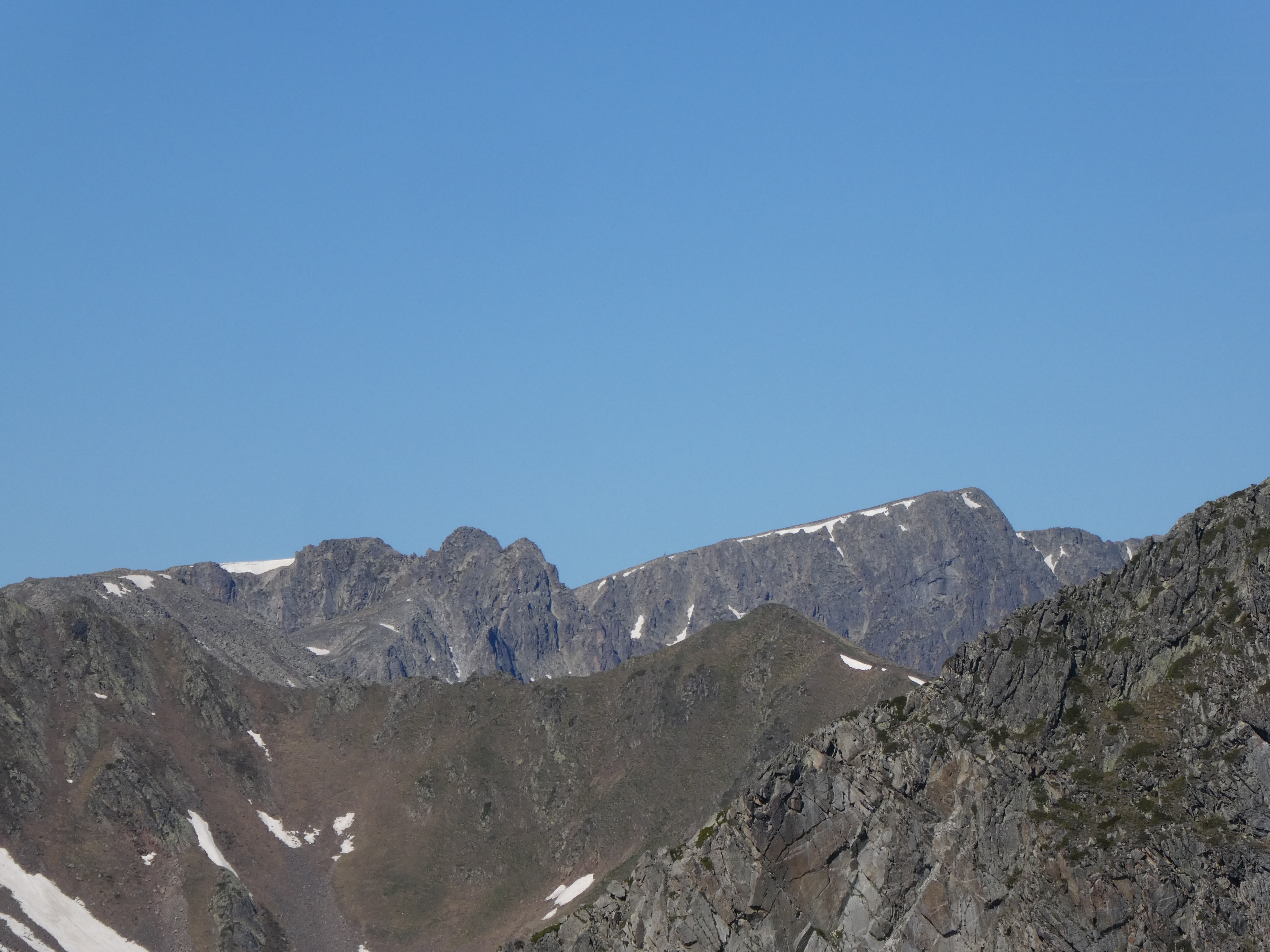 Zoom sur le Pic del Siscaró (2636 m) au centre-gauche, le Pic de la Cabaneta (2818 m) au centre et le Roc Mélé (2811 m) au centre-droit