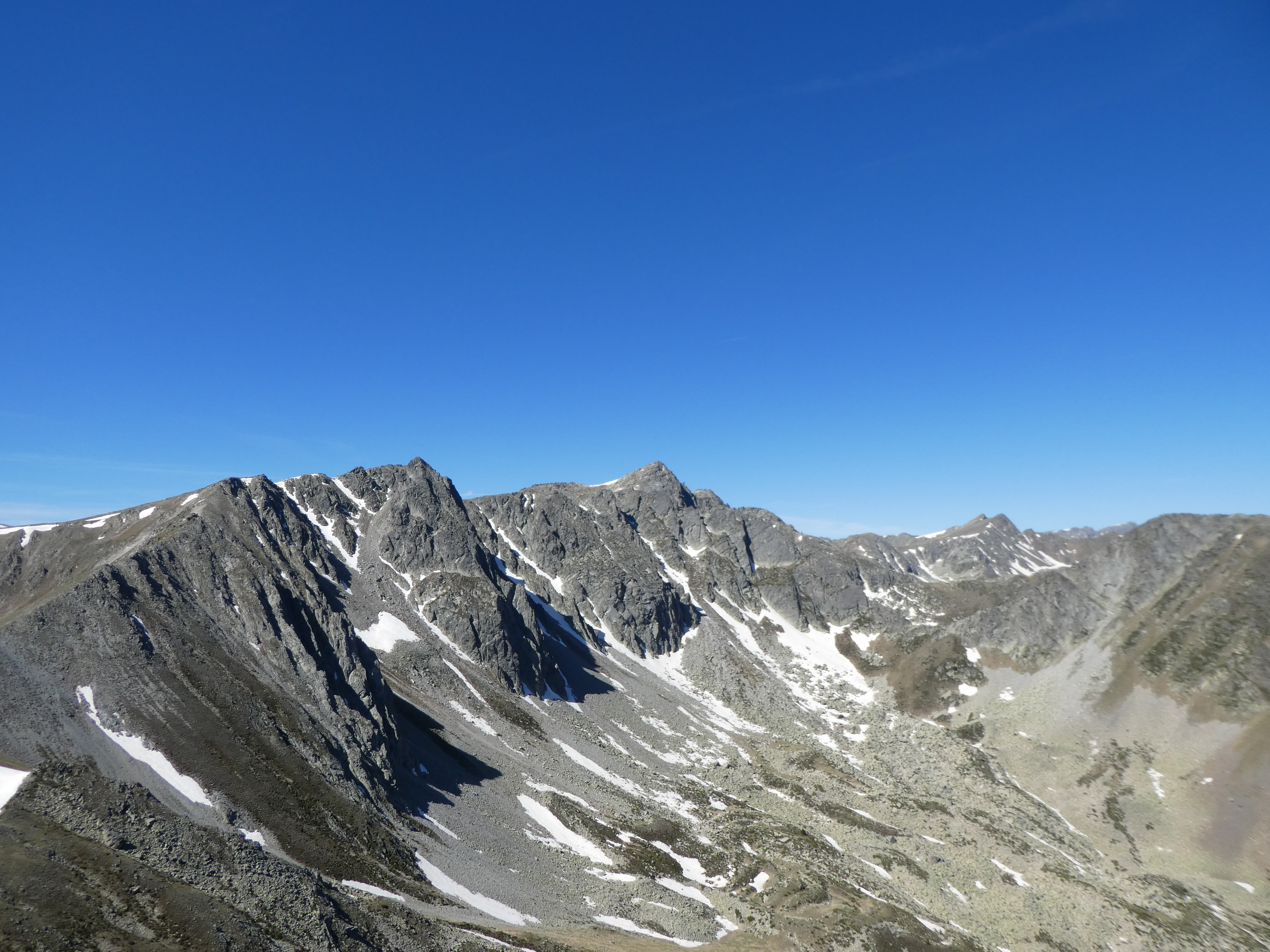 Zoom sur le Pic de l'Infern (2868 m) à gauche, et la Torre d'Eina (2831 m) et le Pic de les Nou Fonts (2861 m) à droite