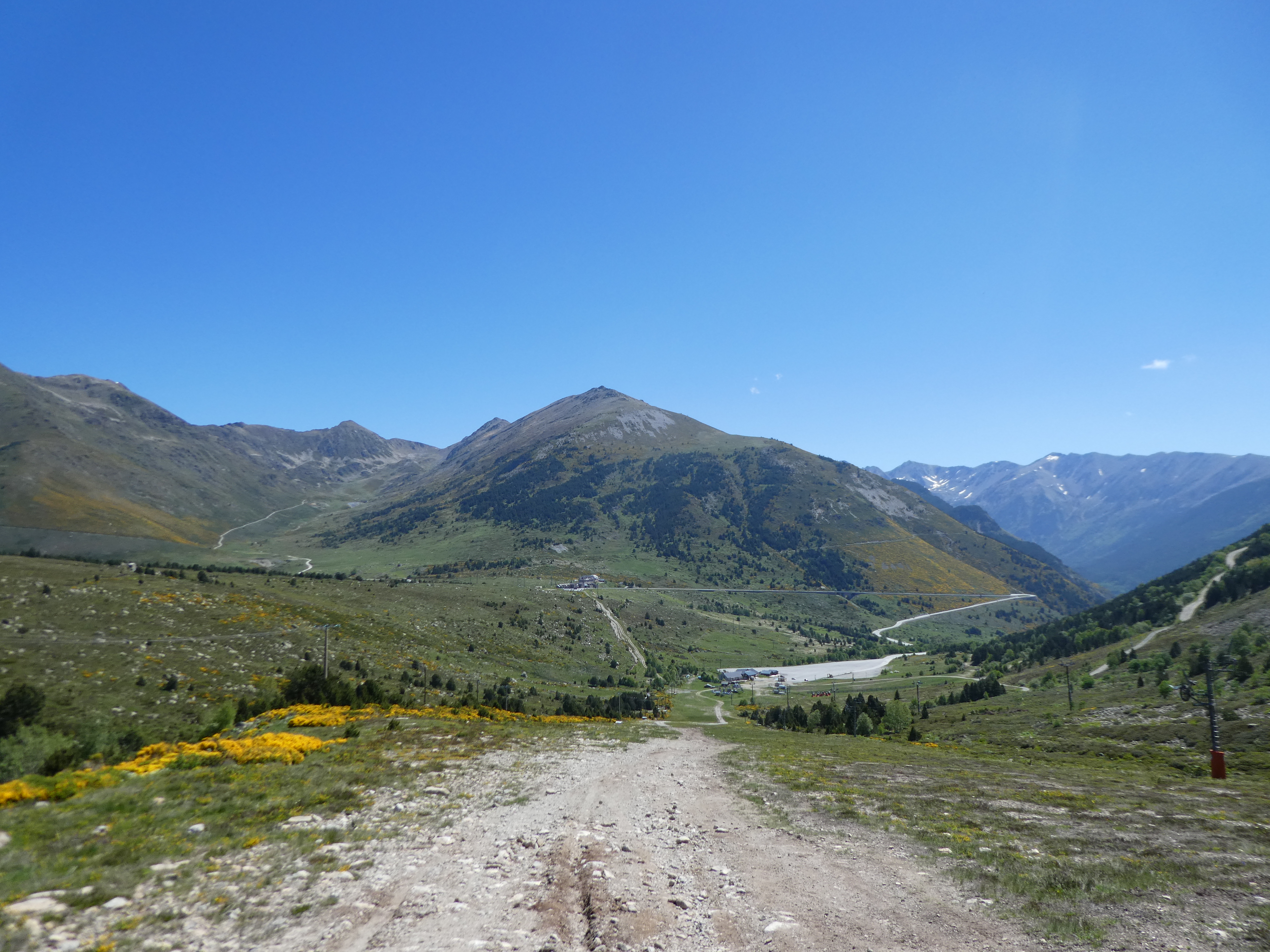 A ce croisement situé au niveau de la Bassa de l'Orri de la Vinyola et du départ du Télésiège du Dôme de la Mine (1500 mètres après le précédent) (2092 m), suivre la piste montant tout droit direction Pic de la Mina, balisé en jaune dorénavant