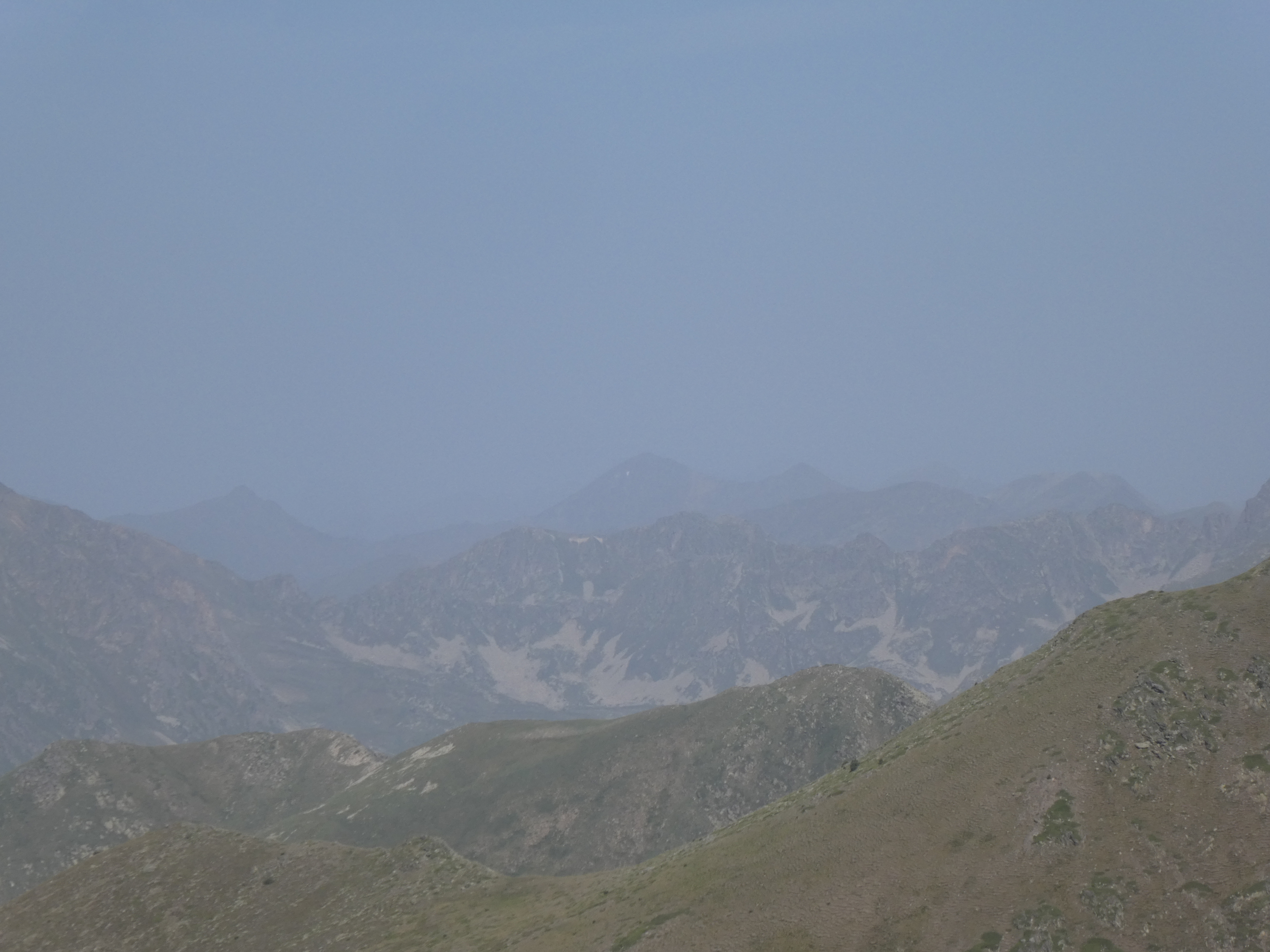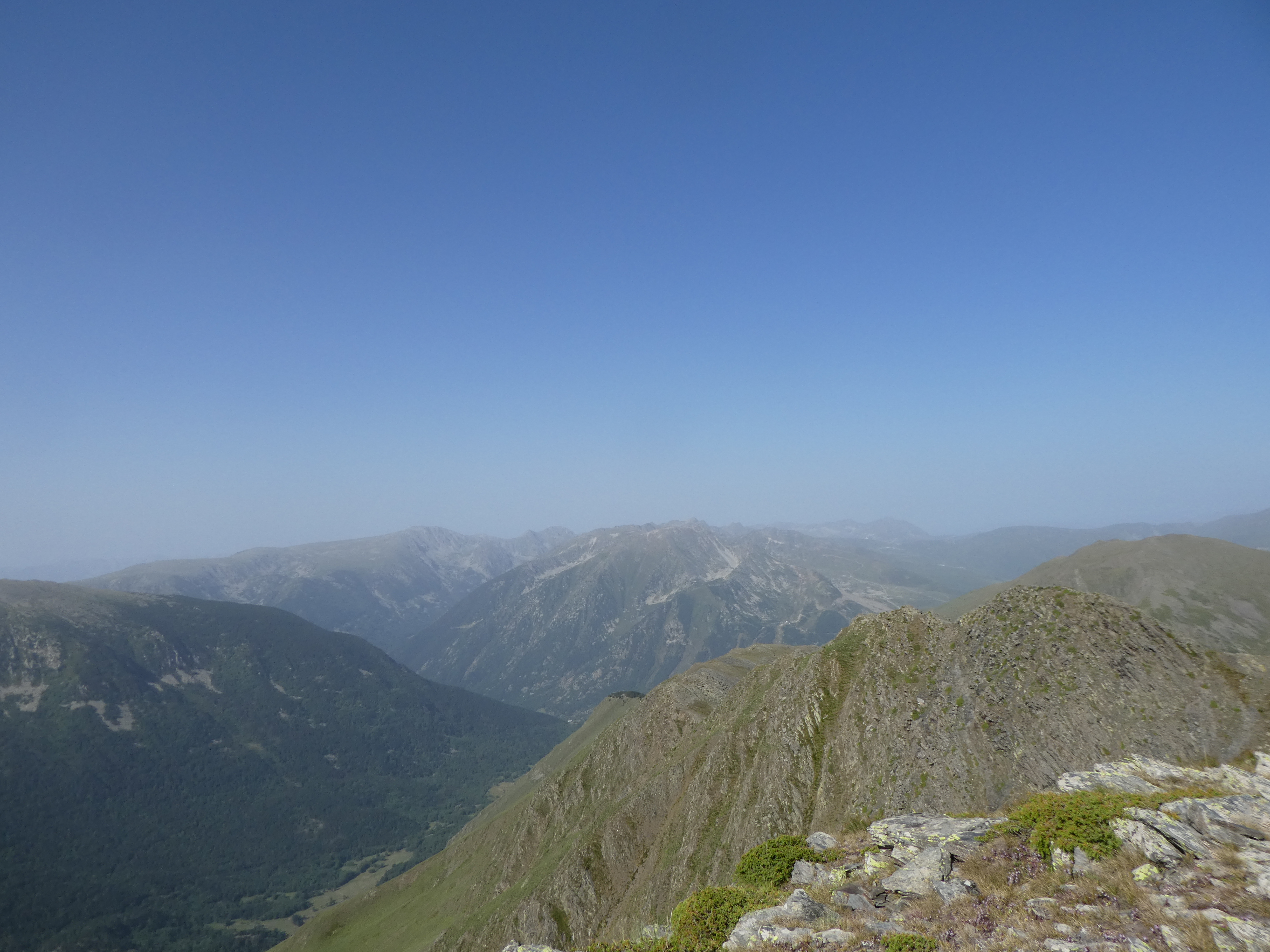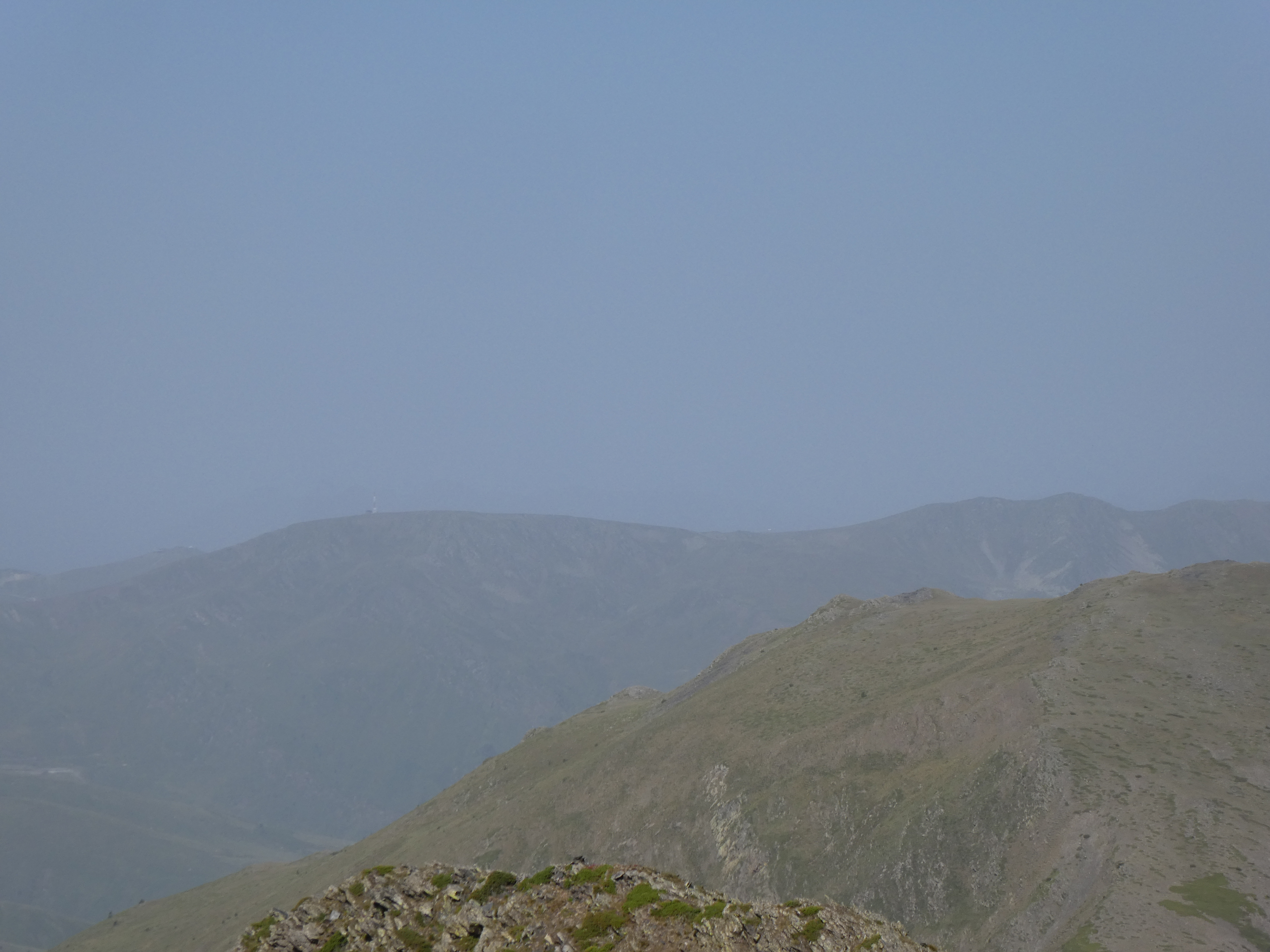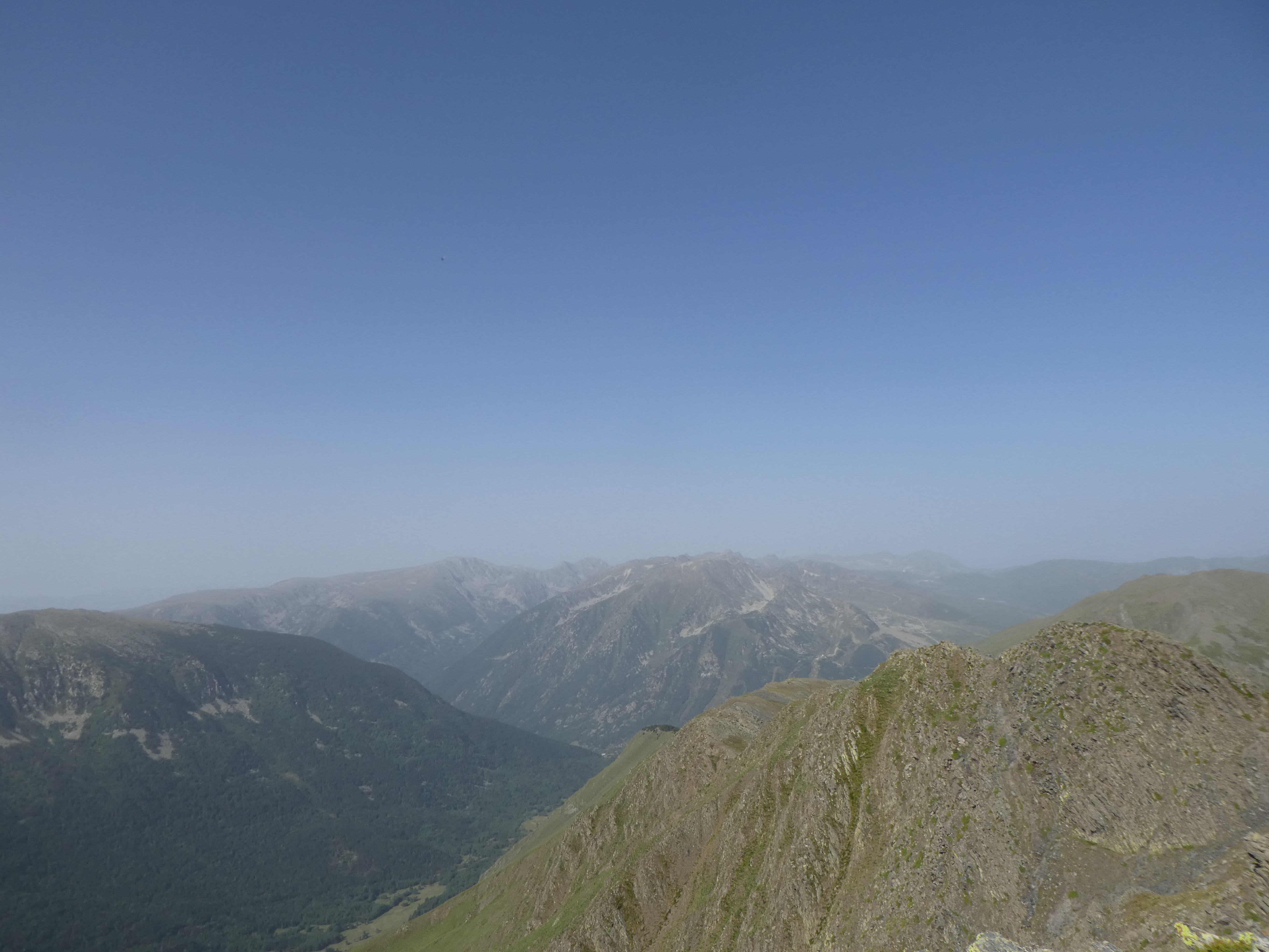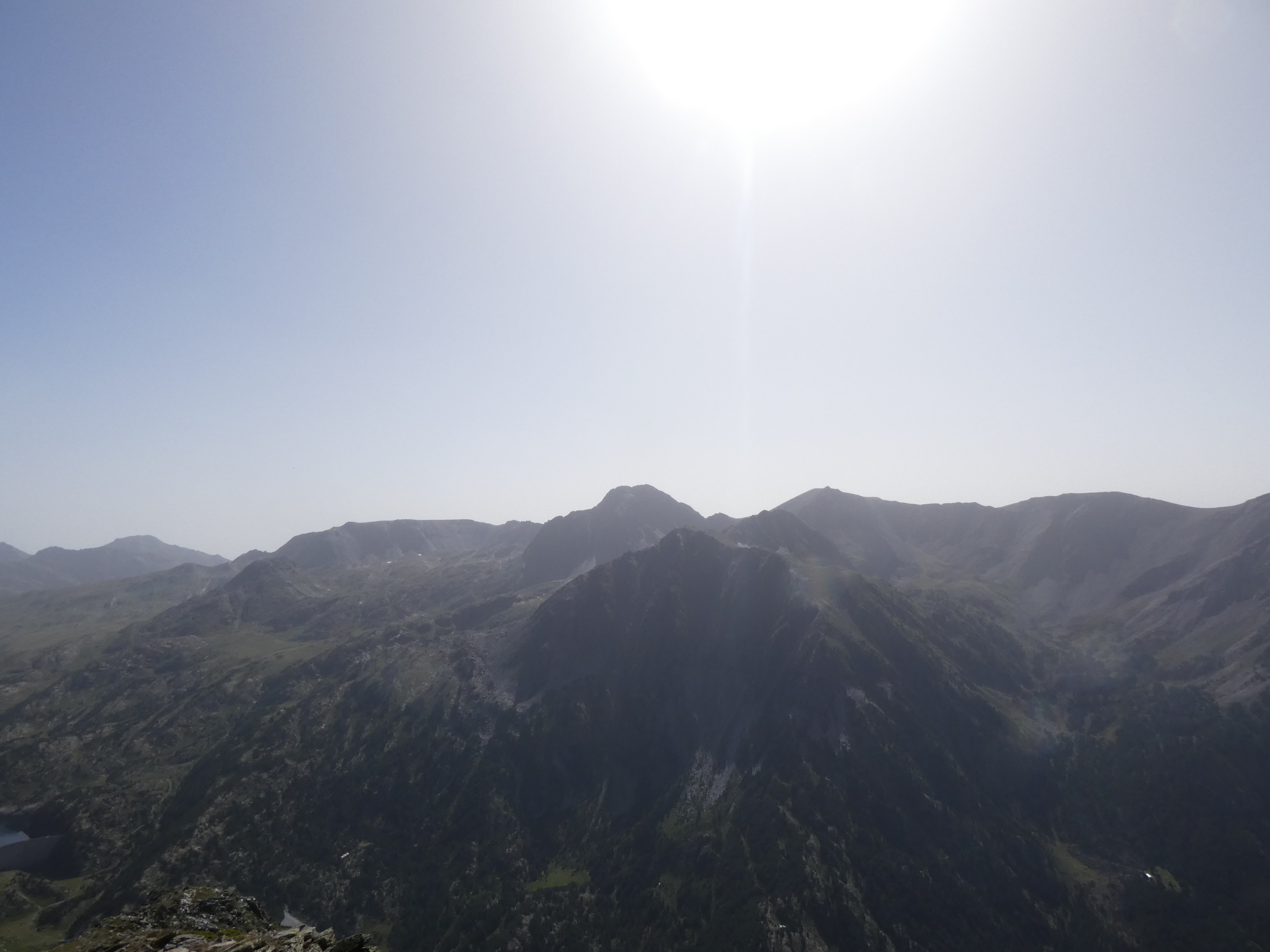 Arrivée au sommet du Puig de Font Viva (2673 m) : beau panorama malgré la présence de brume de chaleur sur les sommets de la Haute-Cerdagne, de la Réserve Naturelle d'Orlu, du Donezan, de la Serra del Cadí-Moixeró, de la Cerdanya, de l'Andorre ainsi que sur l'Estany de Lanós