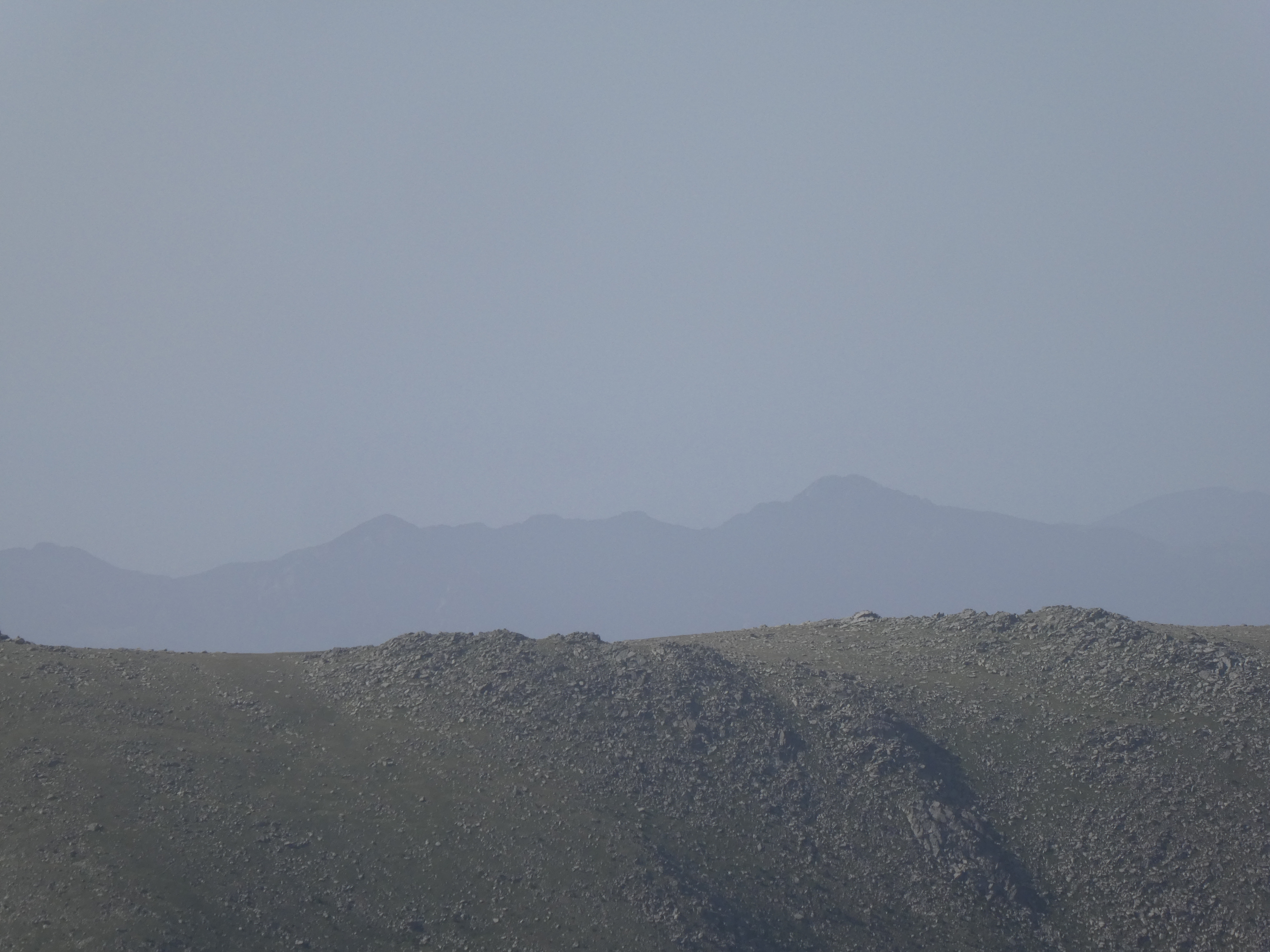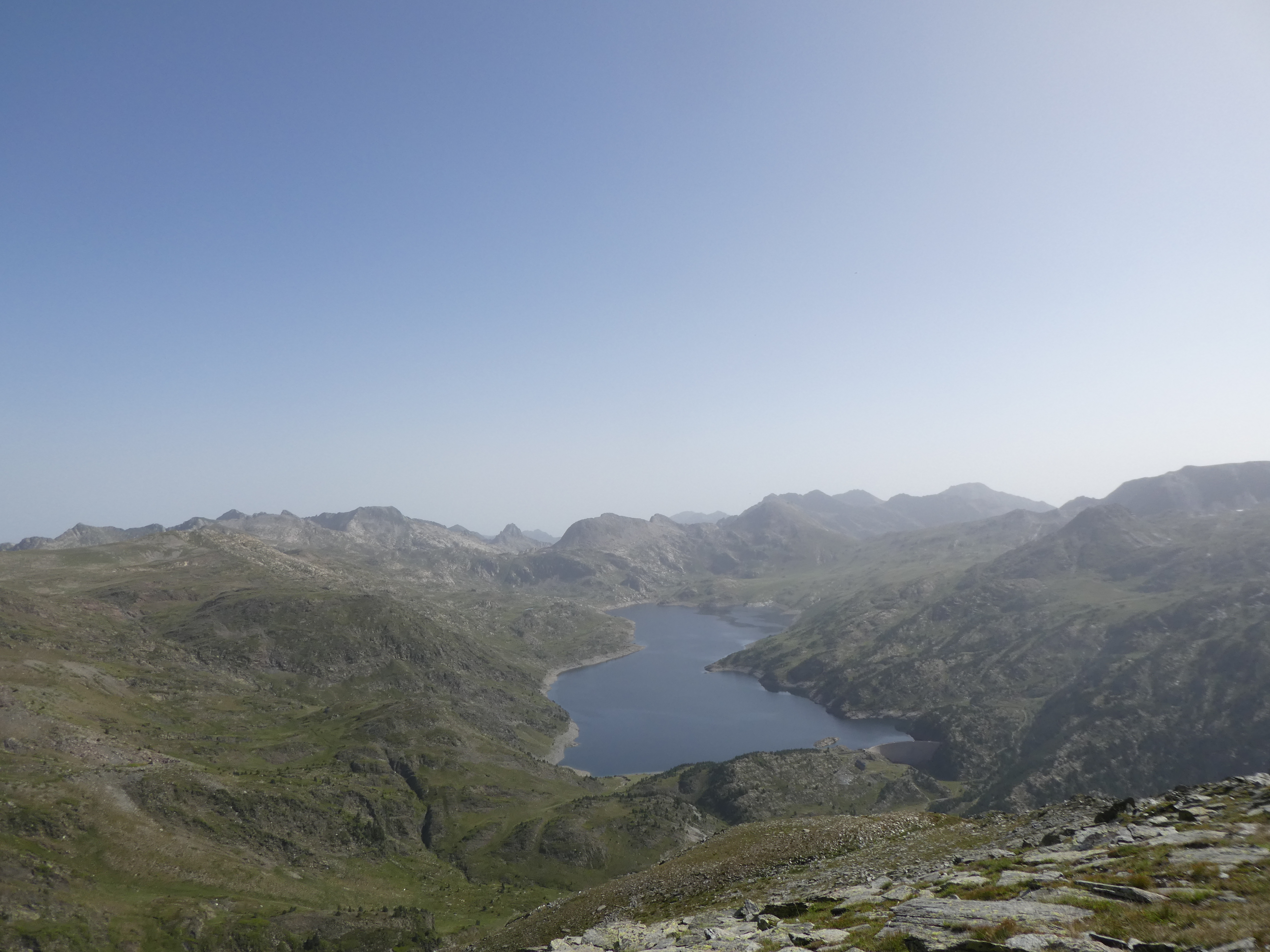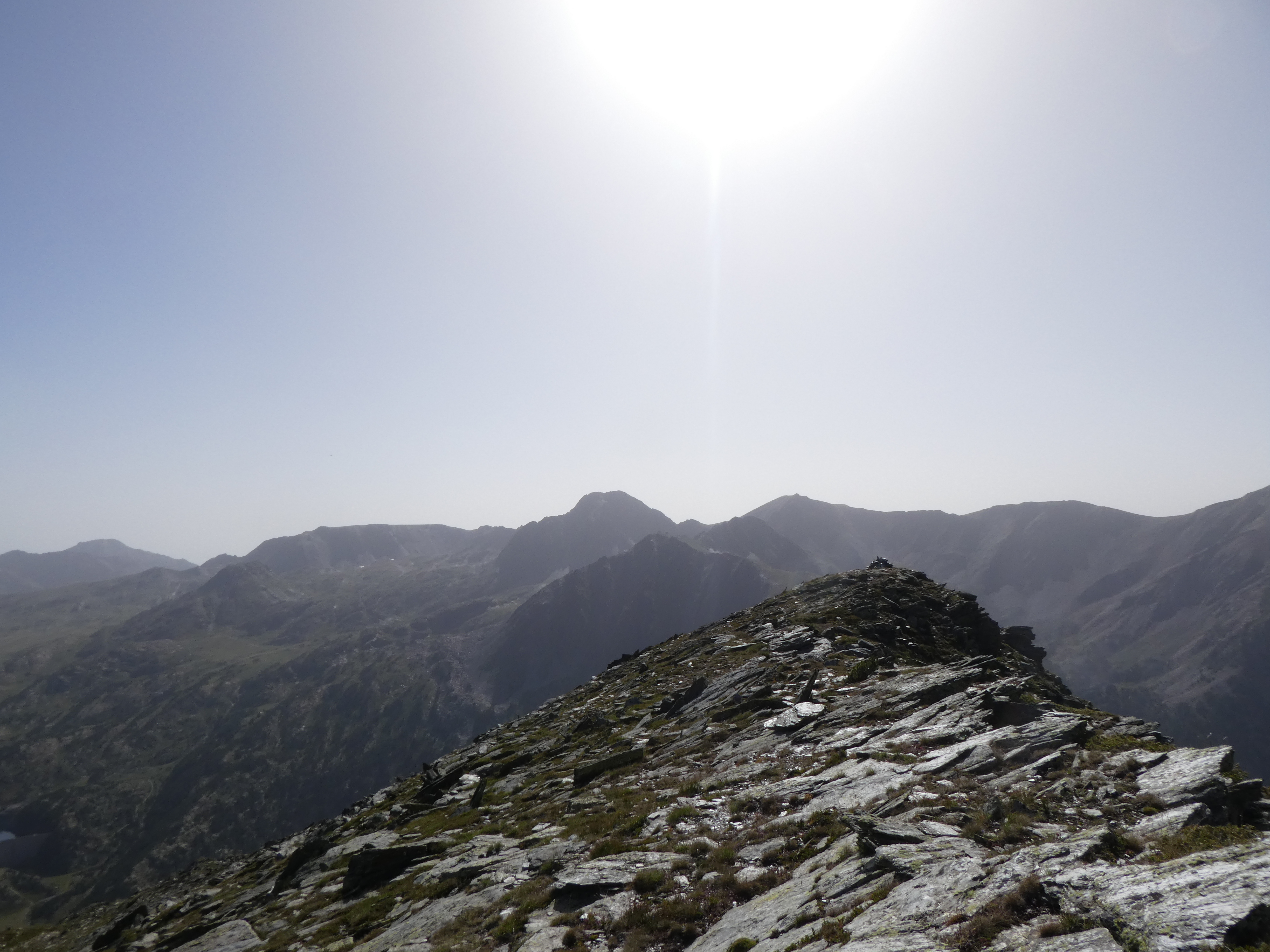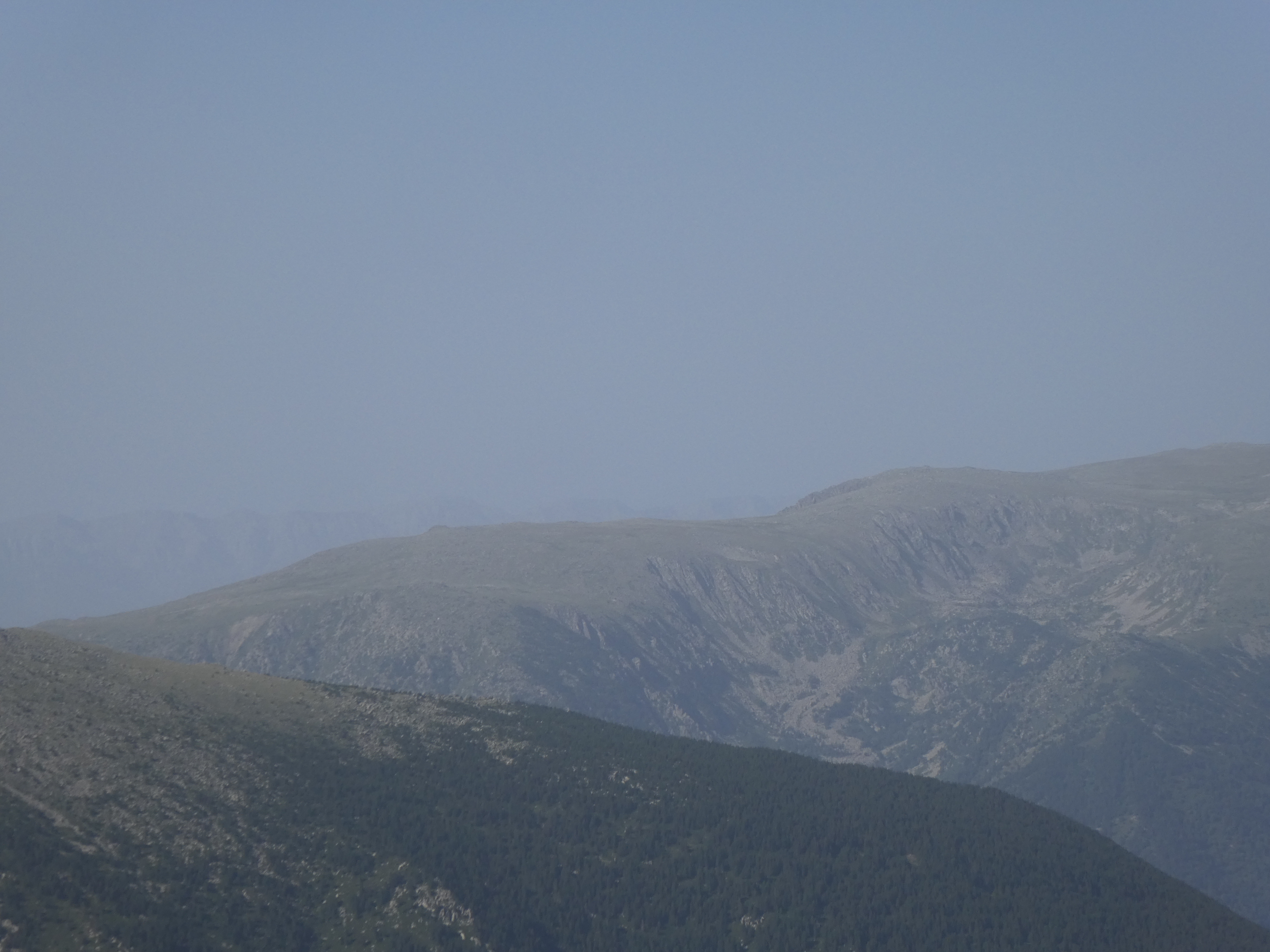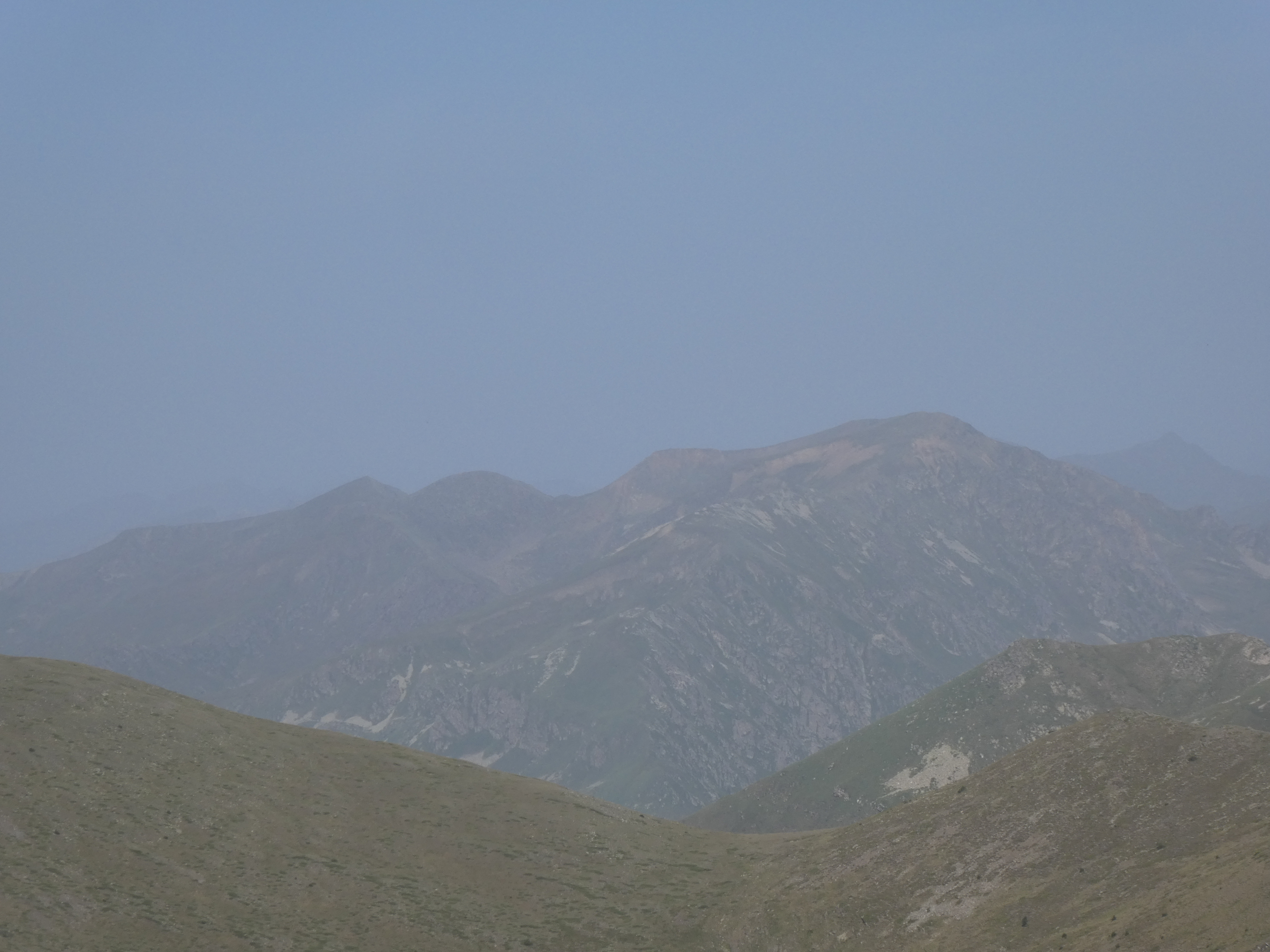 Arrivée au sommet du Puig de Font Viva (2673 m) : beau panorama malgré la présence de brume de chaleur sur les sommets de la Haute-Cerdagne, de la Réserve Naturelle d'Orlu, du Donezan, de la Serra del Cadí-Moixeró, de la Cerdanya, de l'Andorre ainsi que sur l'Estany de Lanós