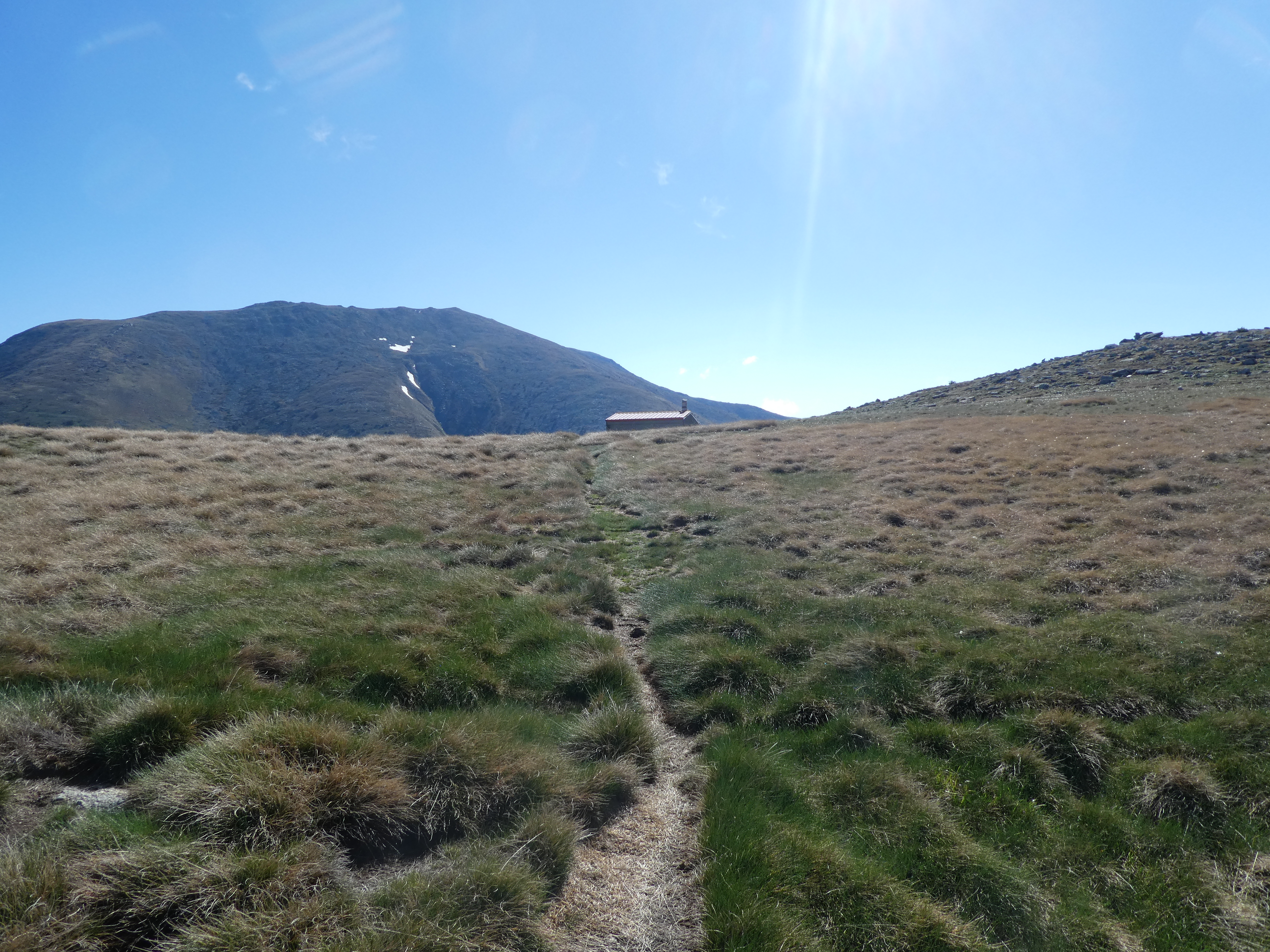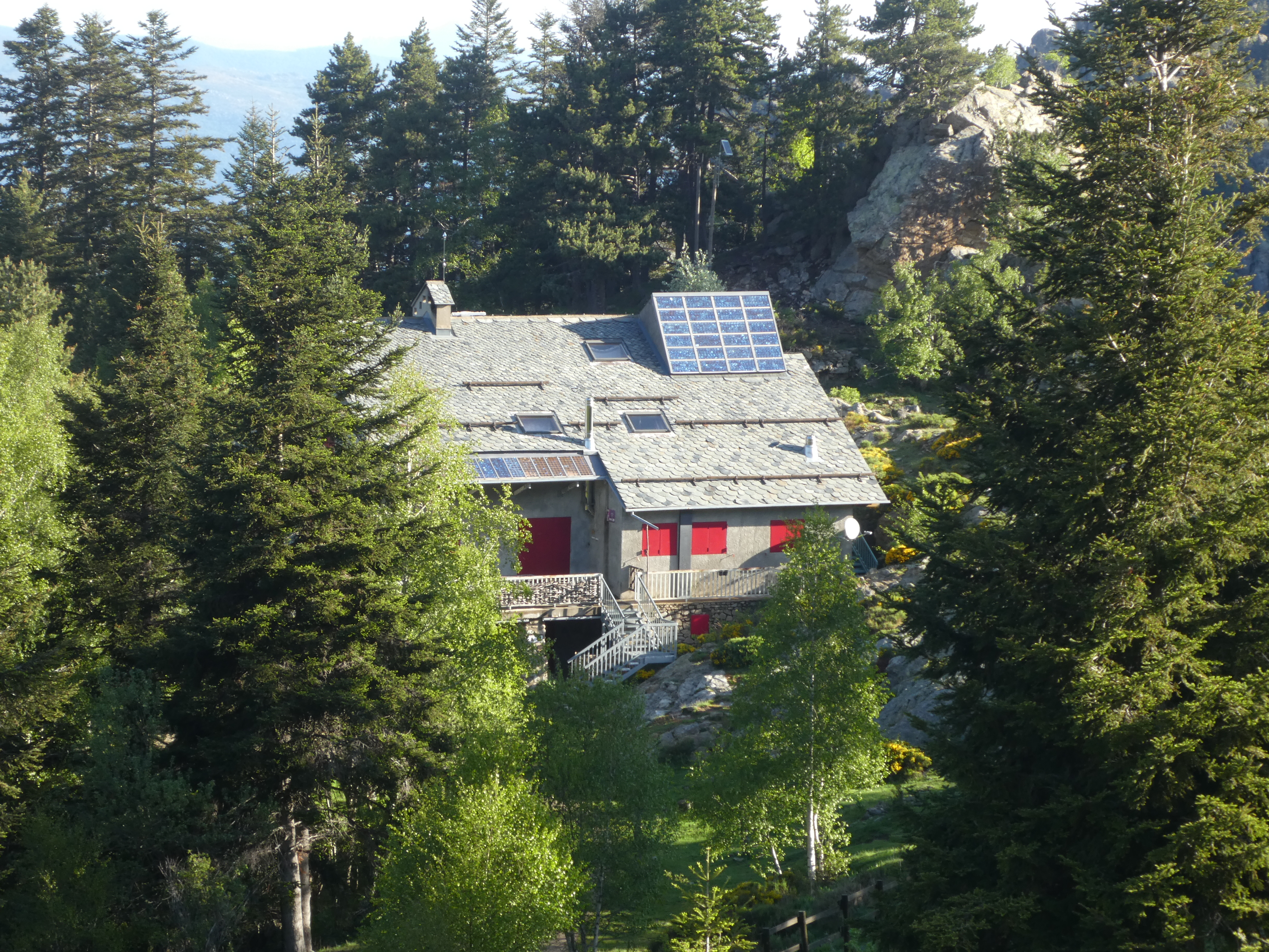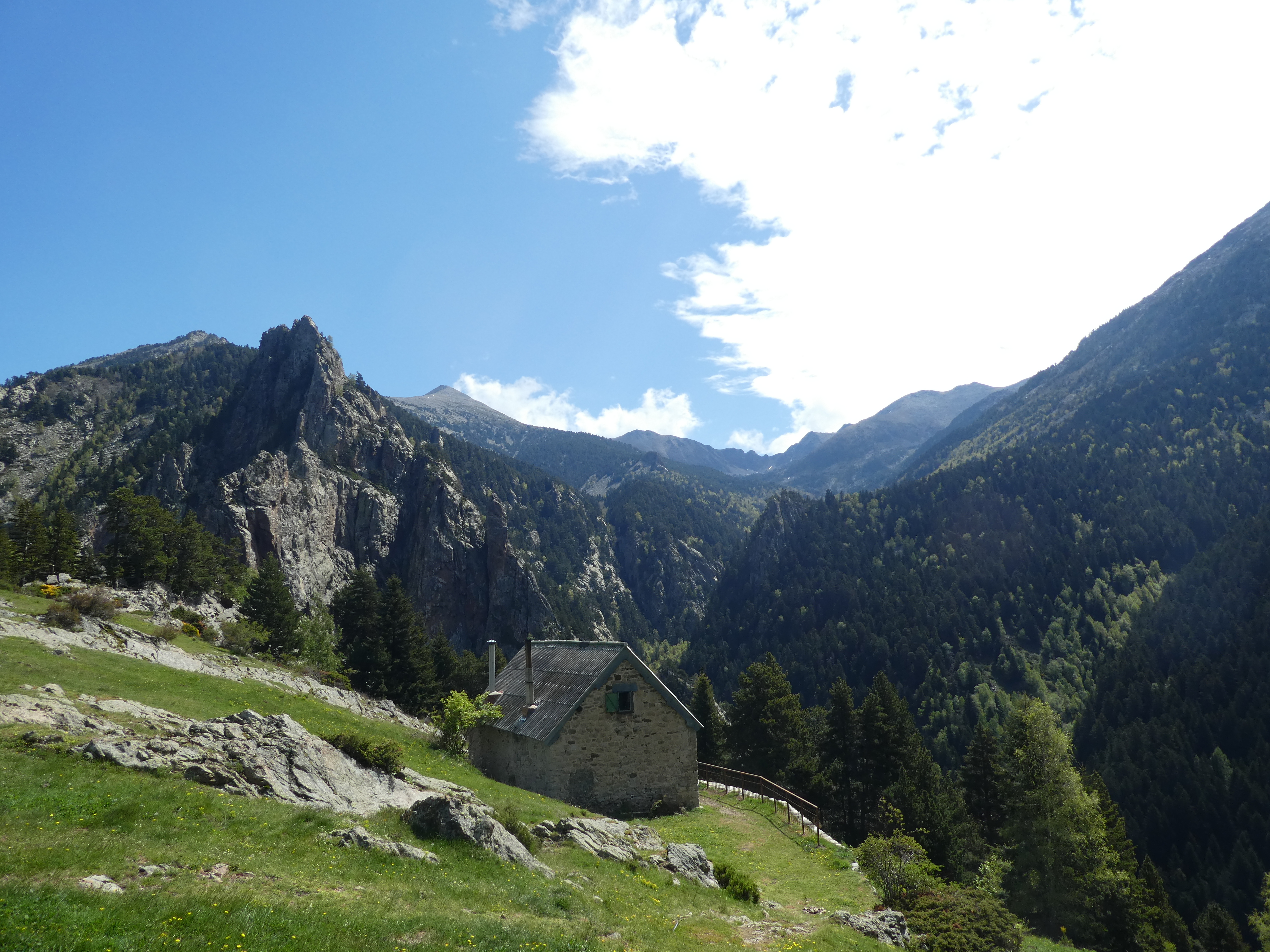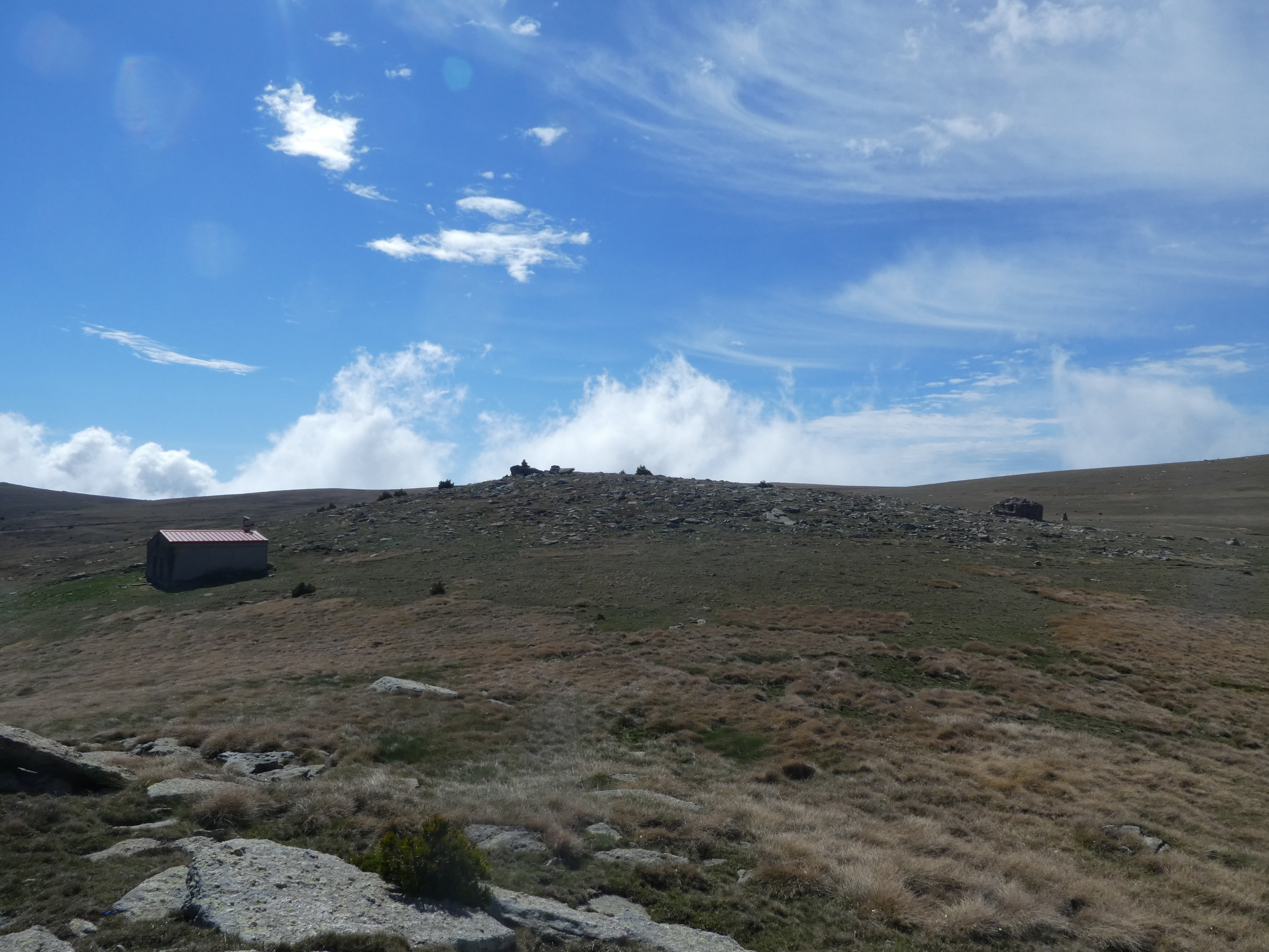 Vue arrière sur le Pla Guillem et le Refuge du Pla Guillem à gauche