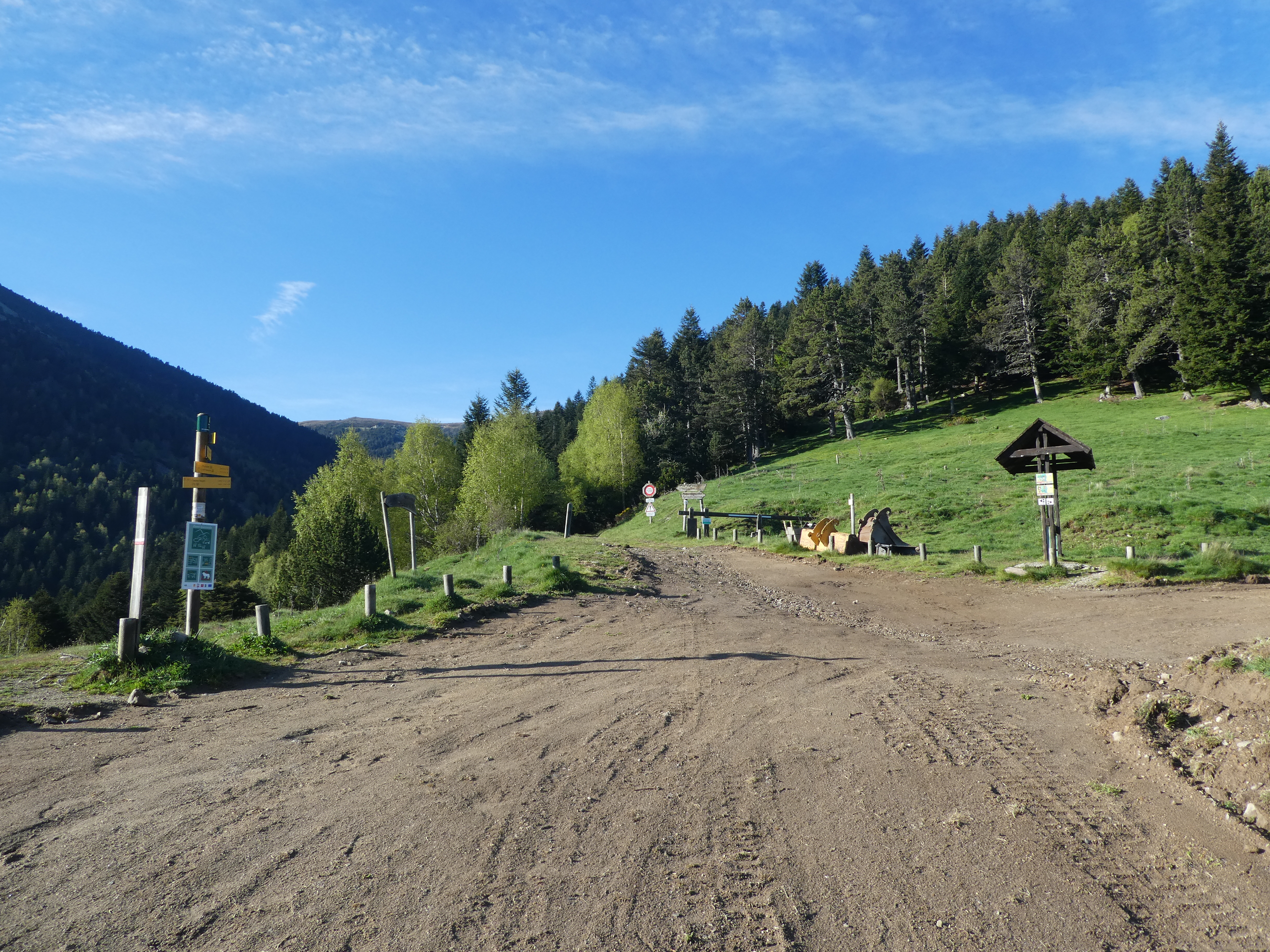 A ce croisement marqué par la présence d'un panneau directionnel au niveau du Parking du Rande (500 mètres après le précédent) (1509 m), continuer à suivre la piste de Mariailles partant tout droit direction Refuge de Mariailles