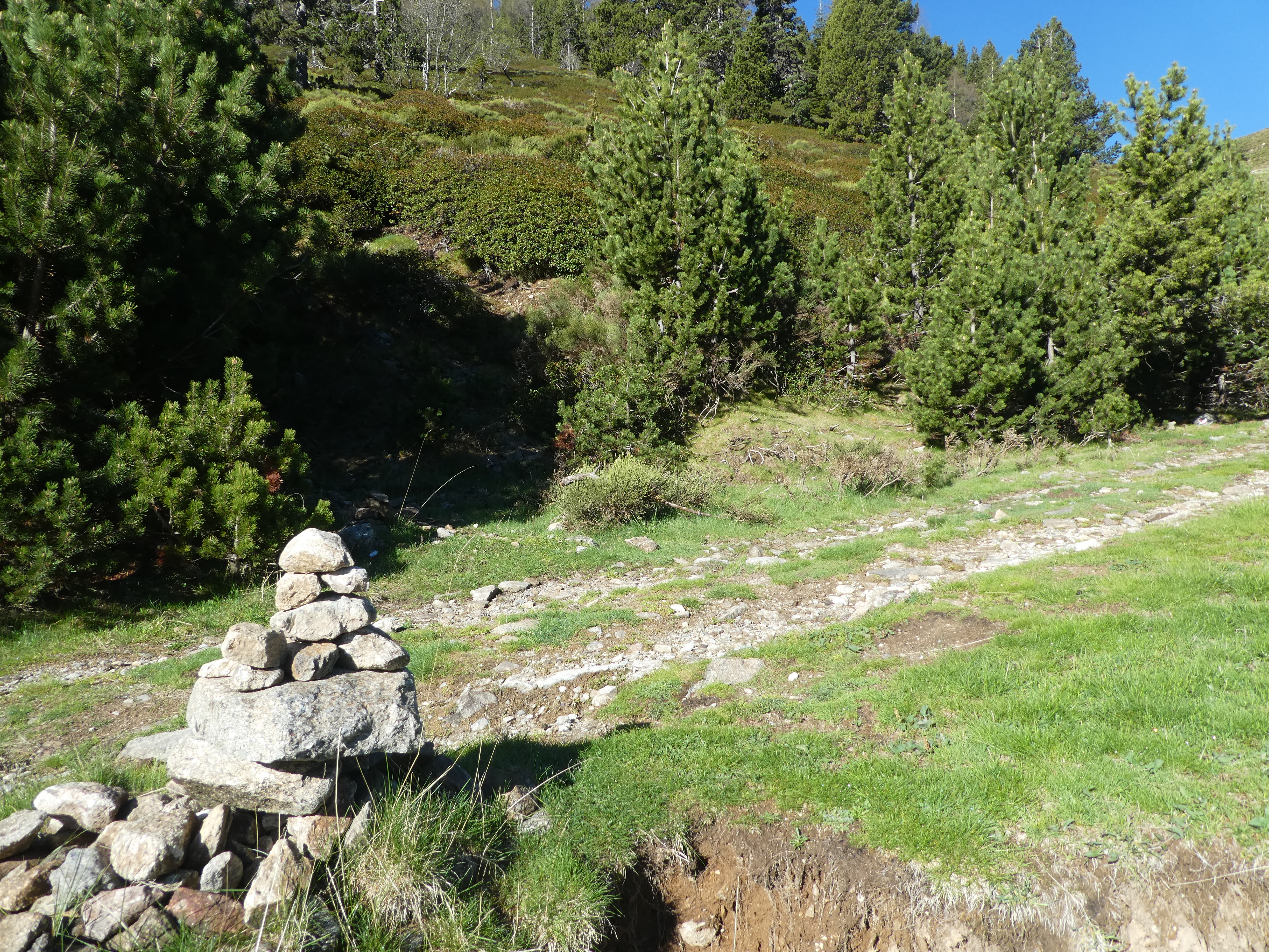 A ce croisement marqué par la présence d'un panneau directionnel (500 mètres après le précédent), quitter la piste pour suivre le chemin descendant sur la droite et menant au GR10 direction Coll de Jou